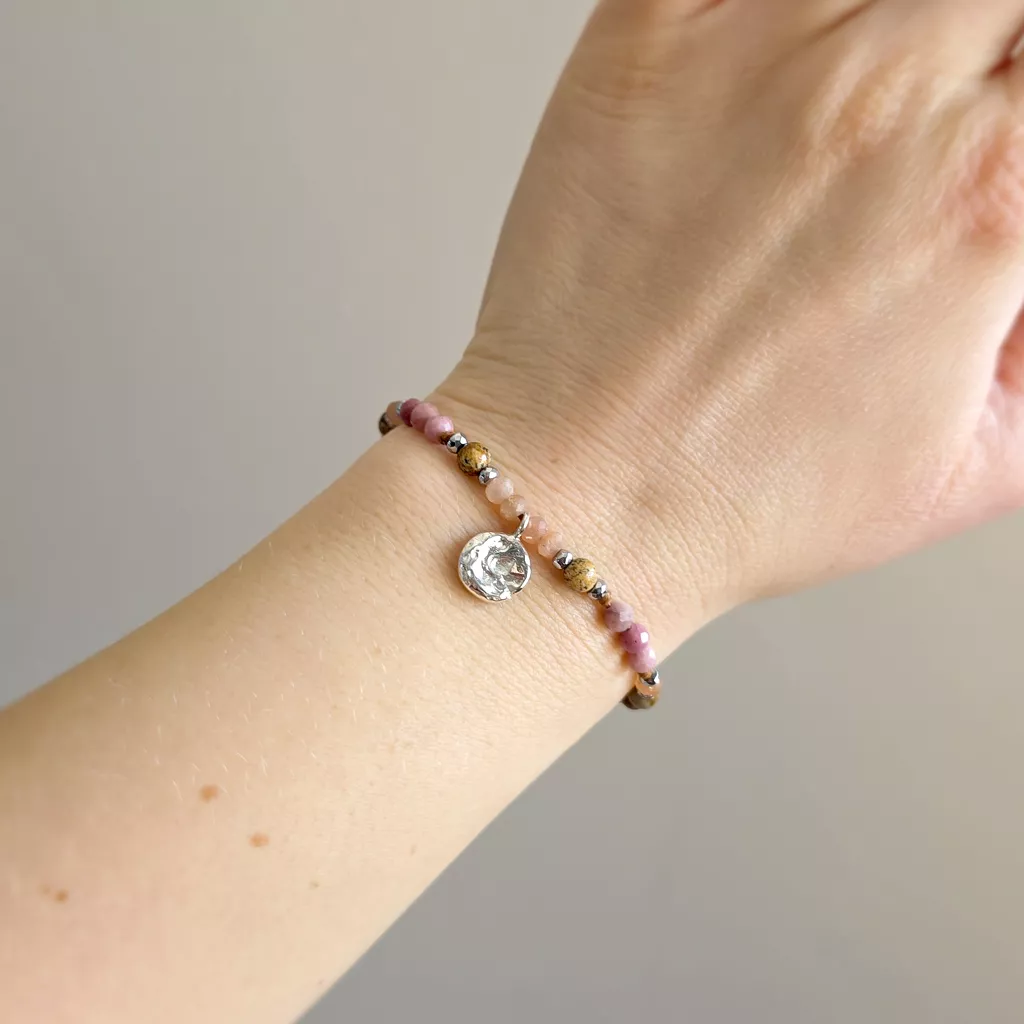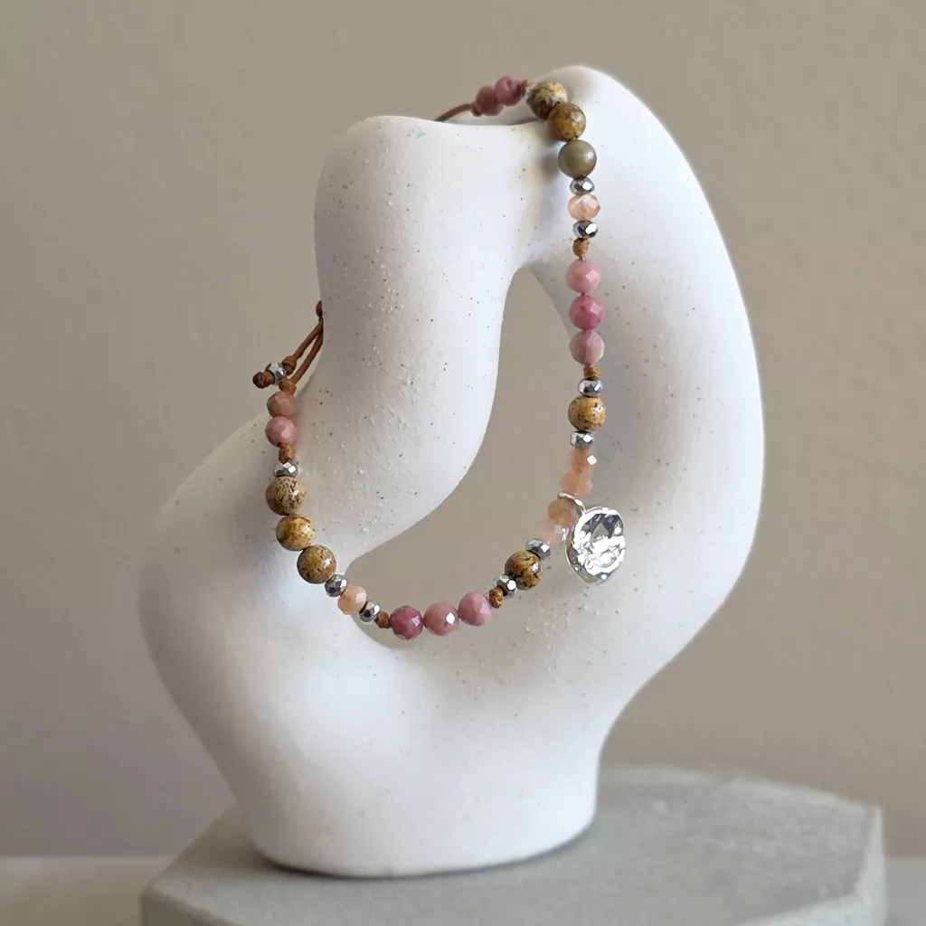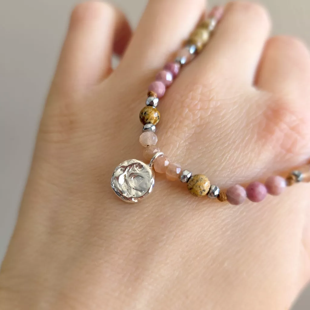 SUNSET - księżyc - bransoletka unikat kamień słoneczny, jaspis pejzażowy, rodonit, hematyt i srebro p.925