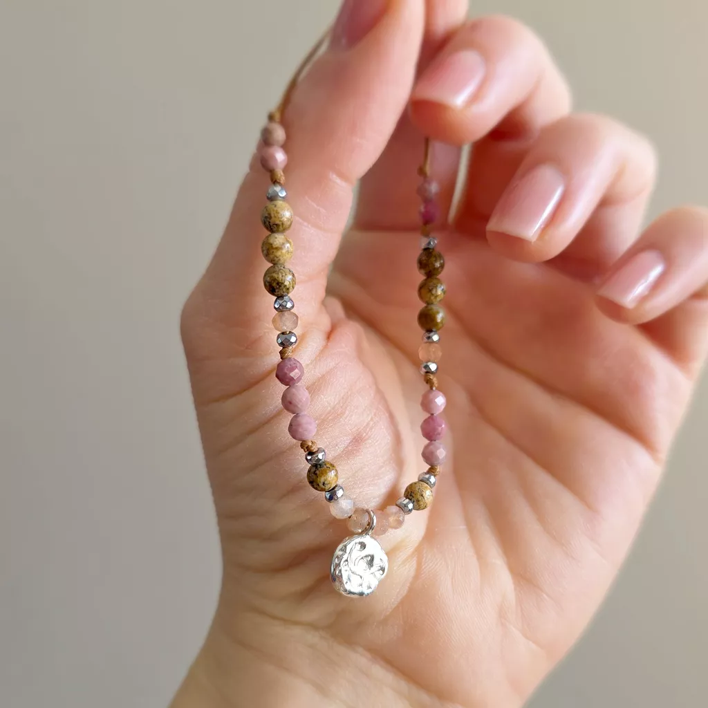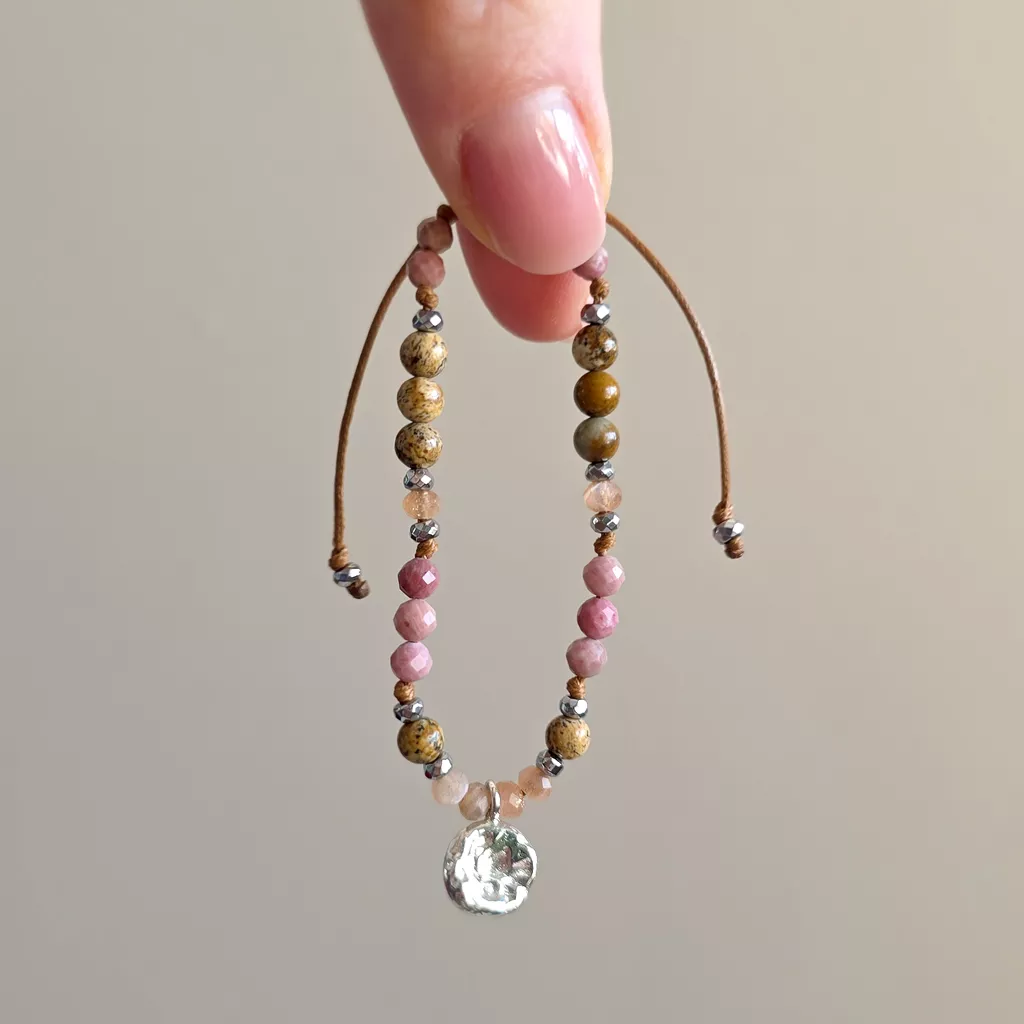 Bransoletka wykonana z kamieni naturalnych - kamienia słonecznego, jaspisu pejzażowego, rodonitu i hematytu oraz zawieszki w kształcie księżyca (srebro p.925). Bazą biżuterii jest mocny, poliestrowy sznurek w kolorze brązowym.