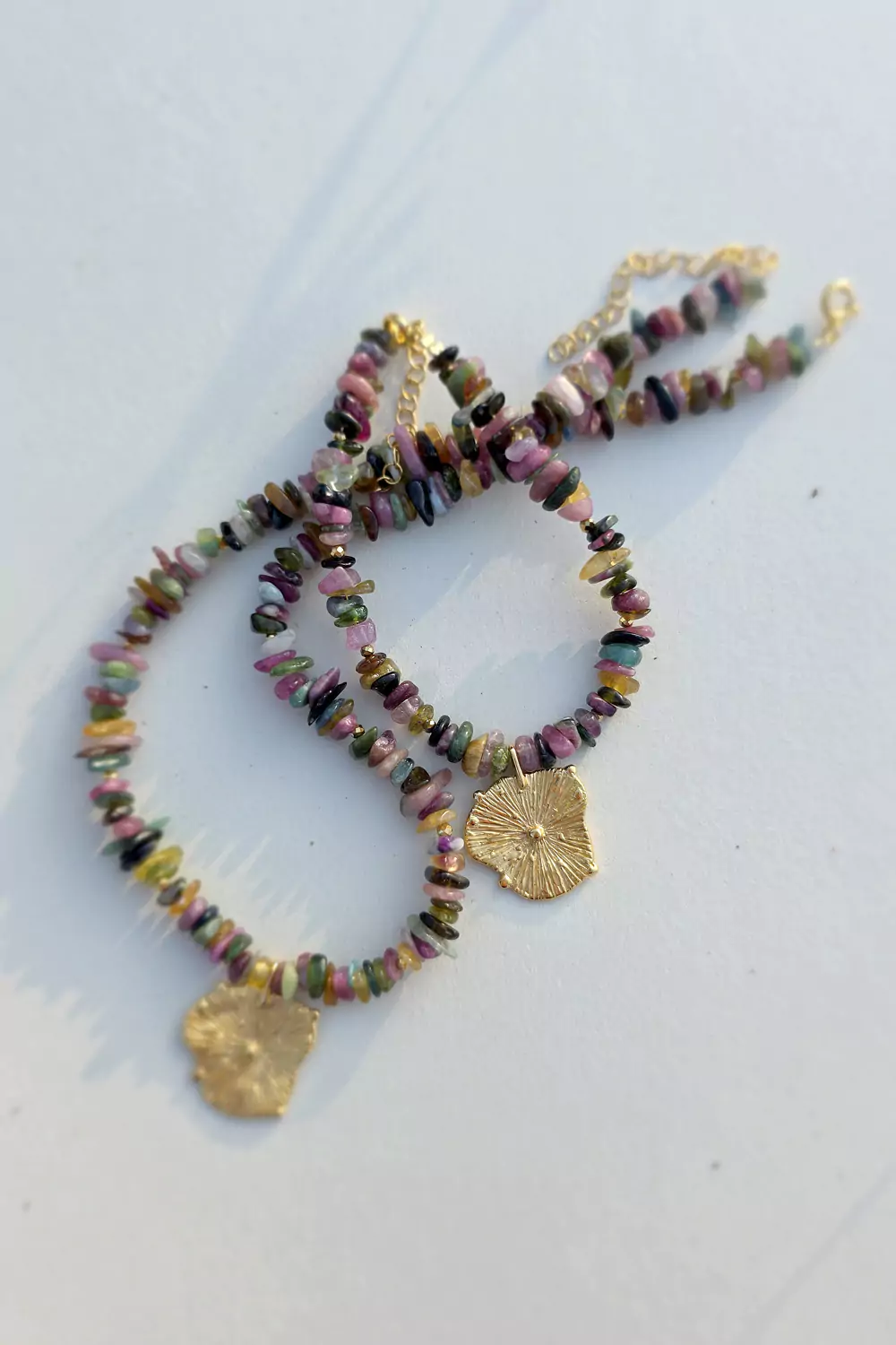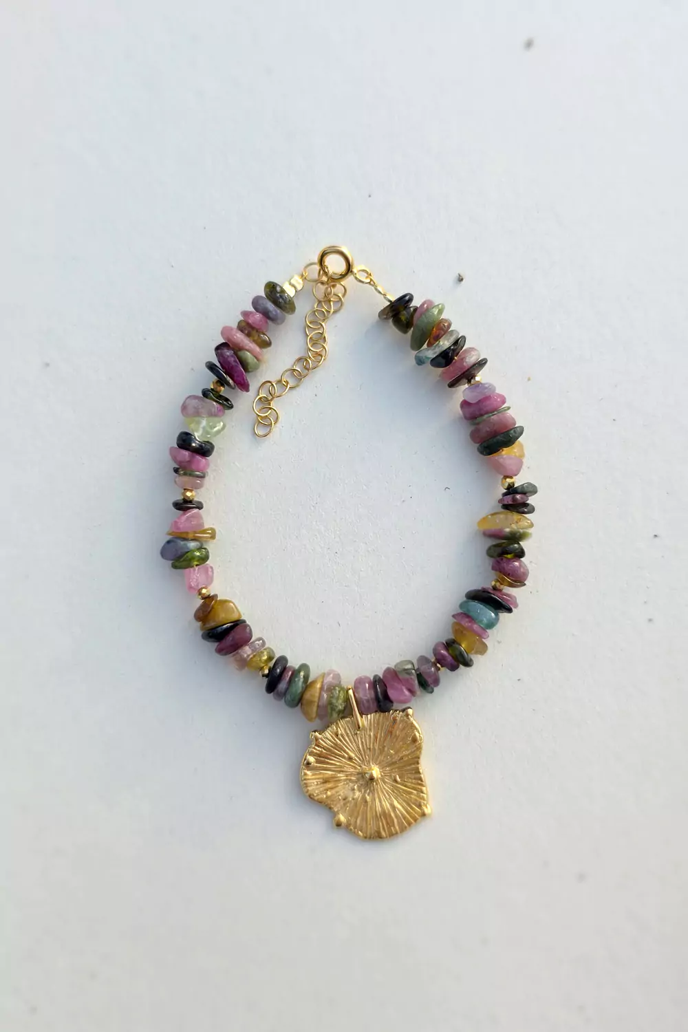 Bransoletka wykonana z kamieni naturalnych - kolorowego turmalinu oraz zawieszki w kształcie słońca (pozłacane srebro p.925). Bazą biżuterii jest klasyczna linka jubilerska.