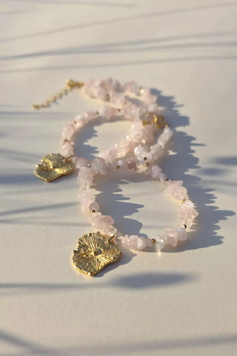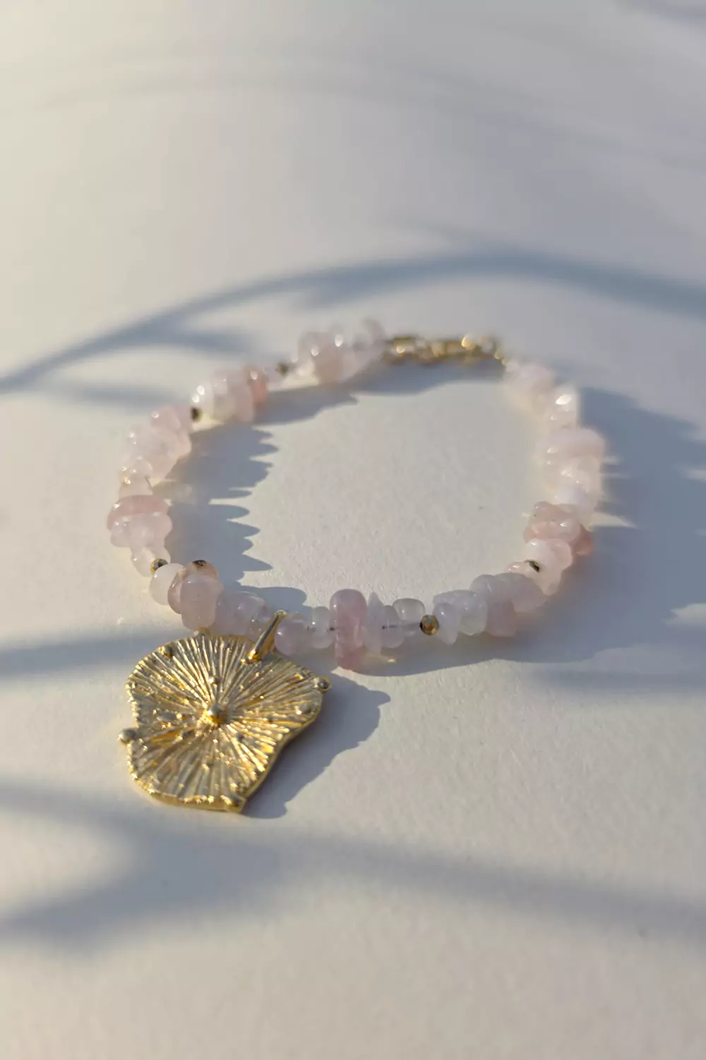 Bransoletka wykonana z kamieni naturalnych - kwarcu różowego oraz zawieszki w kształcie słońca (pozłacane srebro p.925). Bazą biżuterii jest klasyczna linka jubilerska.