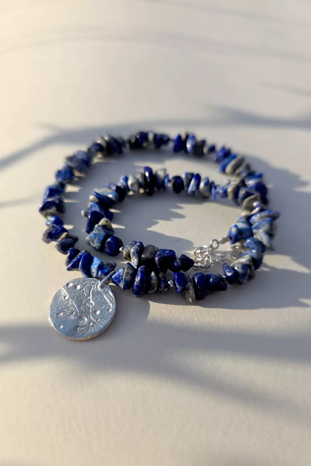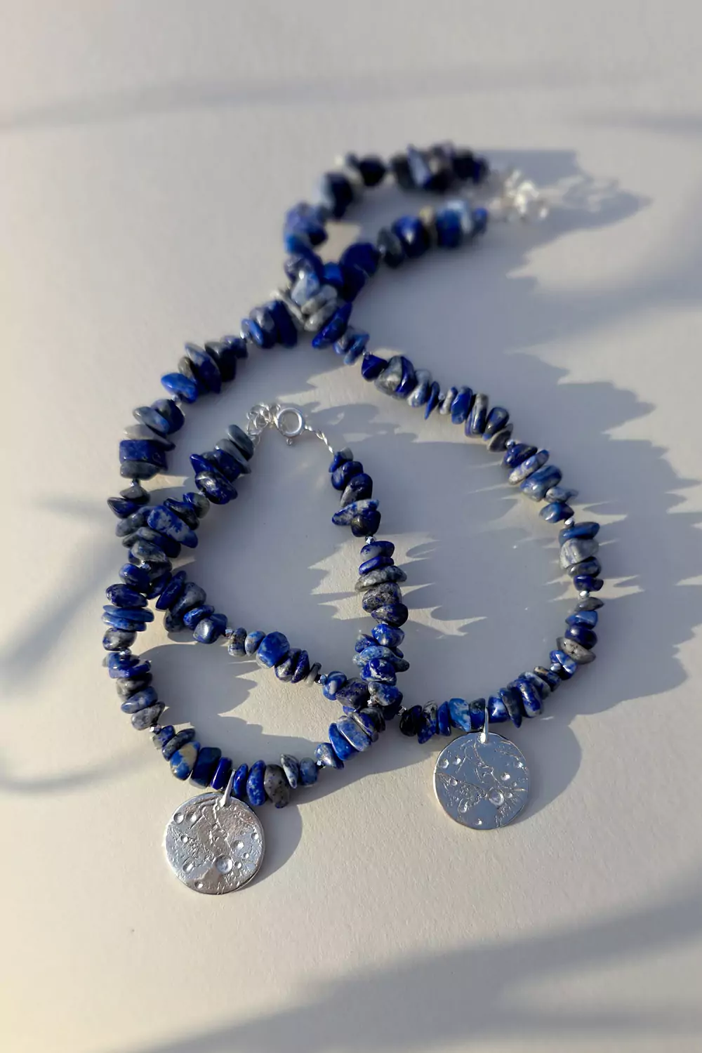 Naszyjnik wykonany z kamieni naturalnych - lapisu lazuli oraz zawieszki w kształcie księżyca (srebro p.925). Bazą biżuterii jest klasyczna linka jubilerska.