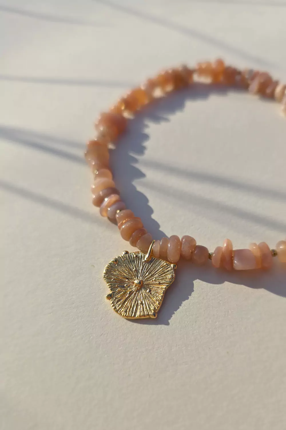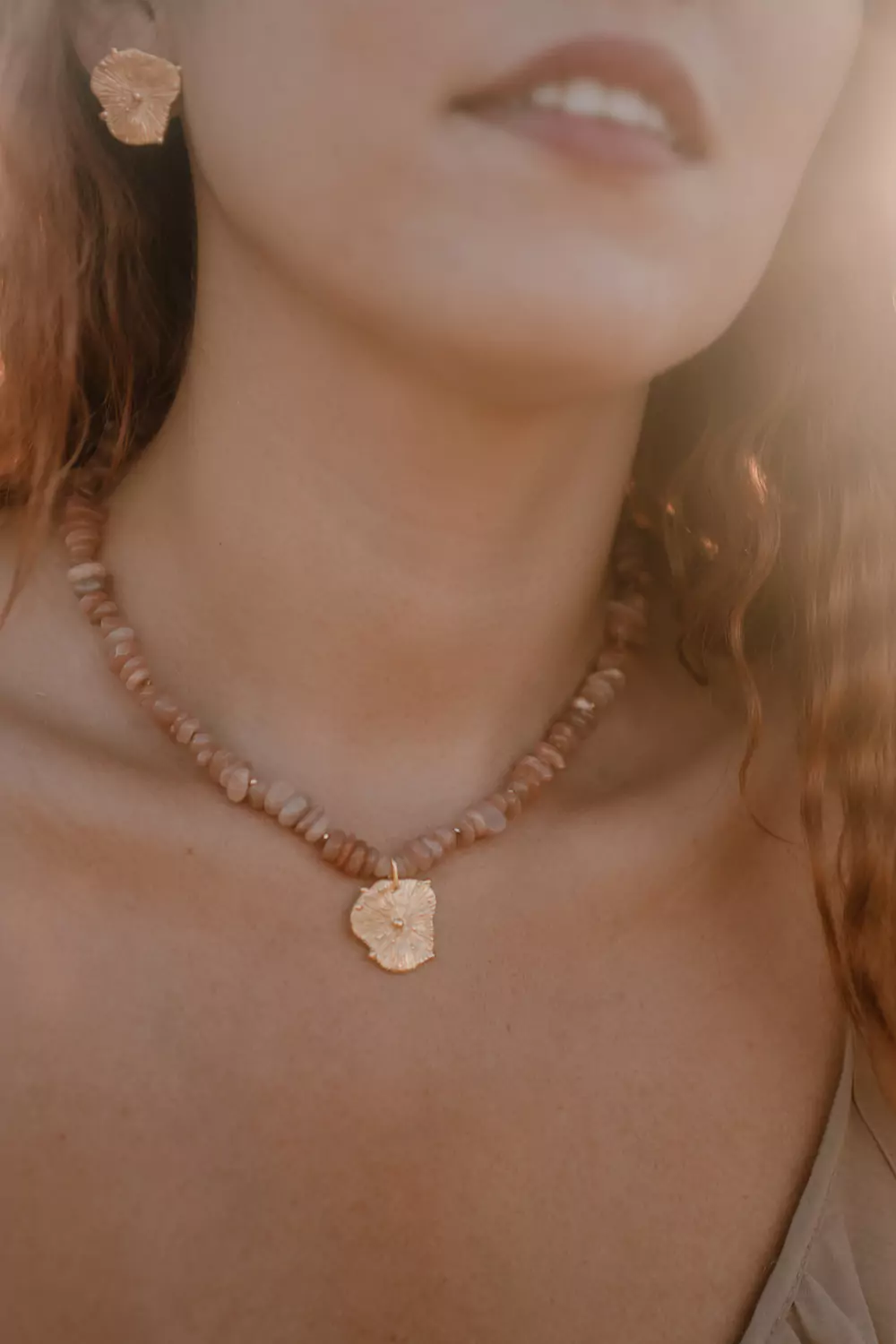 Naszyjnik wykonany z kamieni naturalnych - kamienia słonecznego oraz zawieszki w kształcie słońca (pozłacane srebro p.925). Bazą biżuterii jest klasyczna linka jubilerska.