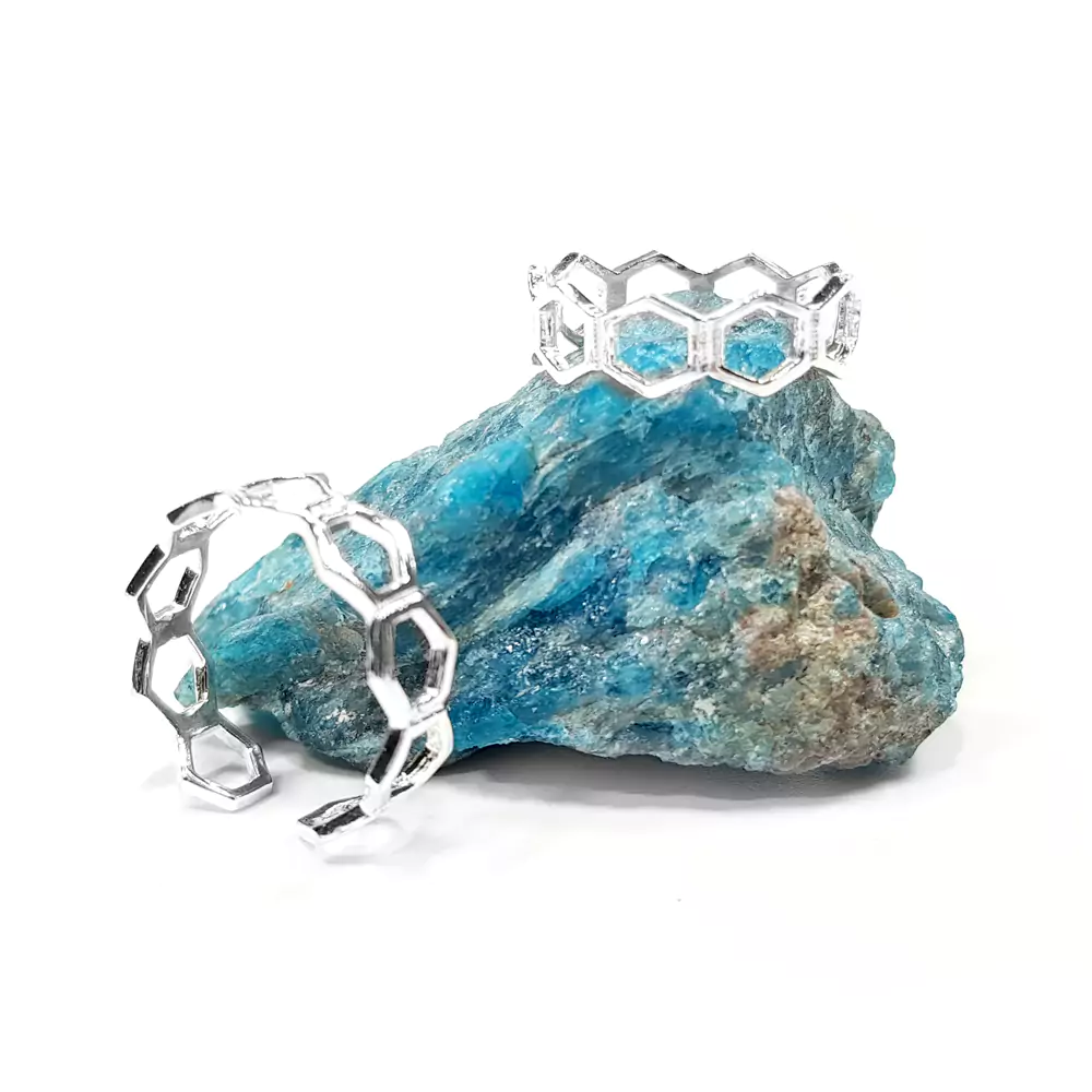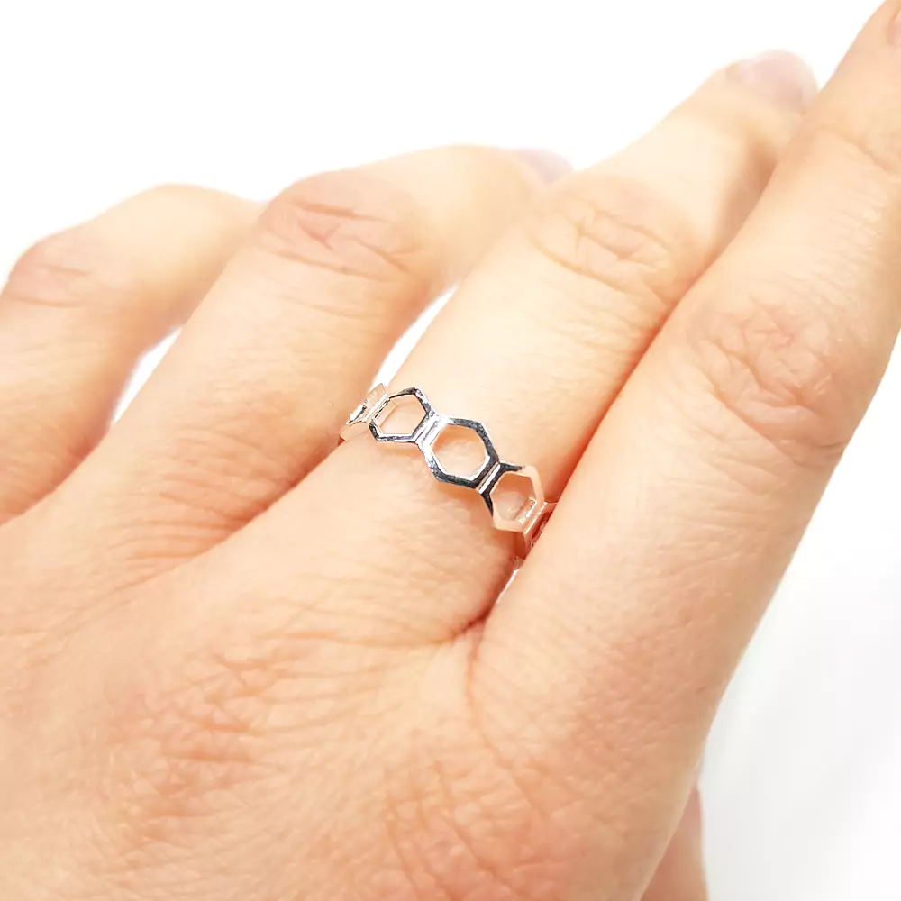 Pierścionek wykonany ze srebra p.925, w kształcie połączonych ze sobą heksagonów.