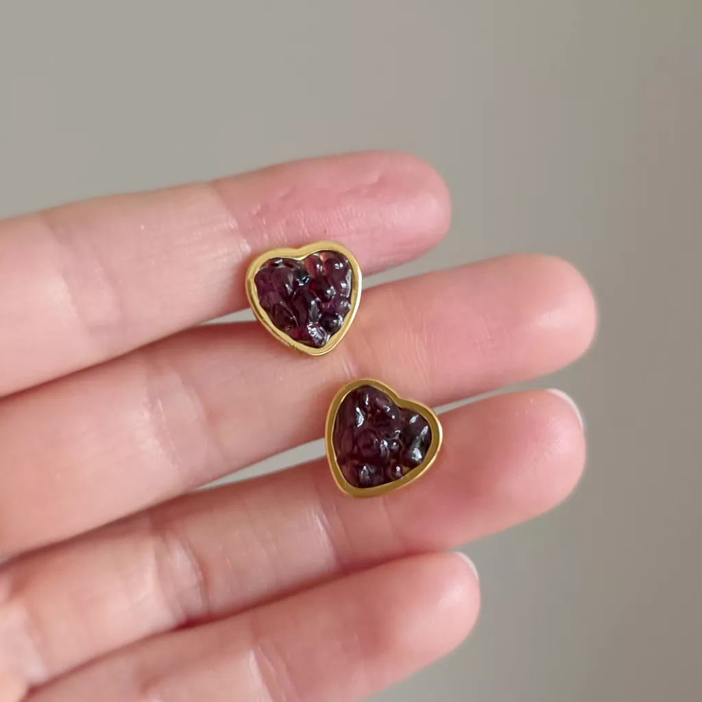 Kolczyki sztyfty granat w żywicy serca szeroki rant złota stal chirurgiczna Sparkles garnet