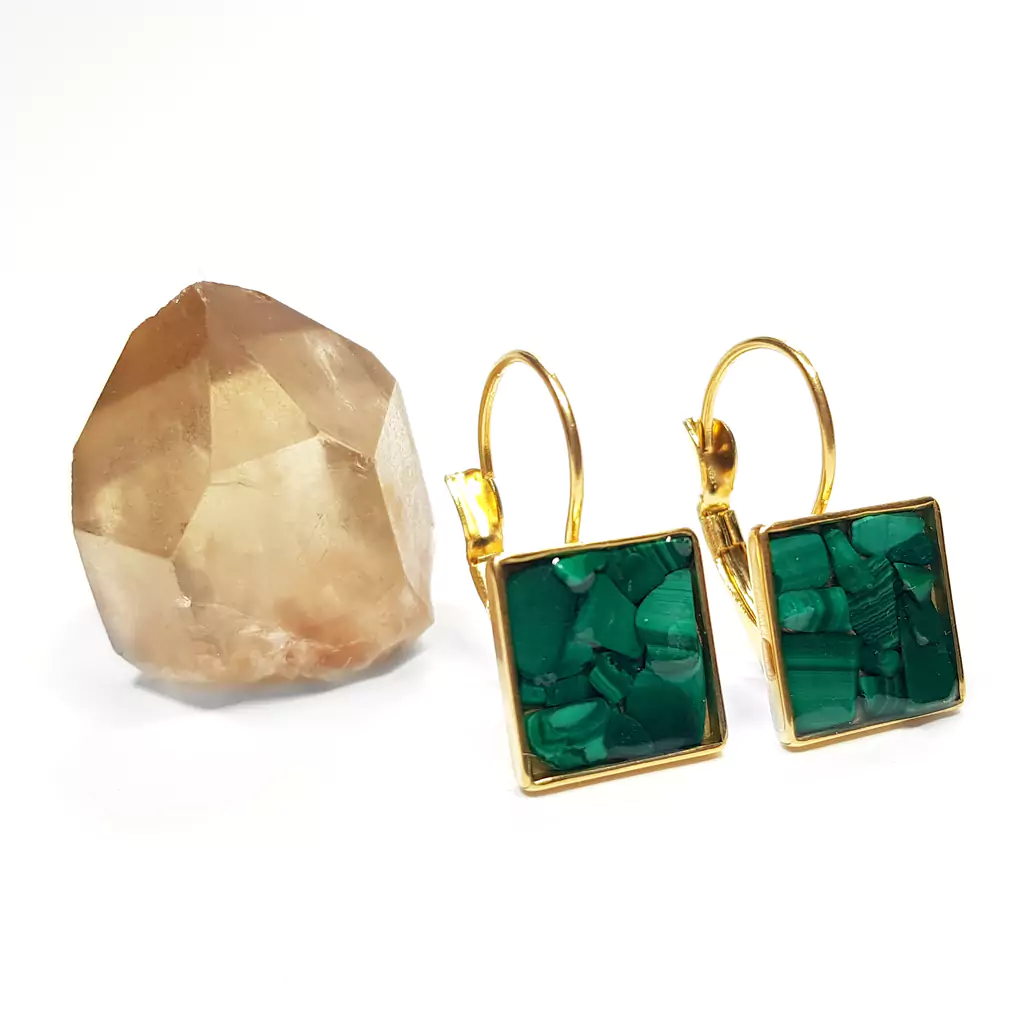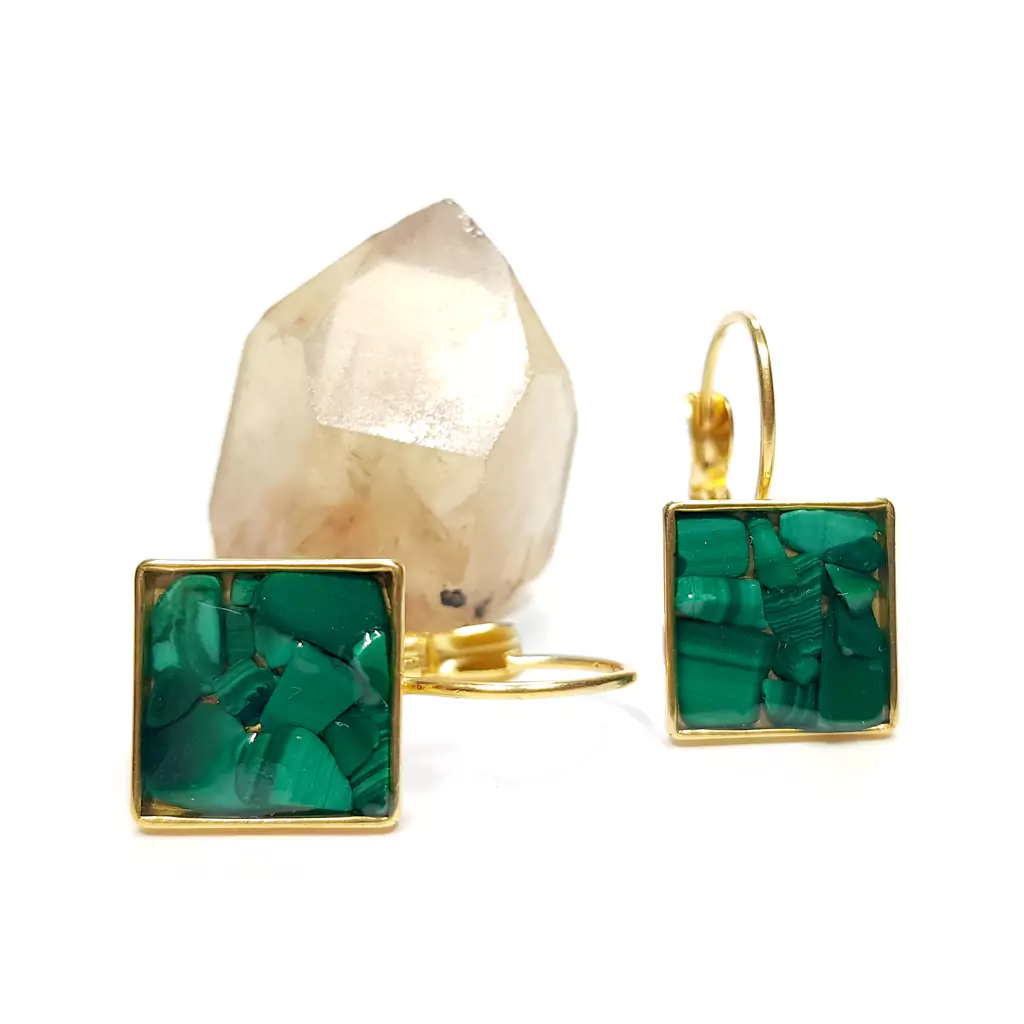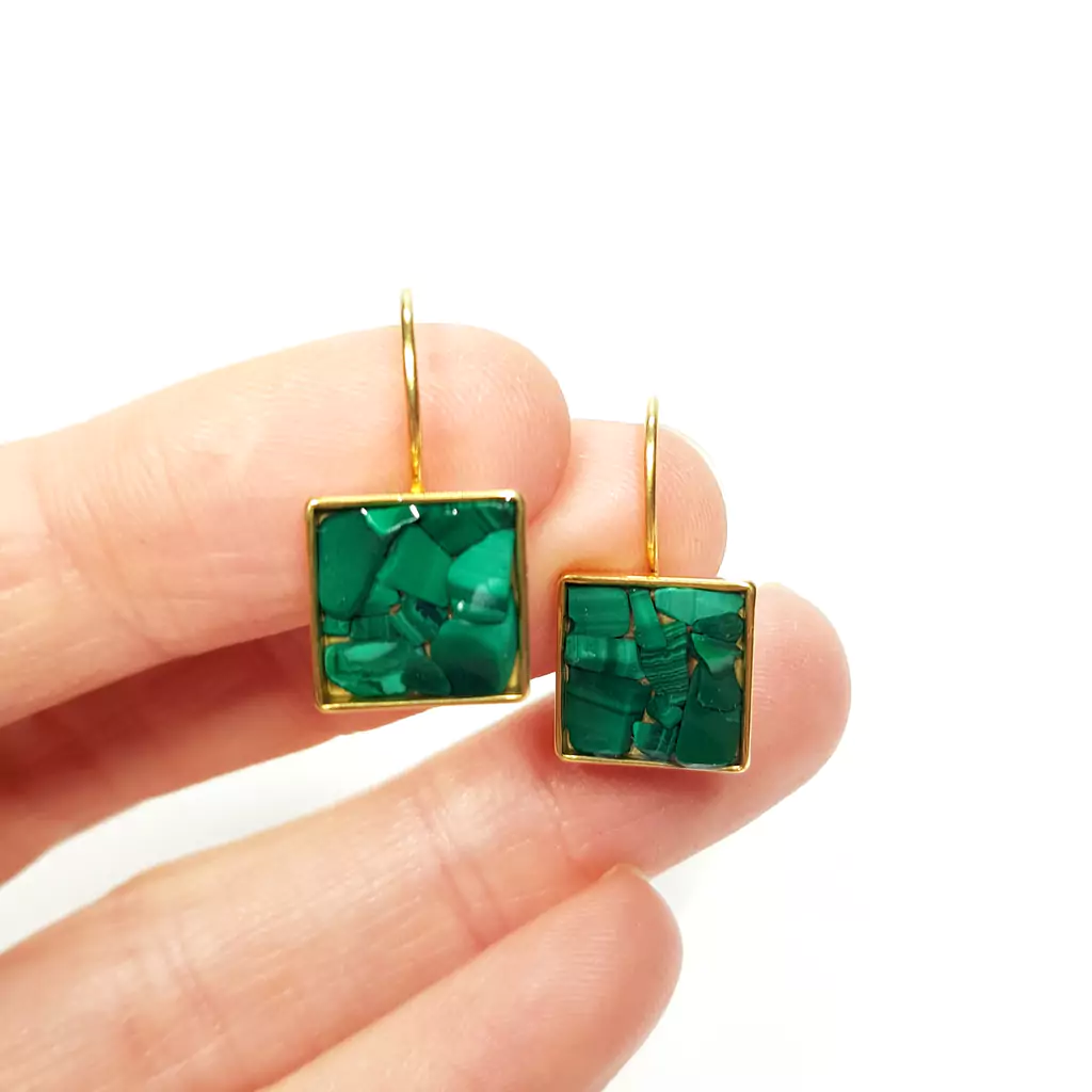 Kolczyki sztyfty kwadraty malachit w żywicy złota stal chirurgiczna Sparkles malachite