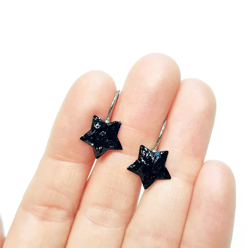 Kolczyki wiszące gwiazdki czarny turmalin w żywicy stal chirurgiczna Sparkles black v.2