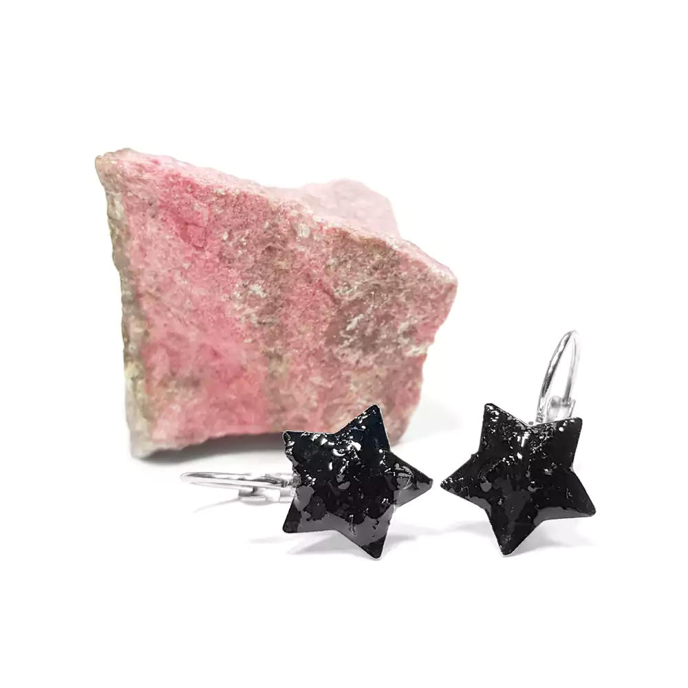 Kolczyki wykonane ręcznie z metalowych baz ze stali chirurgicznej w kształcie gwiazdek oraz drobnych bryłek czarnego turmalinu zatopionych w żywicy jubilerskiej.