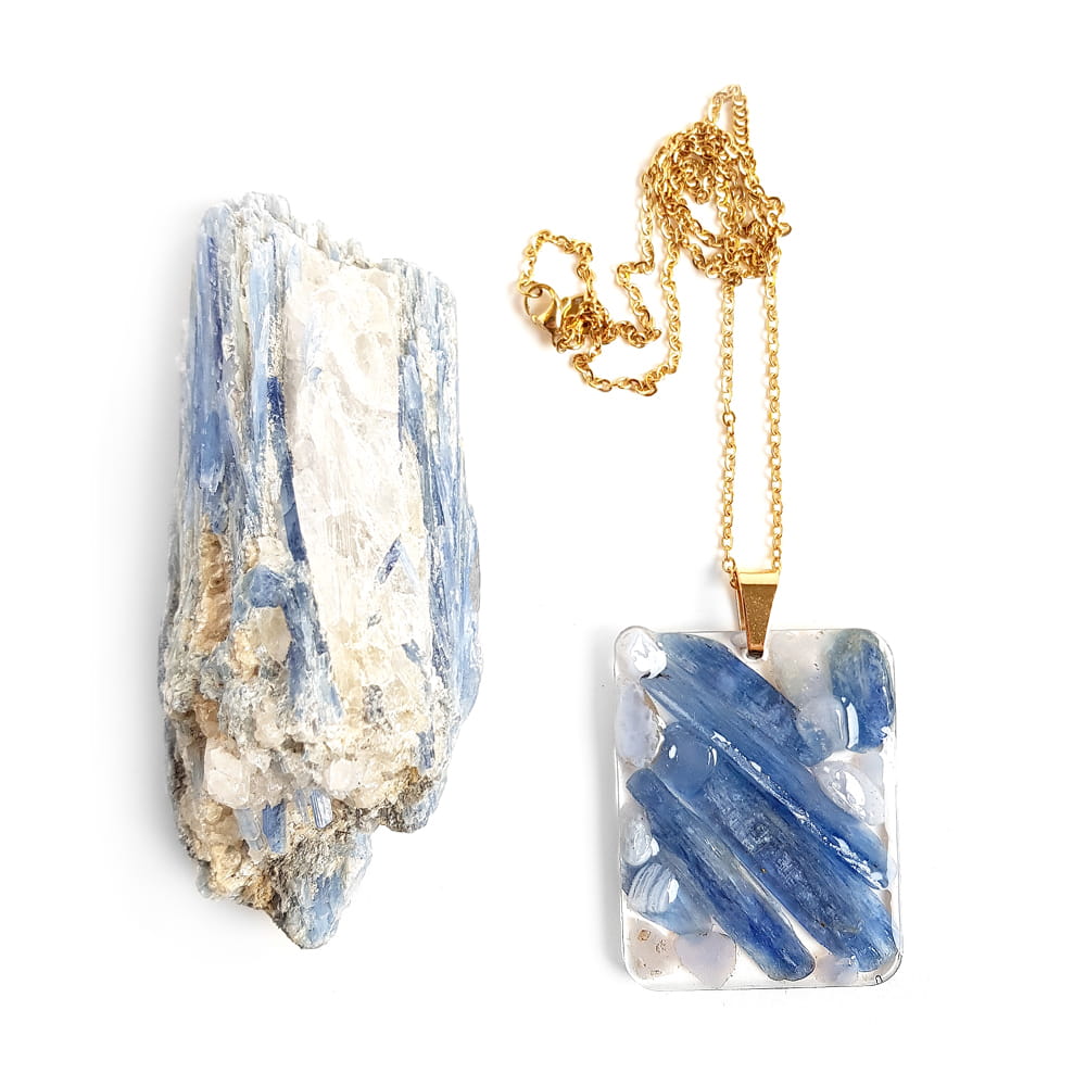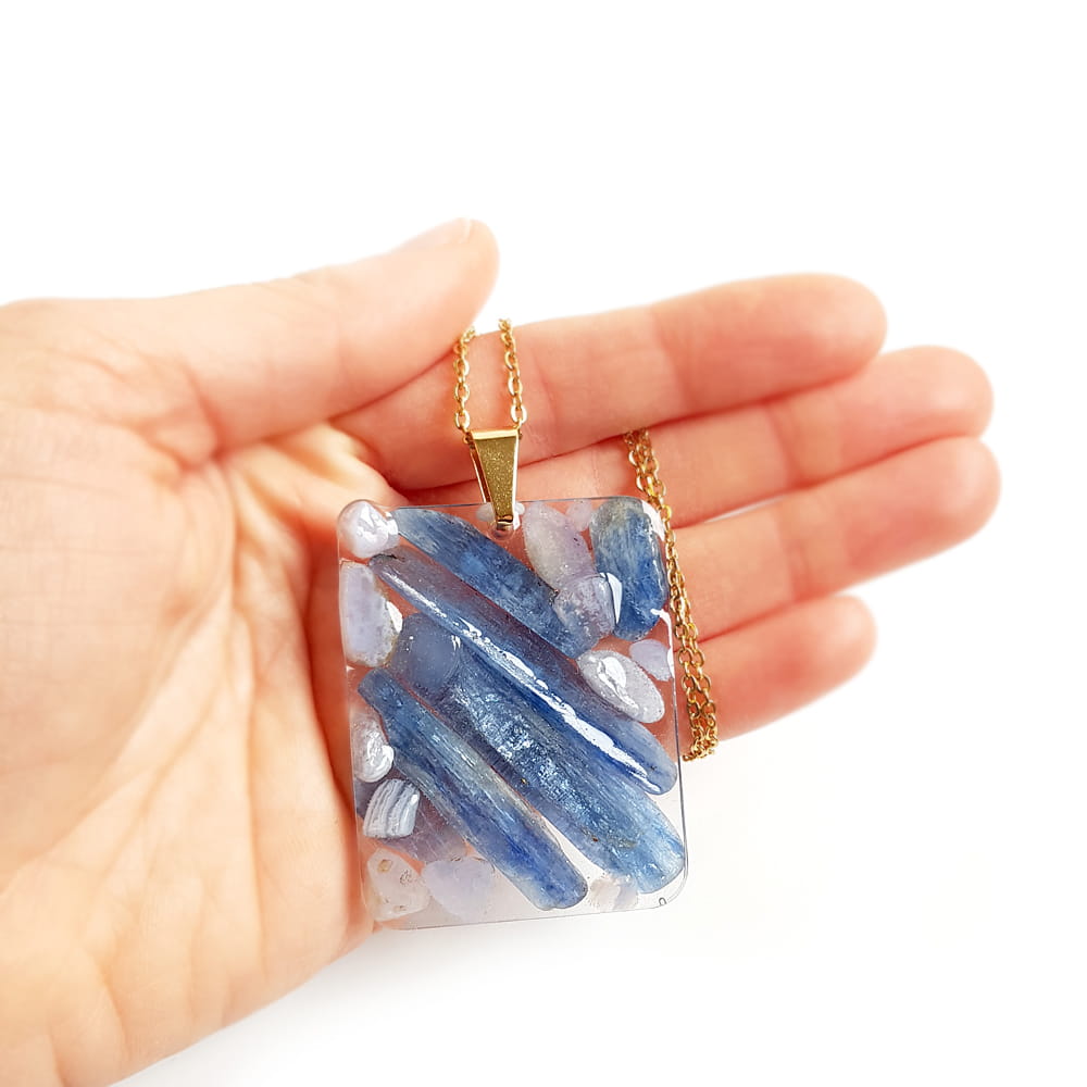 Naszyjnik wykonany z bryłek niebieskiego kyanitu i niebieskiego agatu koronkowego zatopionych w żywicy jubilerskiej oraz elementów metalowych ze stali chirurgicznej.