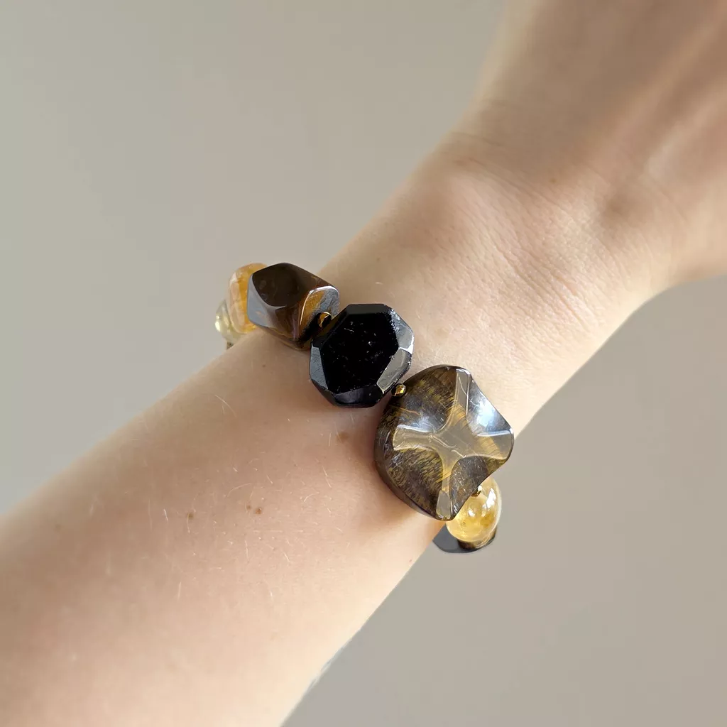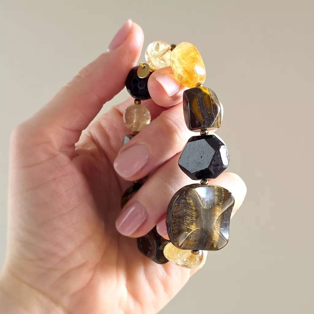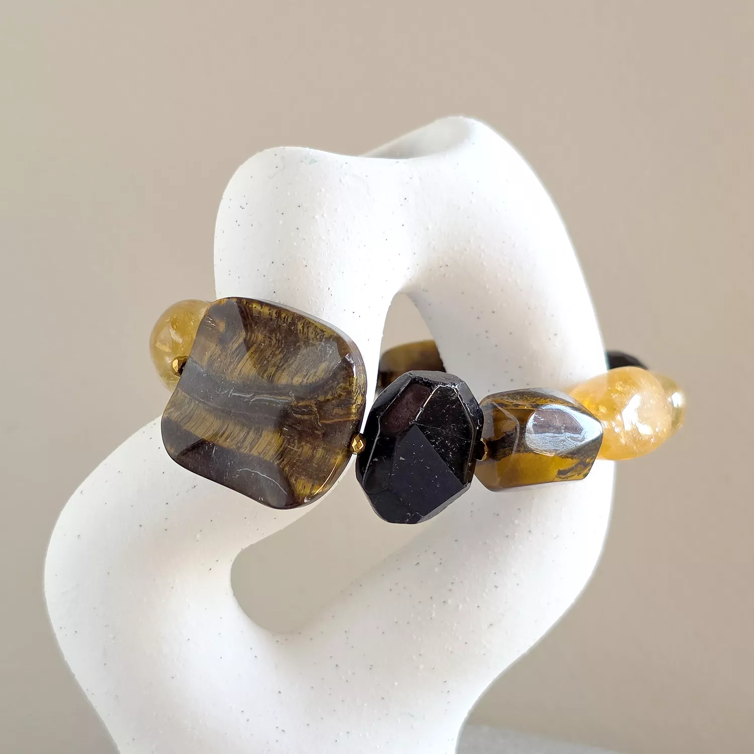 Bohemian bransoletka unikat cytryn, tygrysie oko, czarny turmalin i hematyt