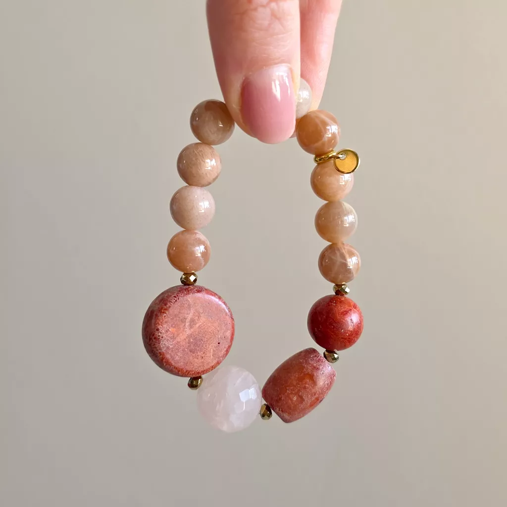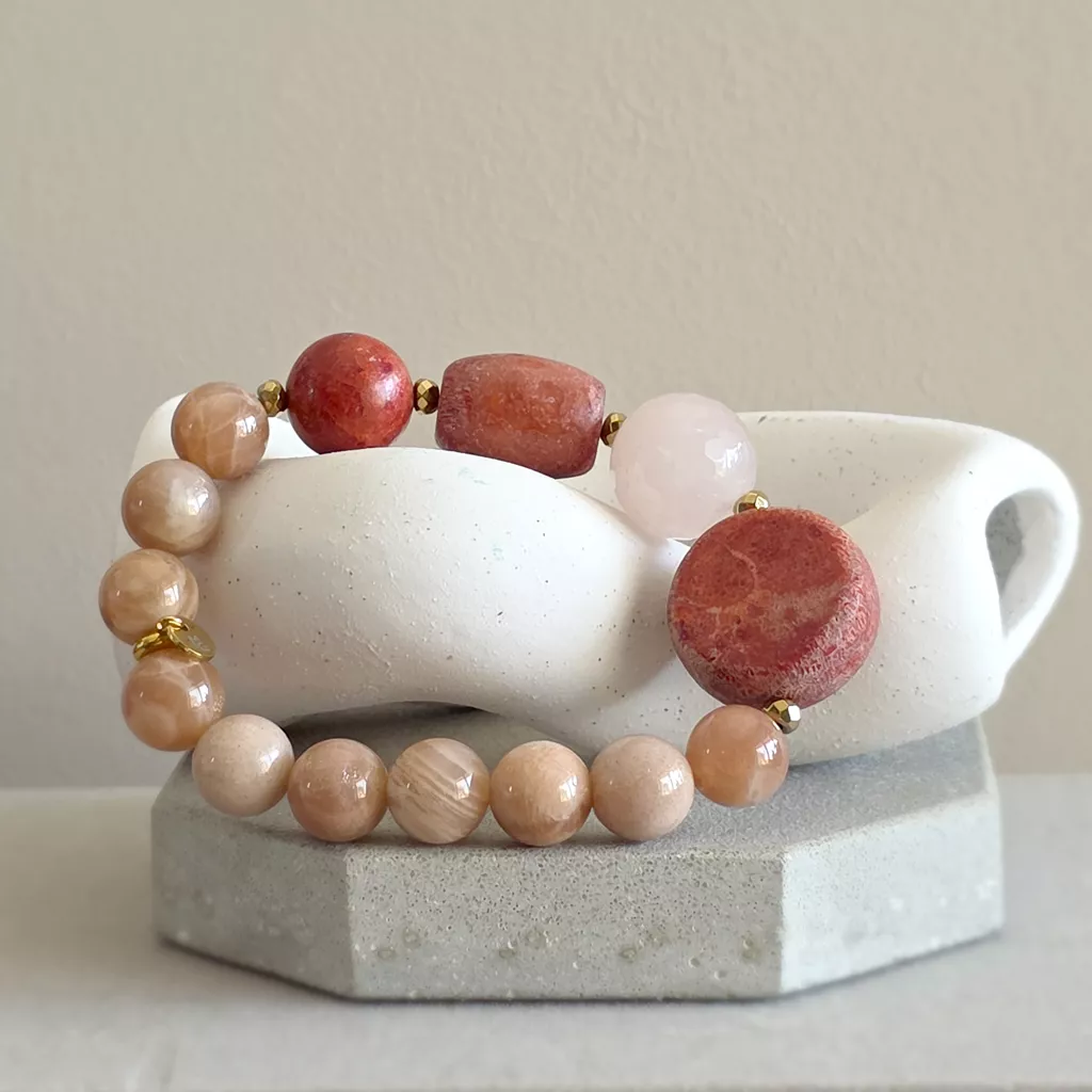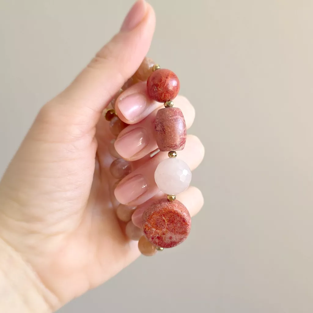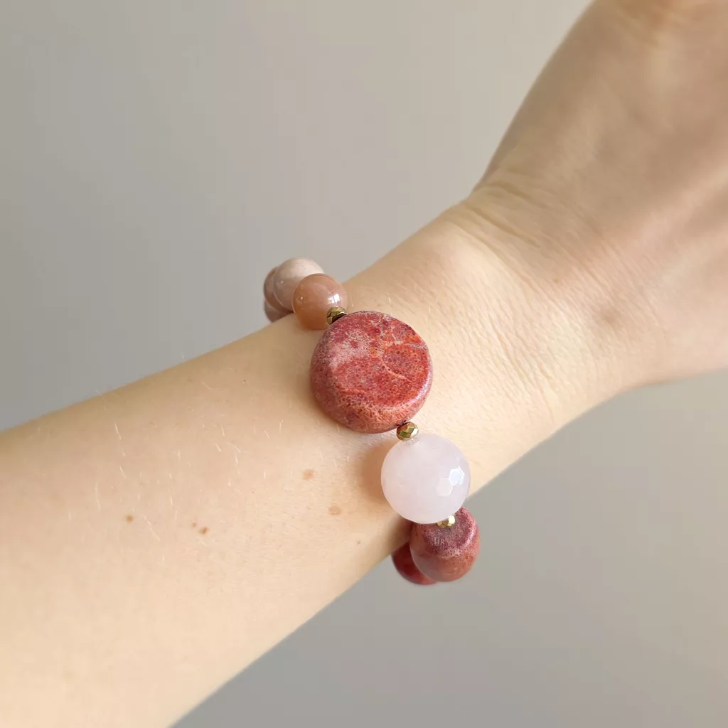 Bohemian bransoletka unikat koral, kwarc różowy, kamień słoneczny i hematyt