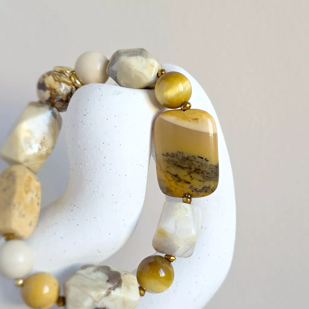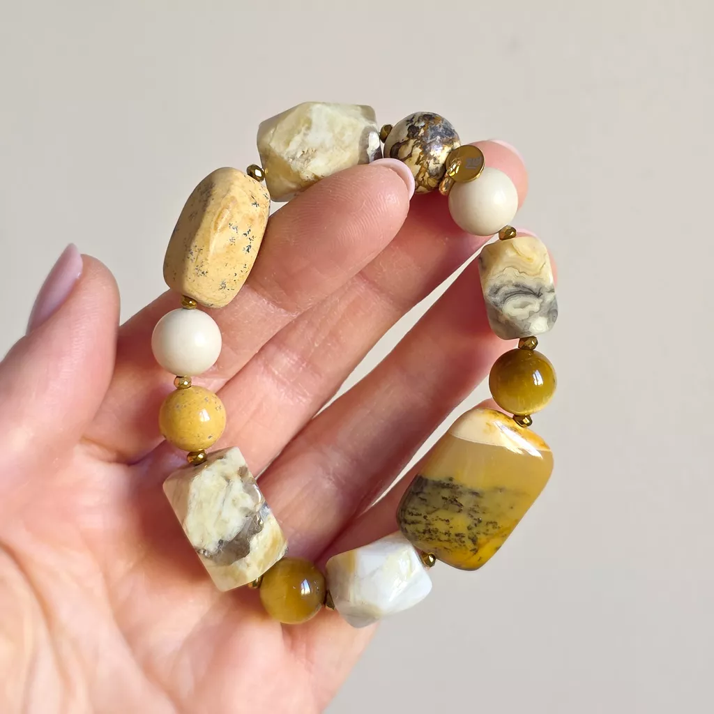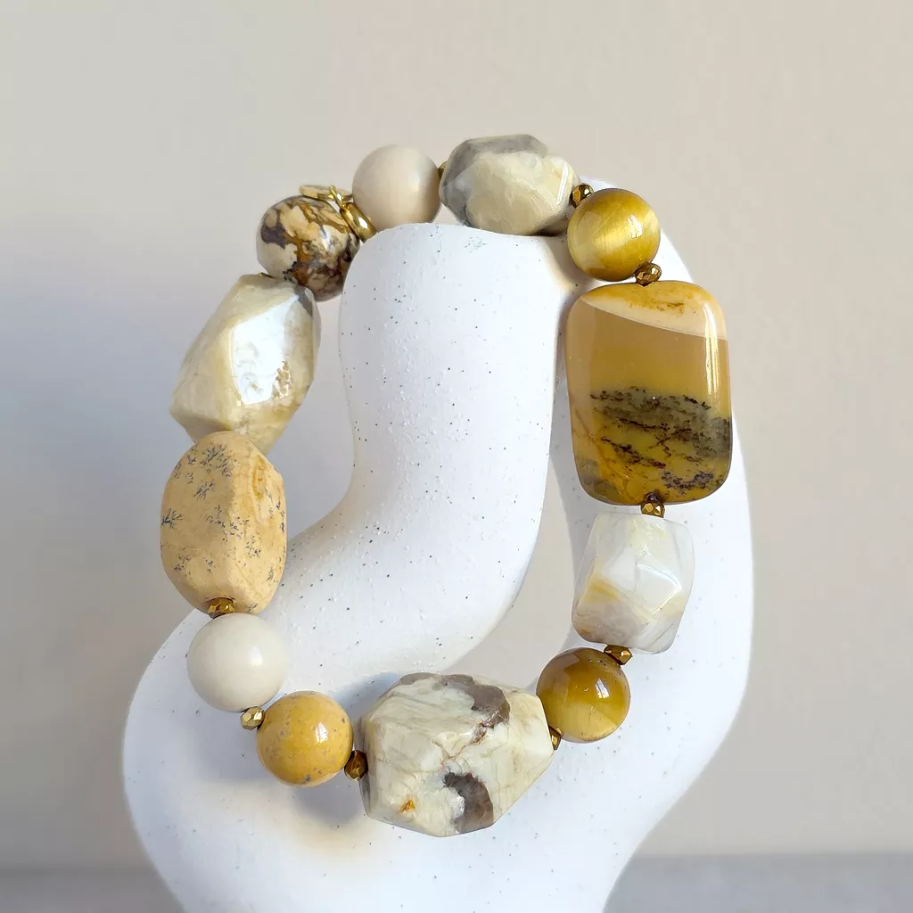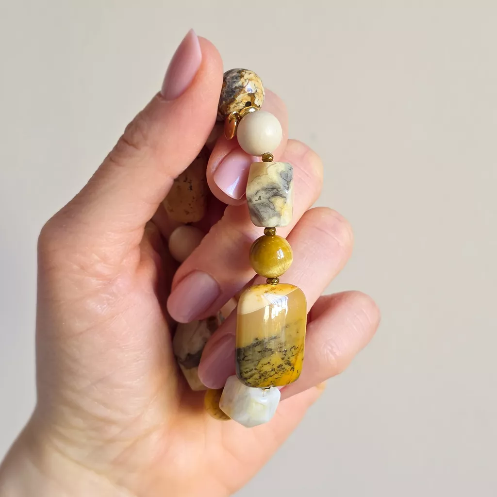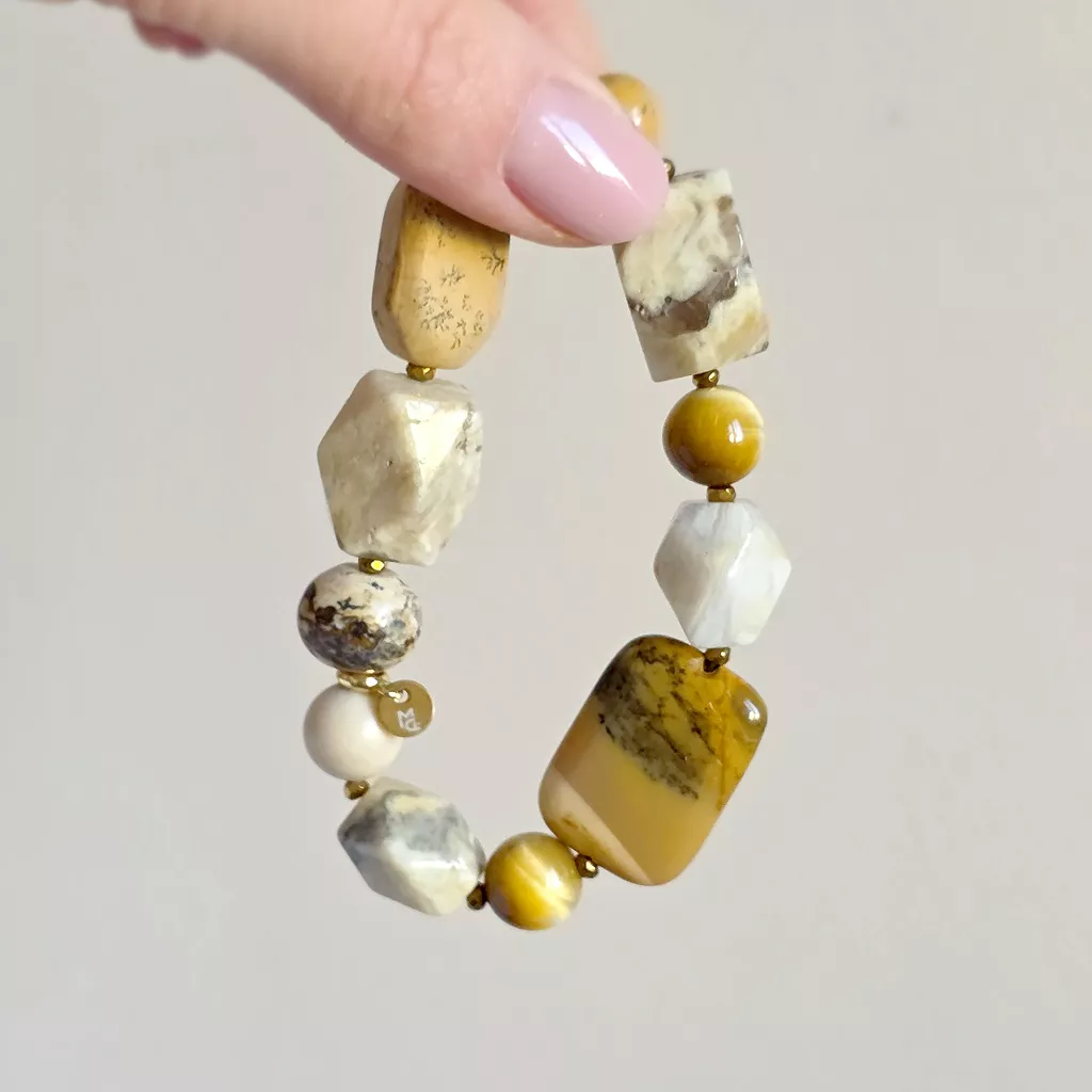 Ta bransoletka bohemian to kompozycja inspirowana kolorami ziemi, słońca i naturalnych krajobrazów. Połączenie mokaitu, żółtego tygrysiego oka, opalu żółtego, kamienia rzecznego, jaspisu pejzażowego, agatu żółtego i hematytu tworzy harmonijną biżuterię o ciepłej, naturalnej energii.