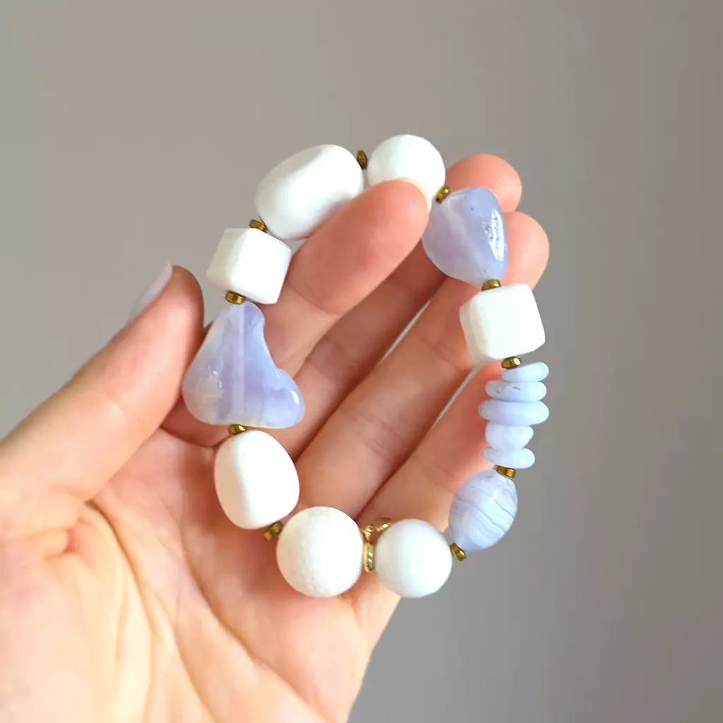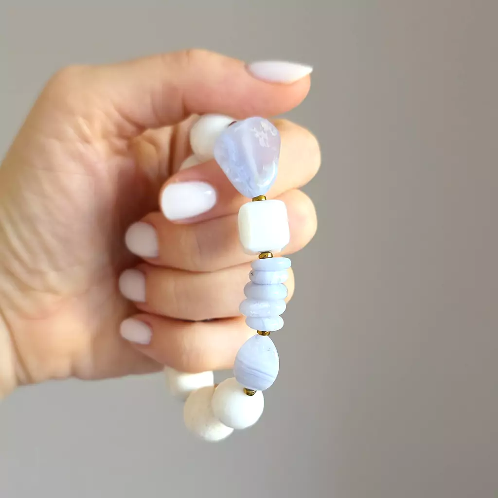 Bohemian bransoletka unikat niebieski agat, biały agat, biały koral, biały jadeit i hematyt