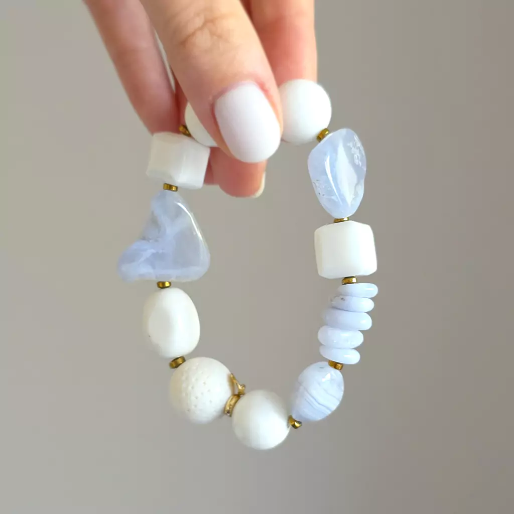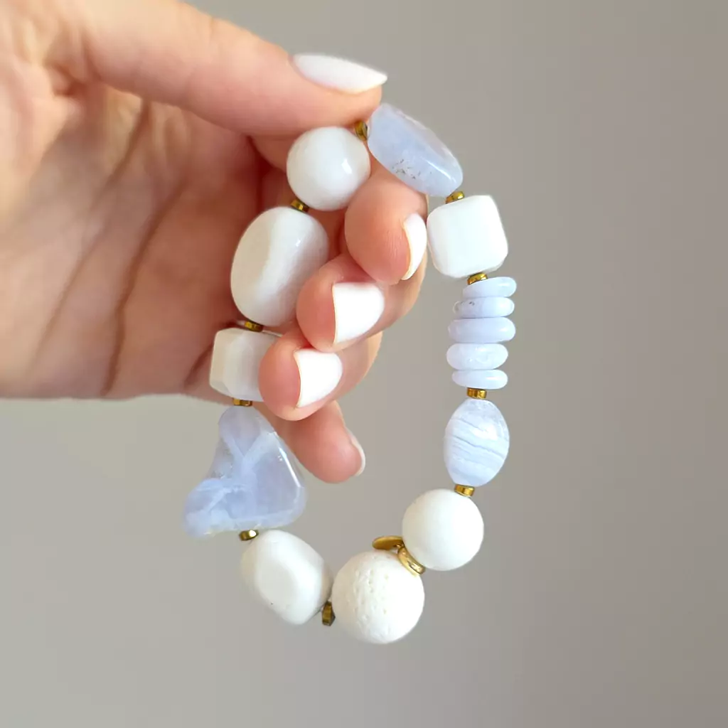 | Rodzaj kamienia: | Niebieski agat, Biały agat, Biały koral, Biały jadeit, Hematyt |