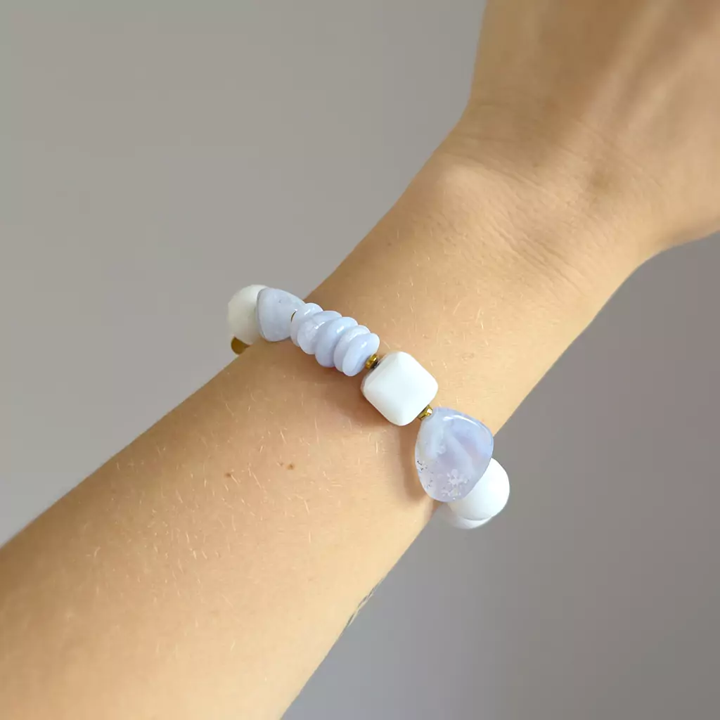Bransoletka wykonana z miksu kamieni. W bransoletce znajdziesz: agat niebieski, agat biały, koral biały, jadeit biały i hematyt. Bazą bransoletki jest mocna, silikonowa gumka. Dodatek stanowi blaszka z logo Magneska.