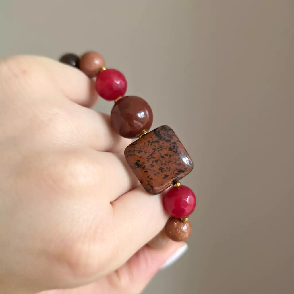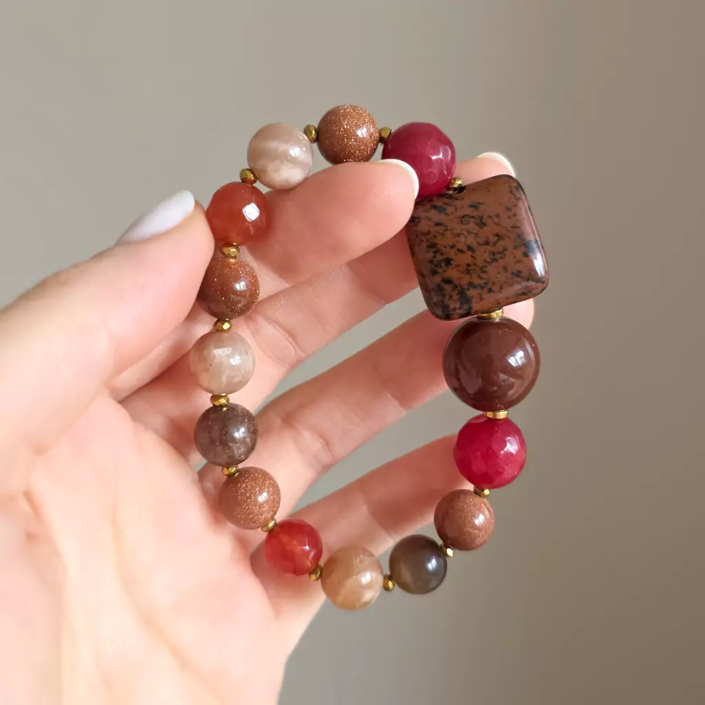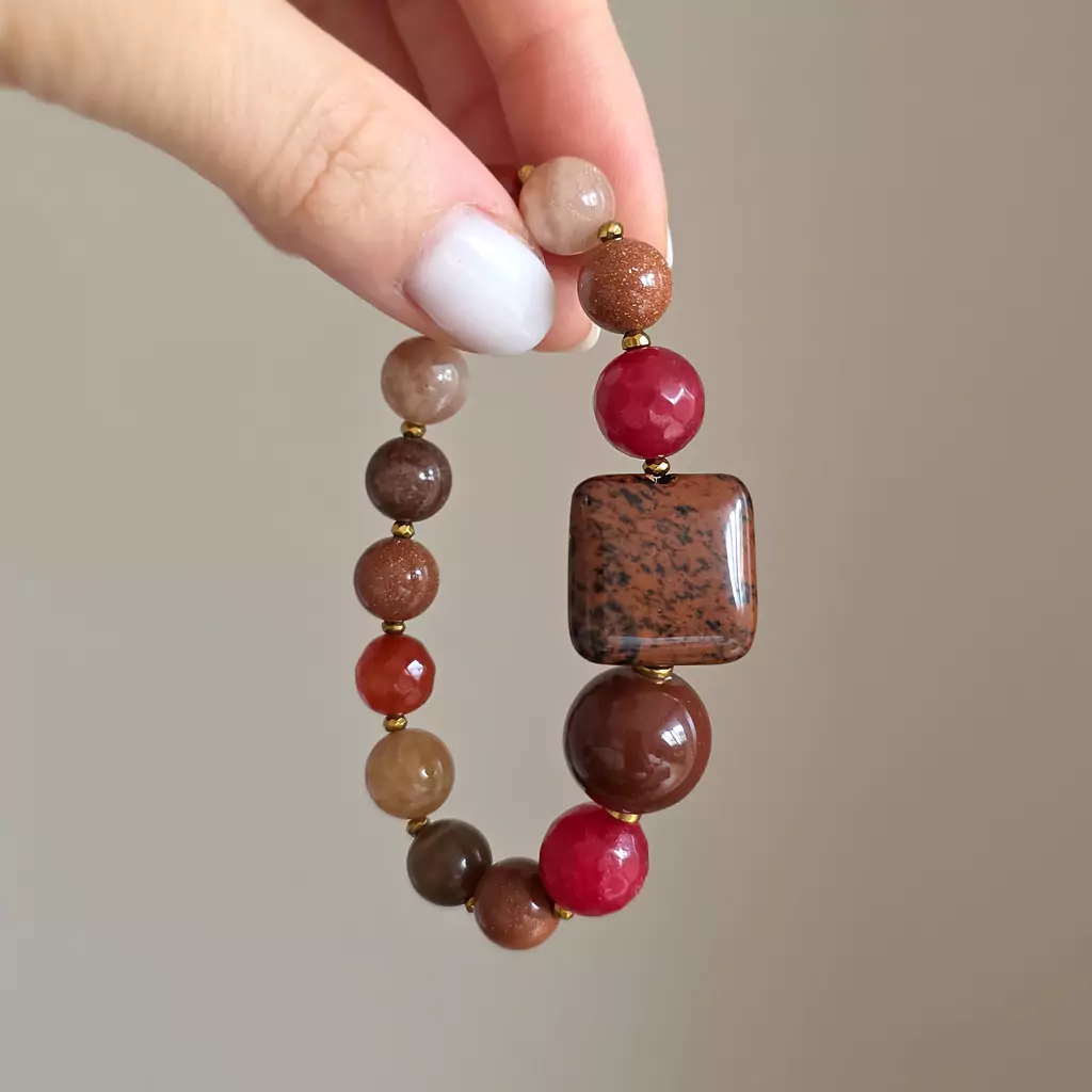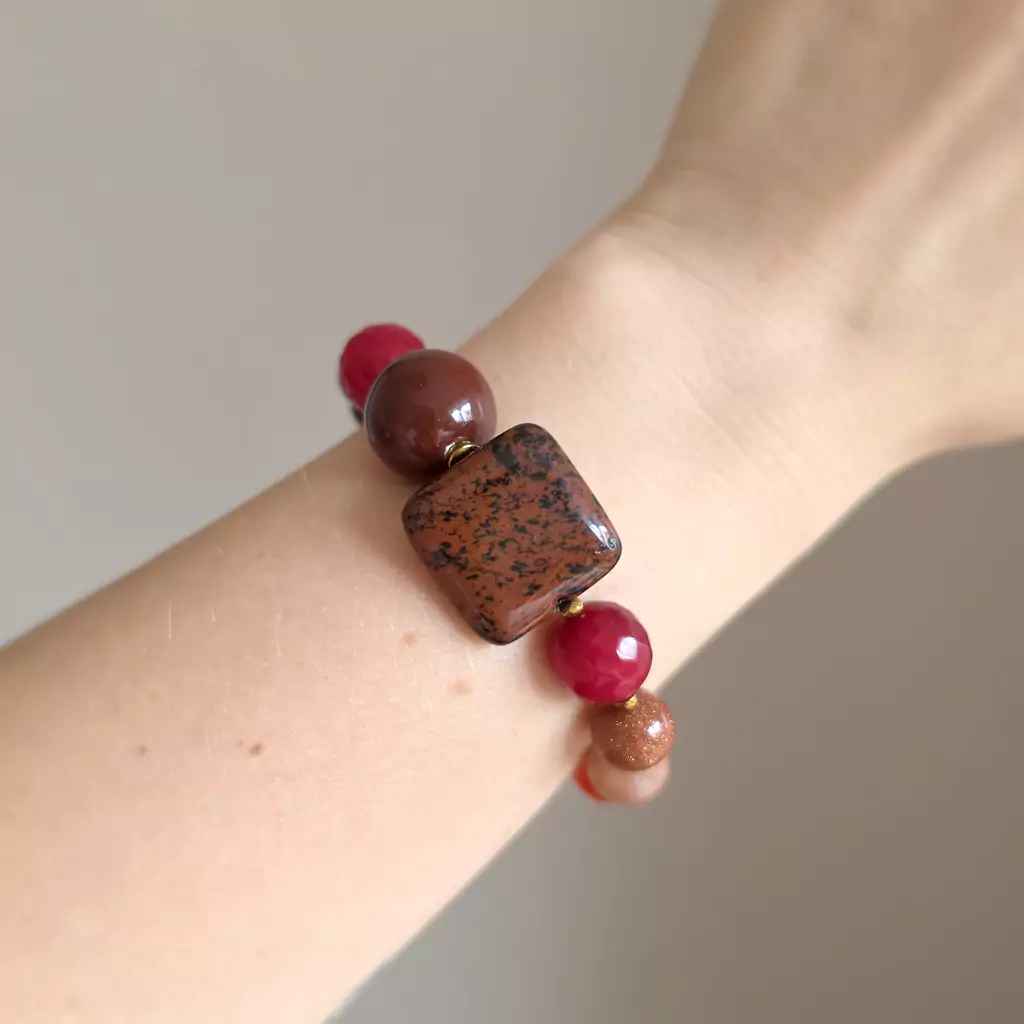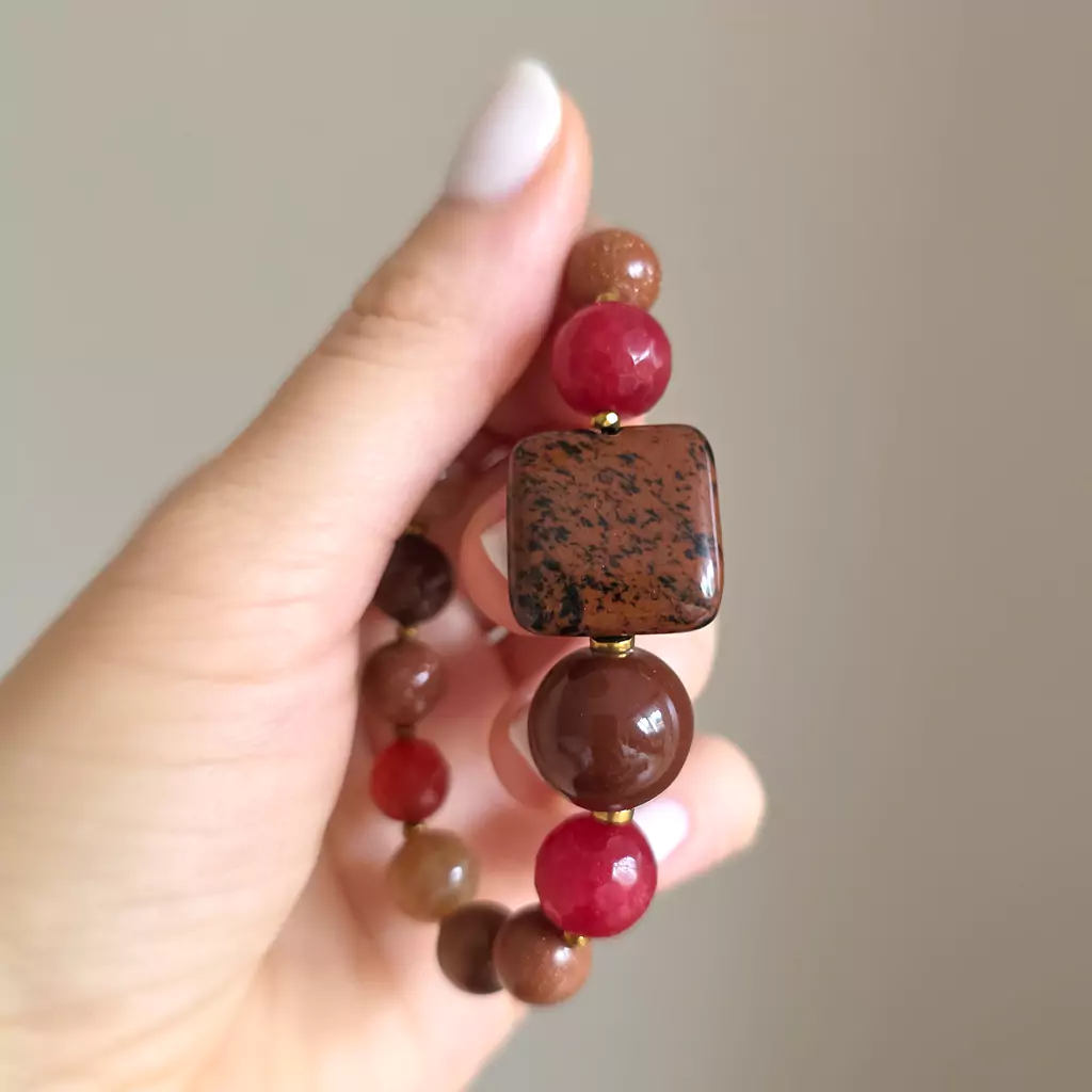 Bohemian bransoletka unikat obsydian mahoniowy, jadeit, piasek pustyni, kamień słoneczny, agat, bronzyt i ceramika