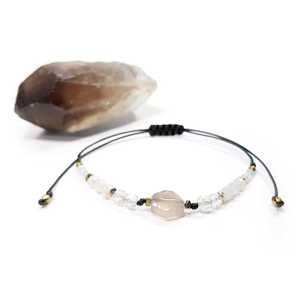 Bransoletka agat szary, topaz, morganit i hematyt na czarnym sznurku