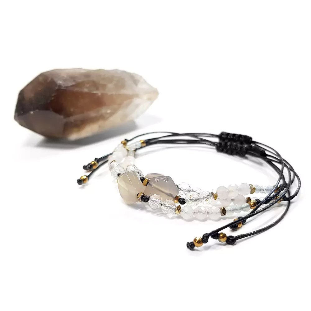 Bransoletka wykonana z kamieni naturalnych - agatu szarego, topazu, morganitu i hematytu oraz nylonowego sznureczka.