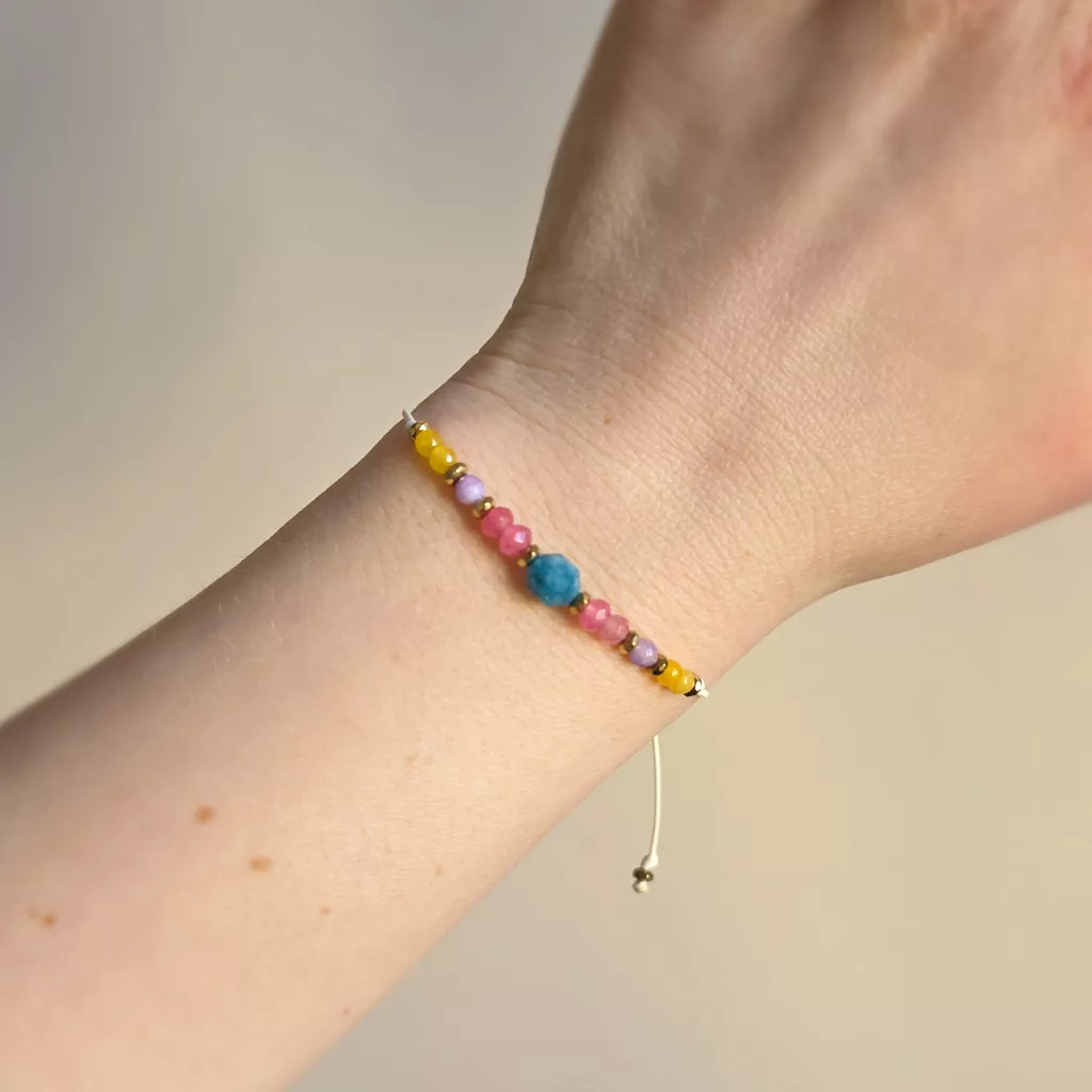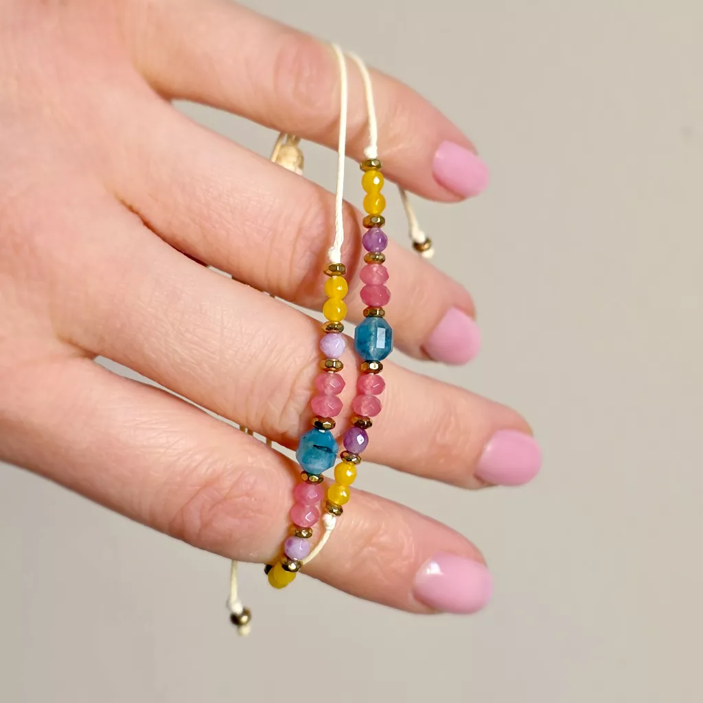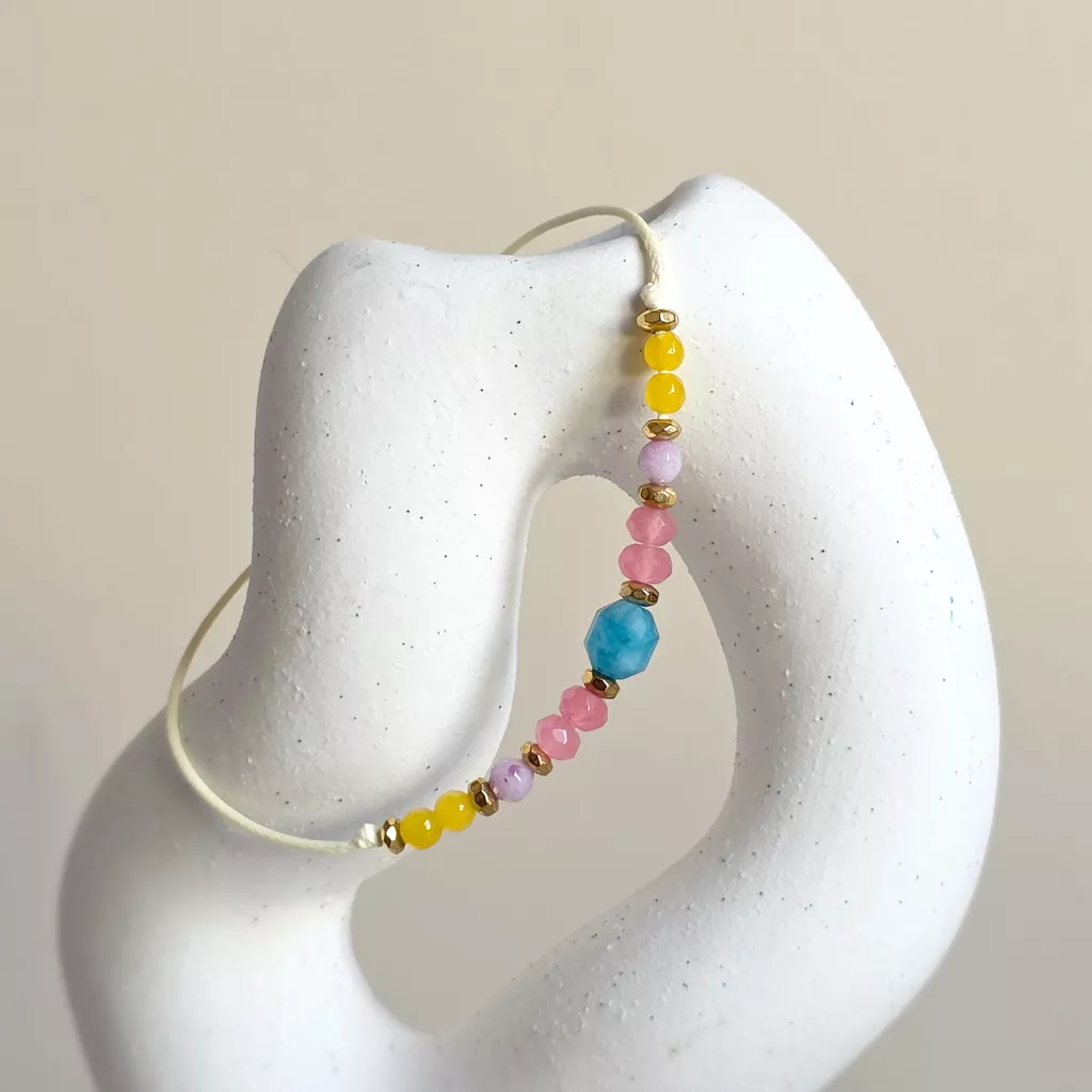 Bransoletka z apatytem, kolorowymi agatami i złotymi hematytami została osadzona na kremowym sznurku, który podkreśla lekki, uporządkowany charakter kompozycji. Jedenaście głównych kamieni tworzy rytmiczny układ barw, a drobne hematyty w złotym kolorze wprowadzają subtelny połysk i wyraźnie zaznaczają detale. To model minimalistyczny, ale nie surowy — łączy naturalną kolorystykę kamieni z ciepłym odcieniem sznurka i delikatnym akcentem złota.