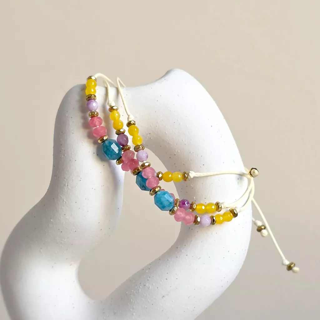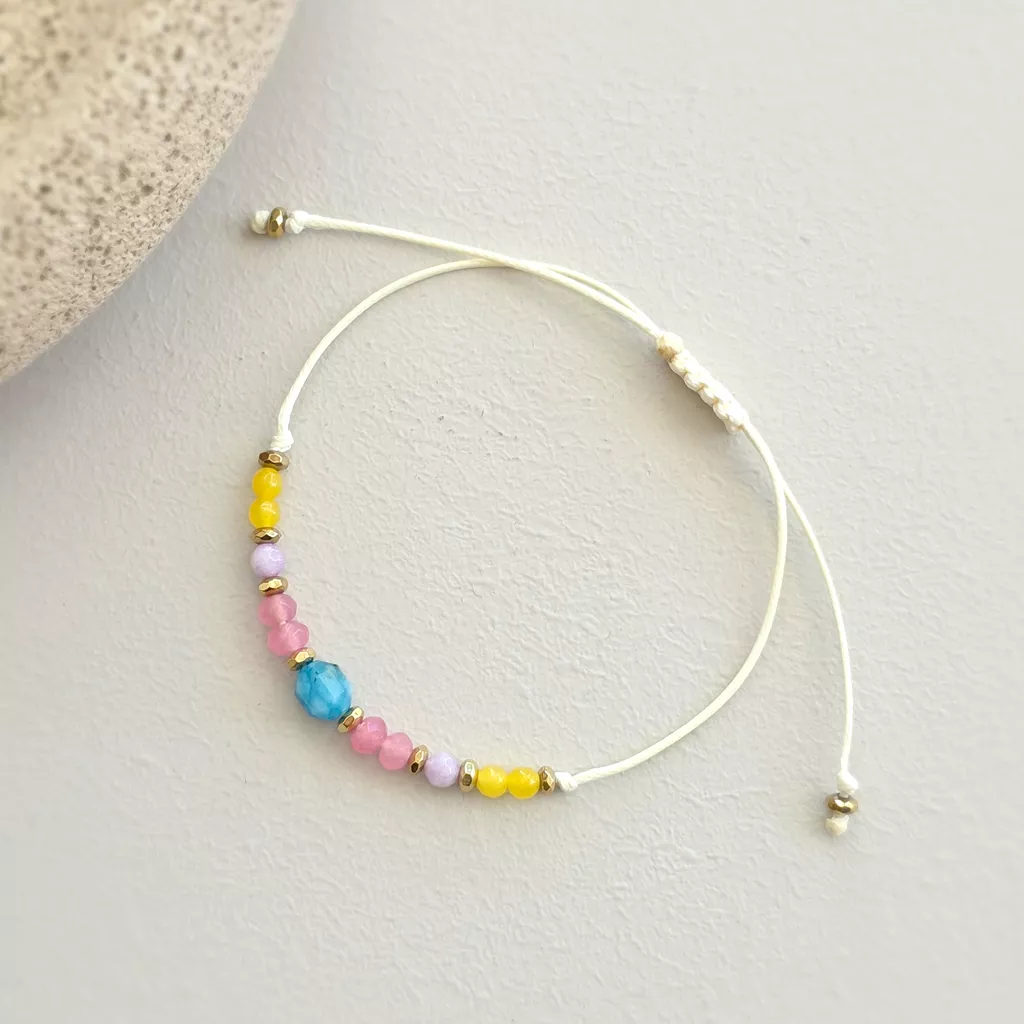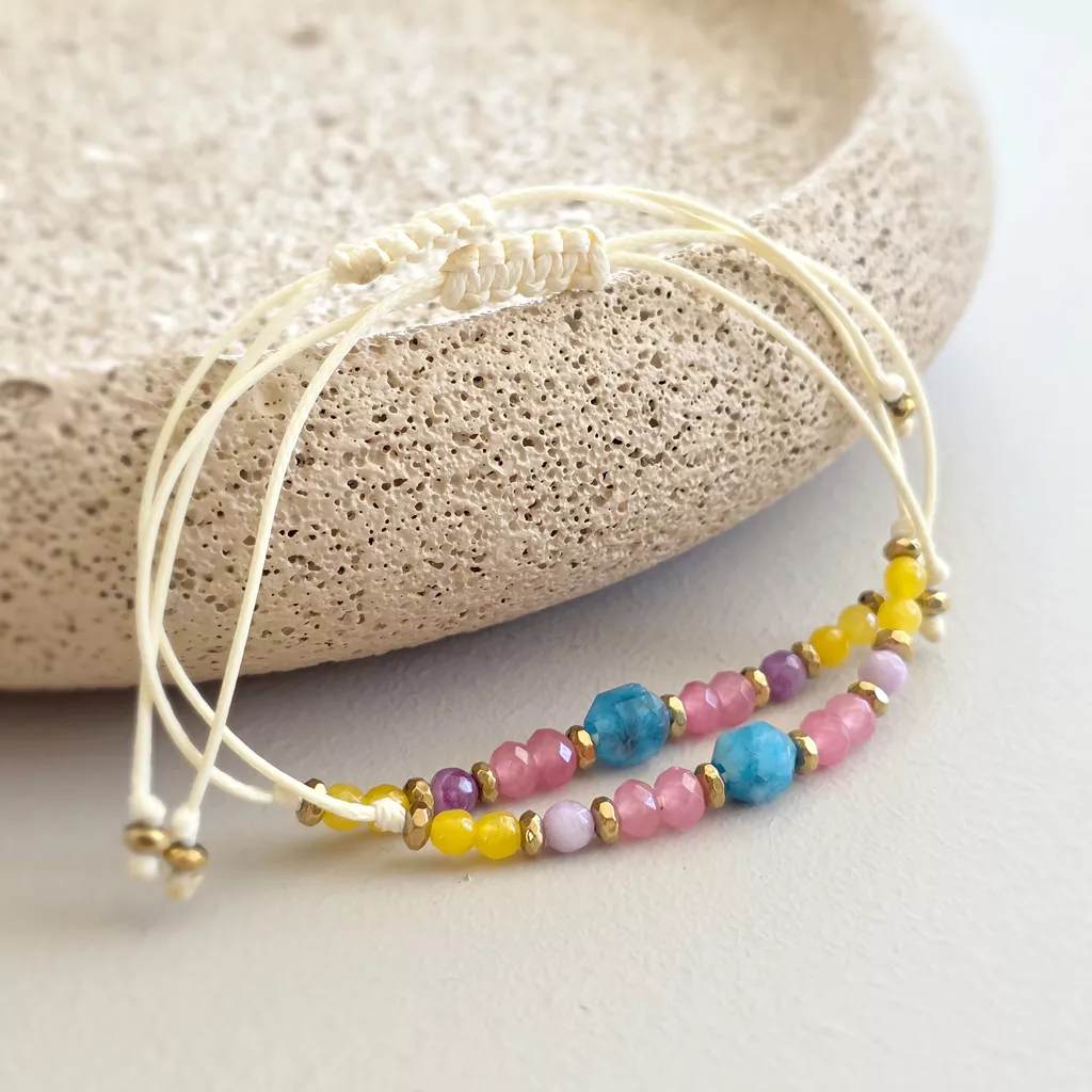 Bransoletka z apatytem, kolorowymi agatami i złotymi hematytami została osadzona na kremowym sznurku, który podkreśla lekki, uporządkowany charakter kompozycji. Jedenaście głównych kamieni tworzy rytmiczny układ barw, a drobne hematyty w złotym kolorze wprowadzają subtelny połysk i wyraźnie zaznaczają detale. To model minimalistyczny, ale nie surowy — łączy naturalną kolorystykę kamieni z ciepłym odcieniem sznurka i delikatnym akcentem złota.