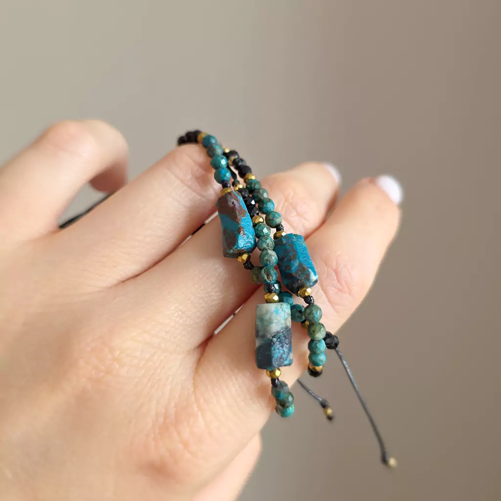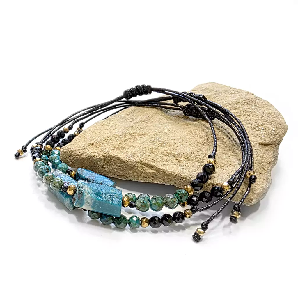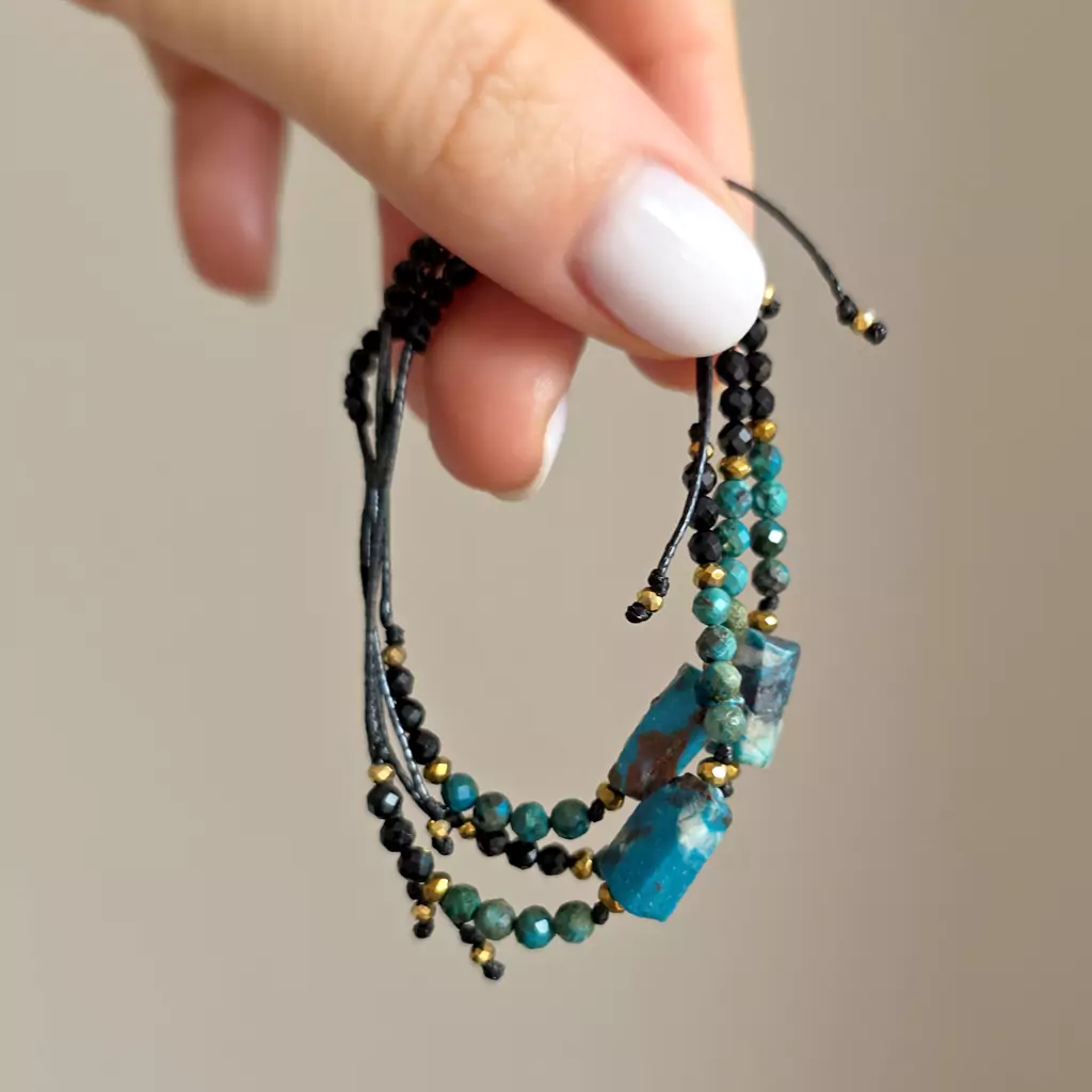 Bransoletka wykonana z kamieni naturalnych - chryzokoli, czarnego turmalinu i hematytu oraz nylonowego sznureczka.
