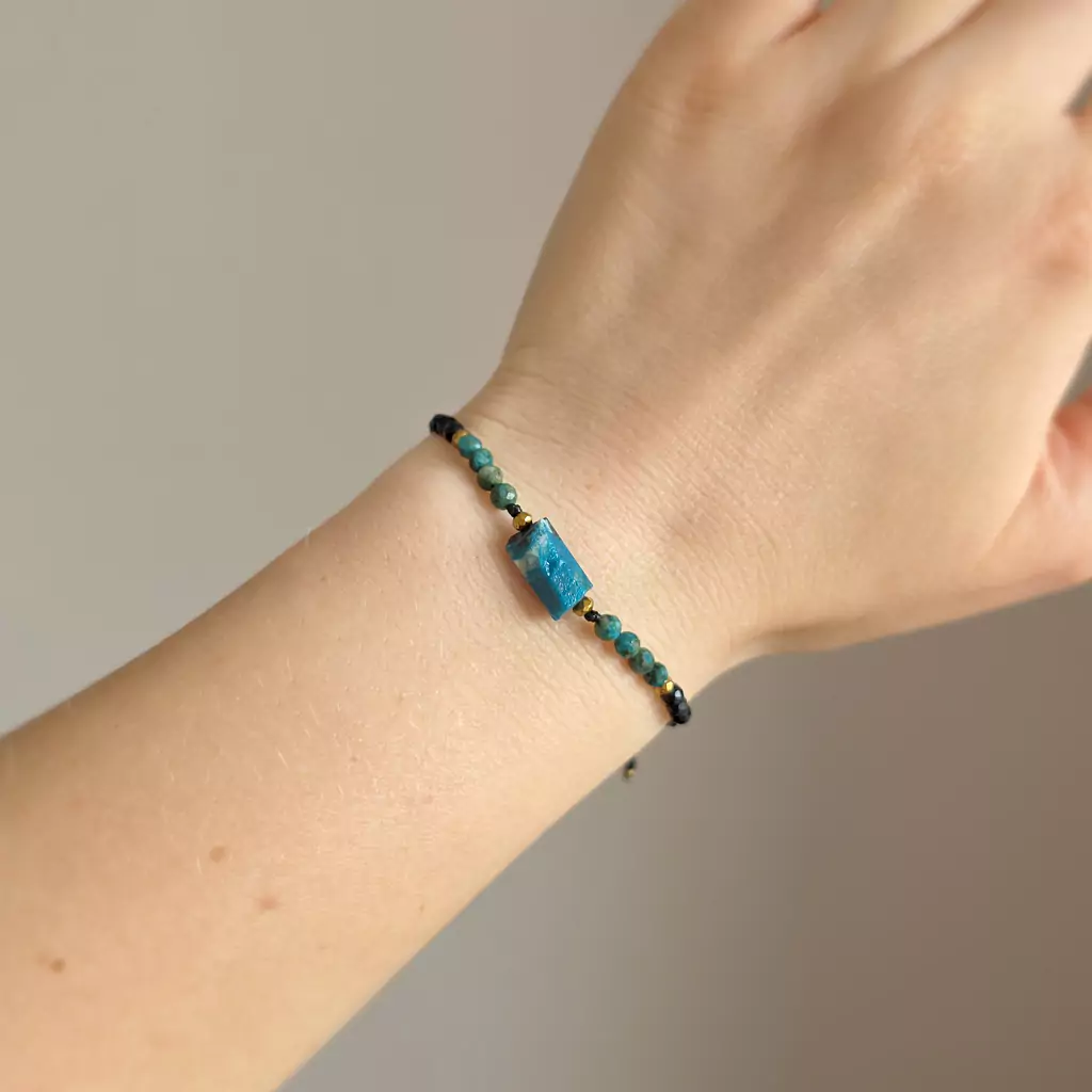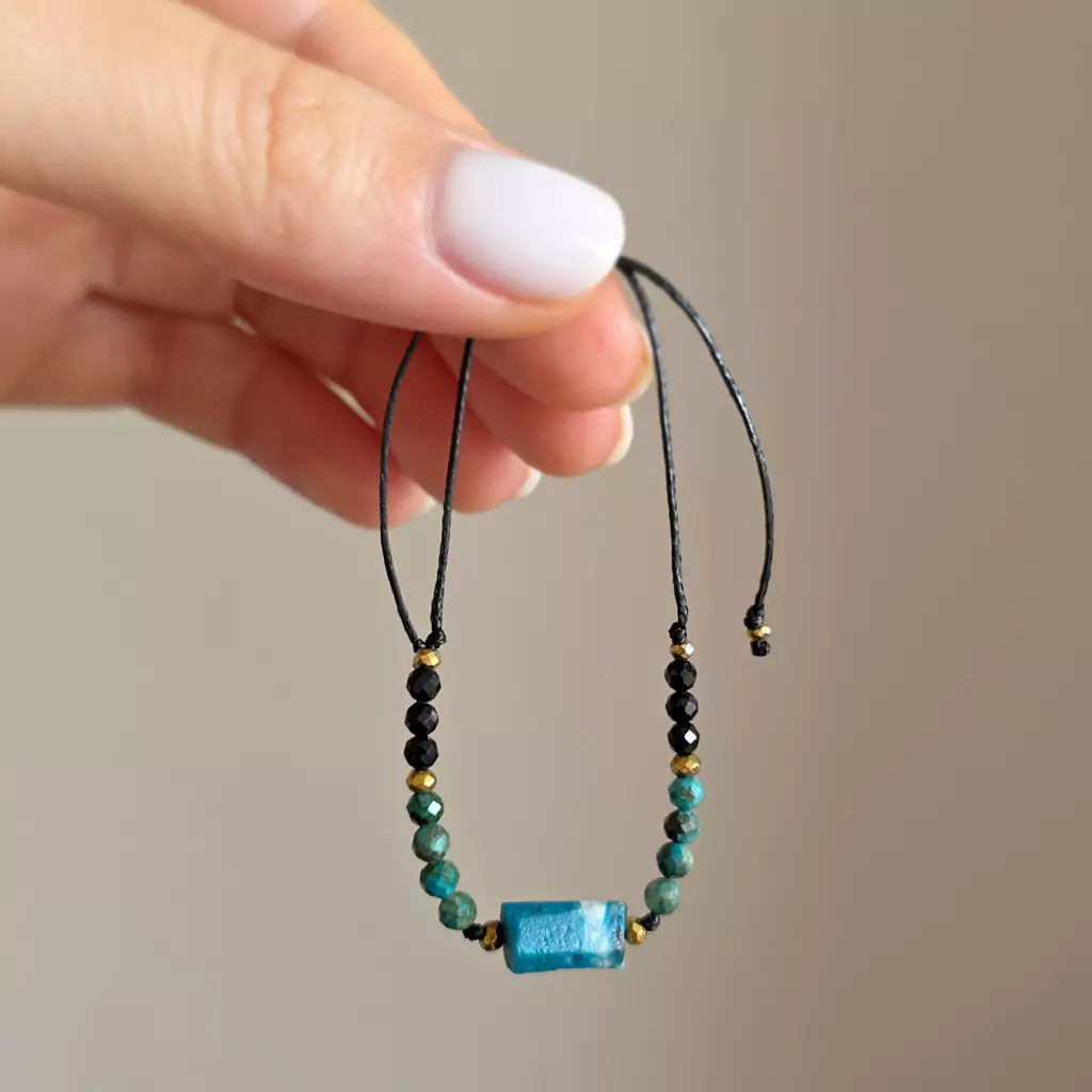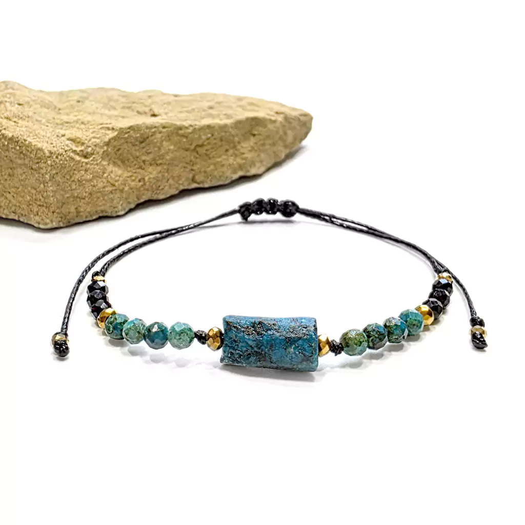 Bransoletka wykonana z kamieni naturalnych - chryzokoli, czarnego turmalinu i hematytu oraz nylonowego sznureczka.
