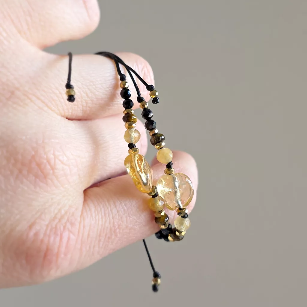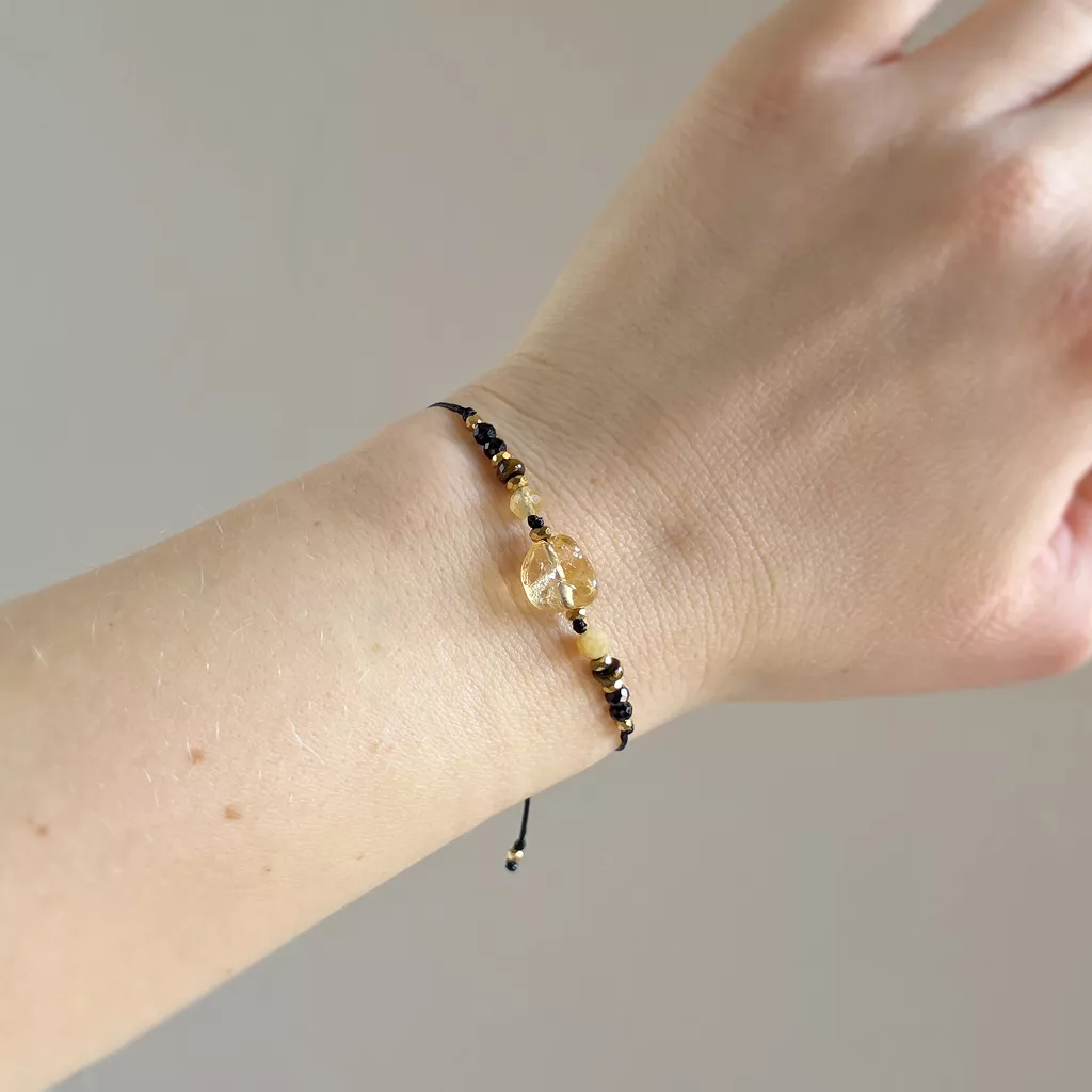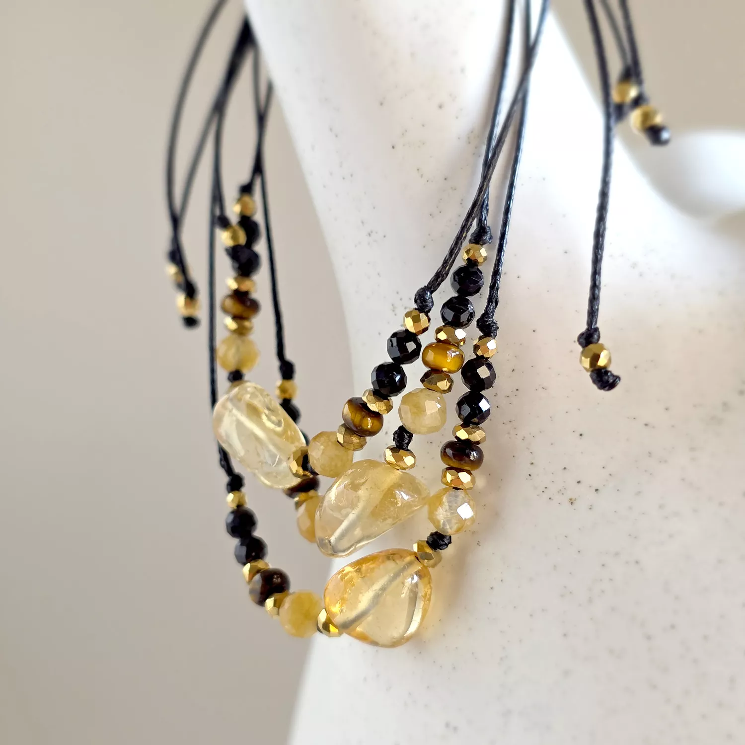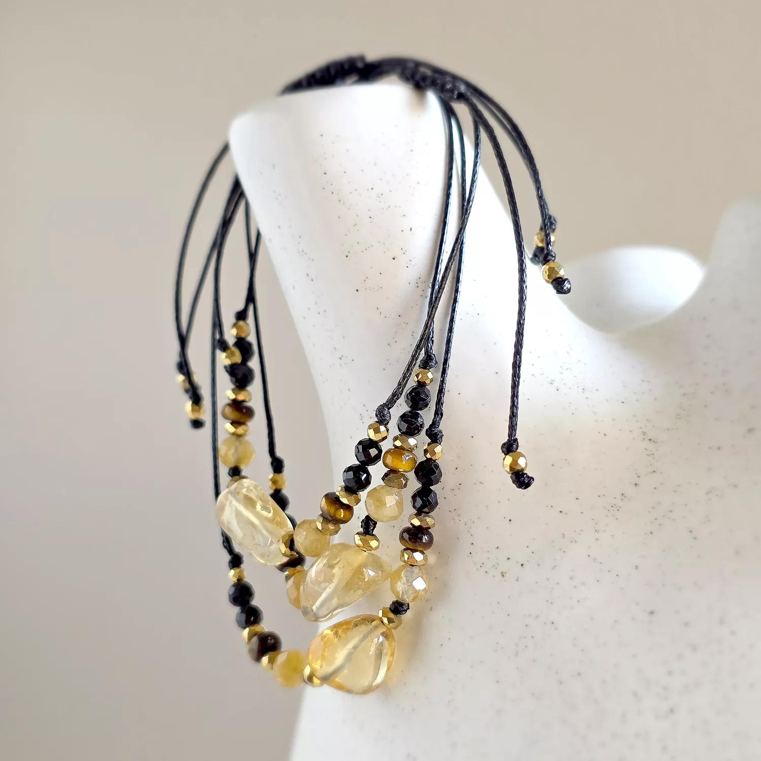 Bransoletka wykonana z kamieni naturalnych - cytrynu (prażony), apatytu żółtego, czarnego turmalinu, tygrysiego oka i hematytu oraz poliestrowego sznureczka.