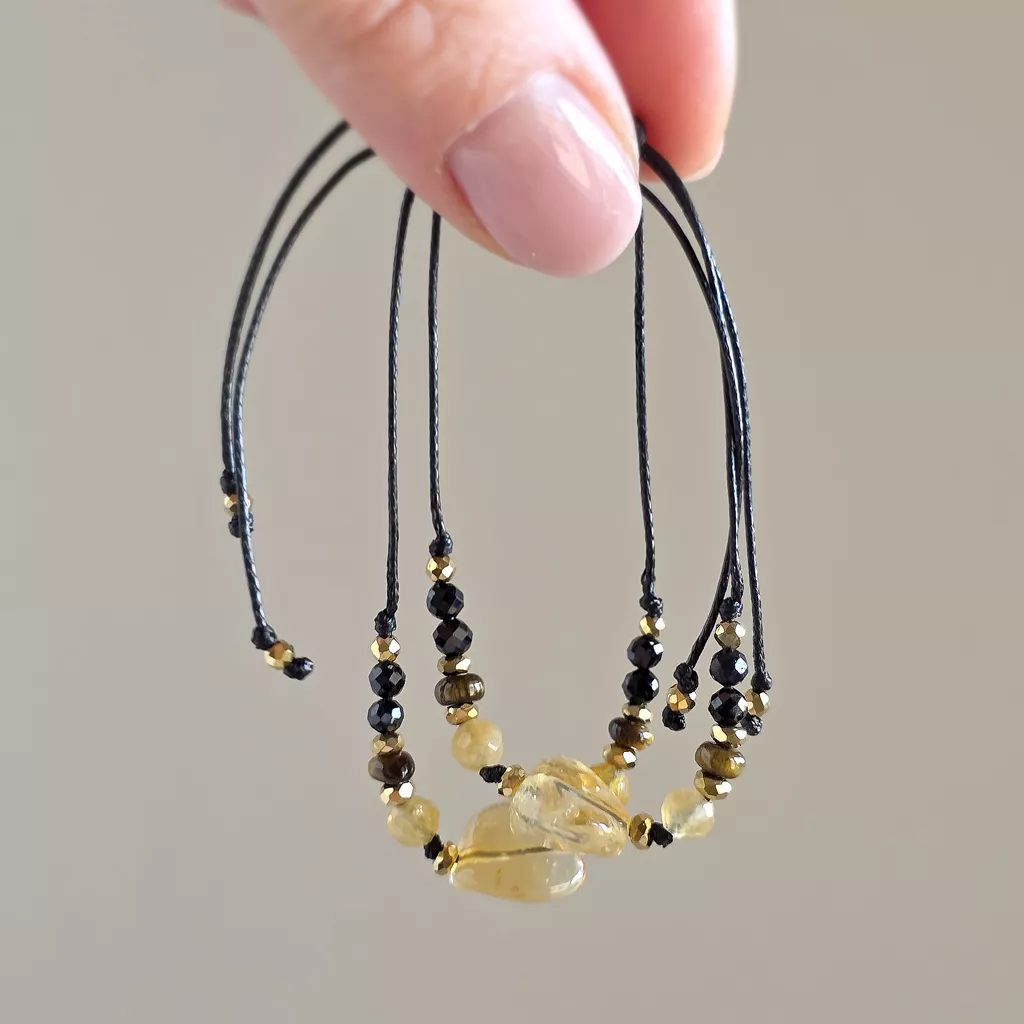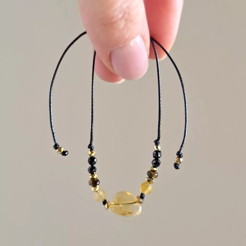 Bransoletka cytryn, apatyt żółty, tygrysie oko, czarny turmalin i hematyt na czarnym sznurku