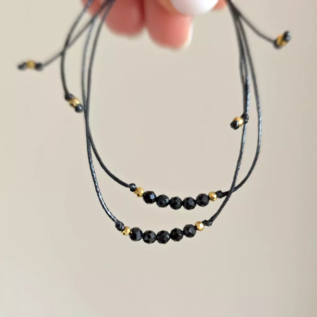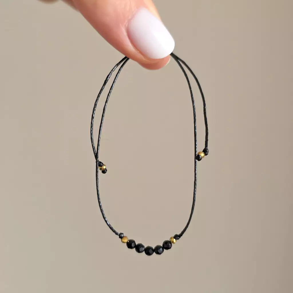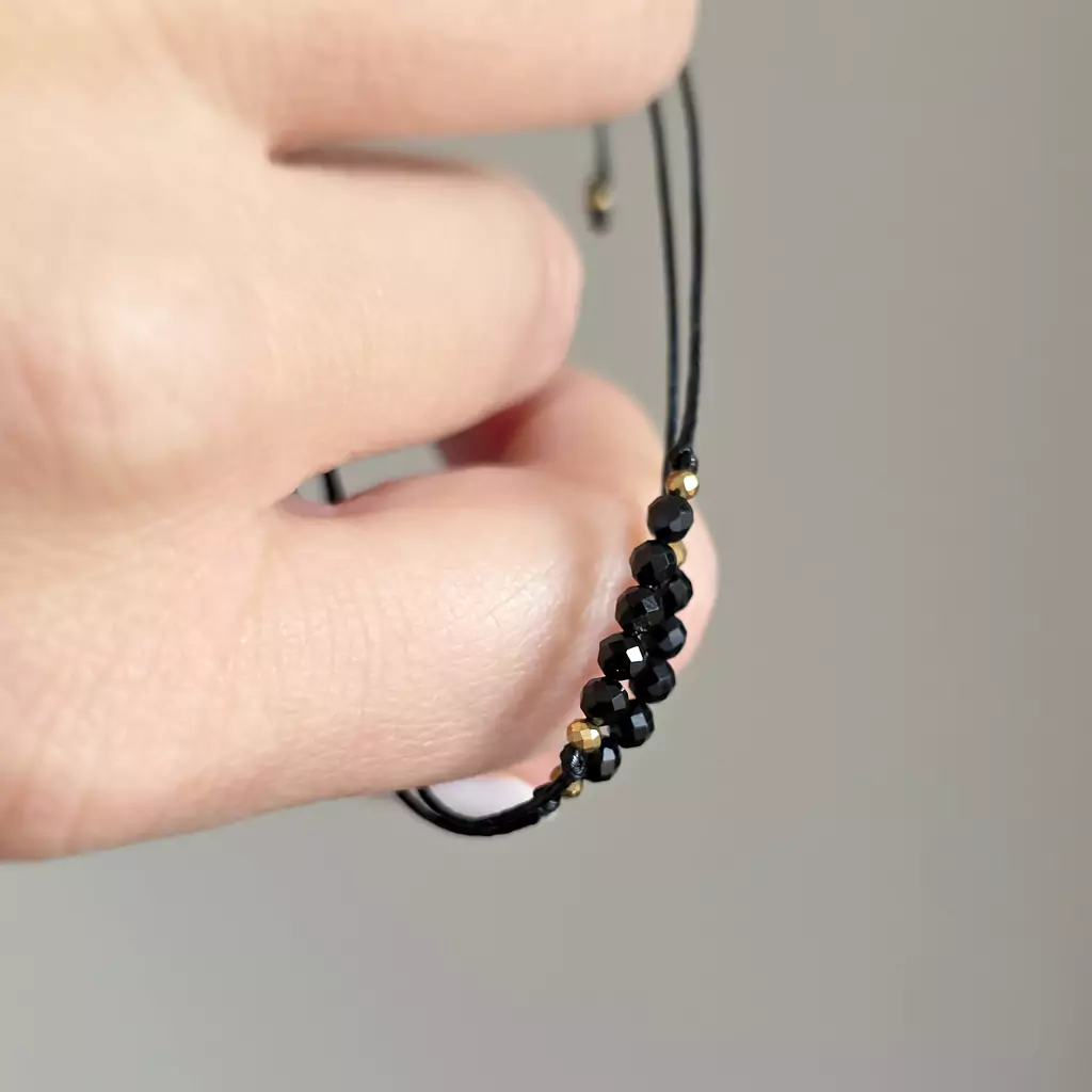 Bransoletka wykonana z kamieni naturalnych - czarnego turmalinu i drobnych hematytów oraz nylonowego sznureczka.
