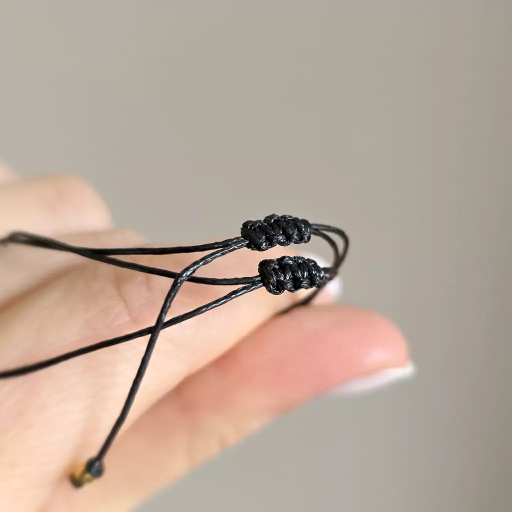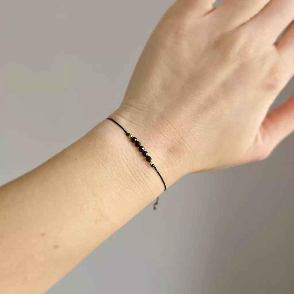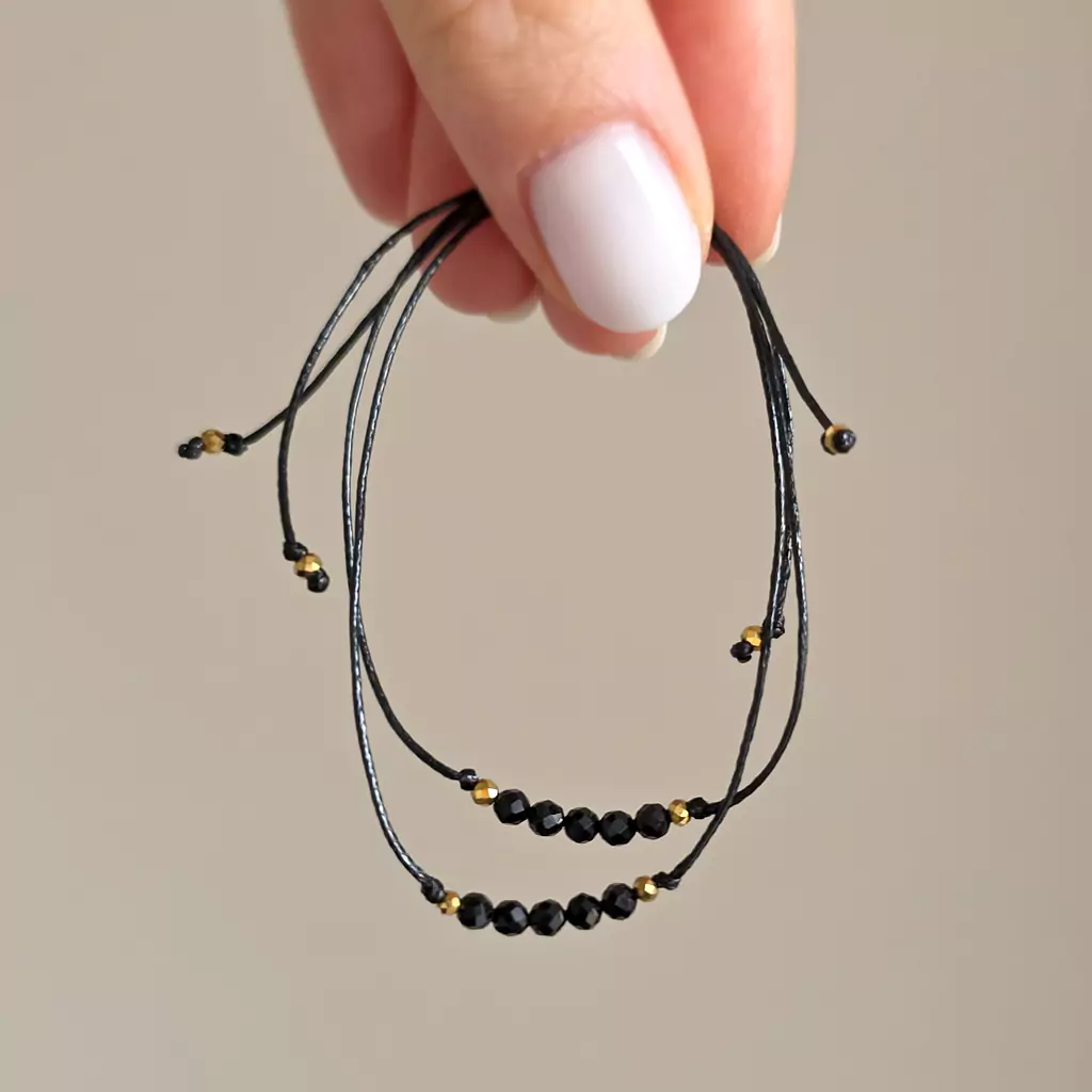 Bransoletka wykonana z kamieni naturalnych - czarnego turmalinu i drobnych hematytów oraz nylonowego sznureczka.