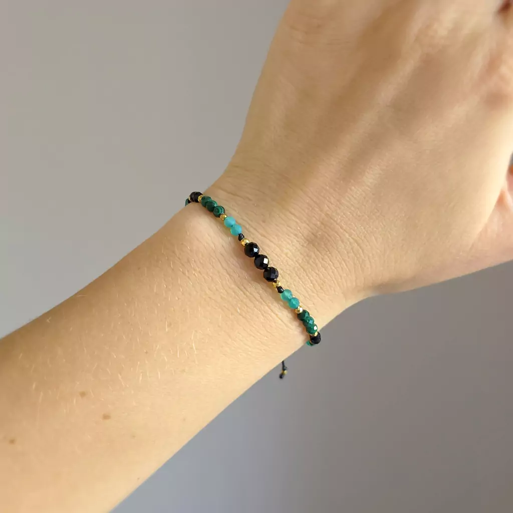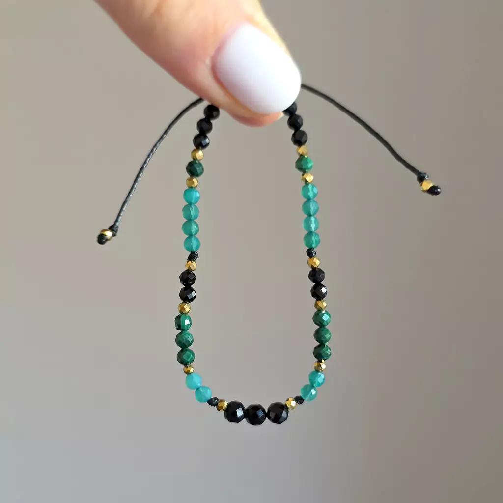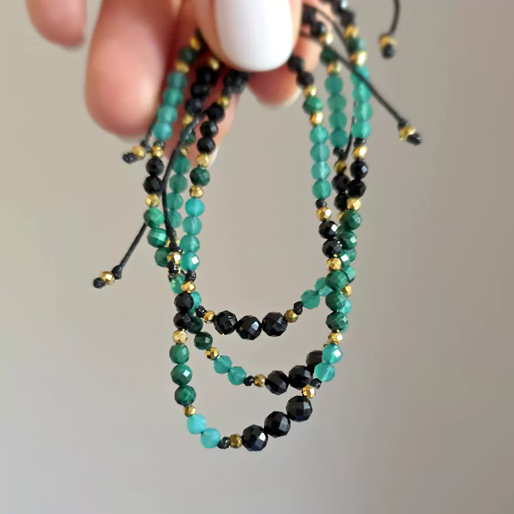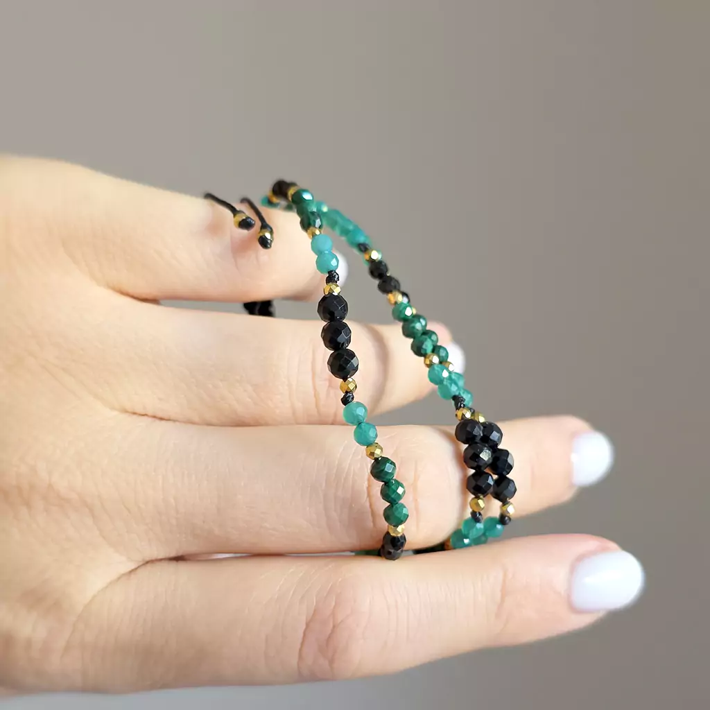 Bransoletka czarny turmalin, zielony agat, malachit i hematyt na czarnym sznurku Fullness of protection & growth