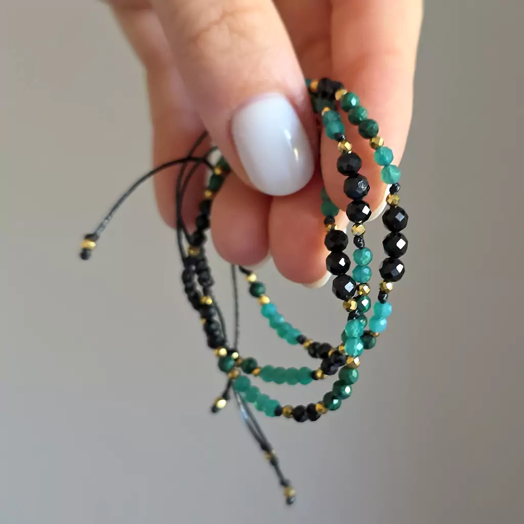 Fullness of protection & growth to bransoletka, która jednocześnie chroni i wzmacnia. Czarny turmalin działa jak tarcza przed negatywną energią. Zielony agat uspokaja emocje i pomaga odnaleźć równowagę. Malachit to kamień przemiany – otwiera serce na zmiany i prowadzi ku rozwojowi. Hematyt stabilizuje, dodaje siły i zakorzenia. To talizman dla osób, które chcą czuć się bezpiecznie, a jednocześnie odważnie iść naprzód.