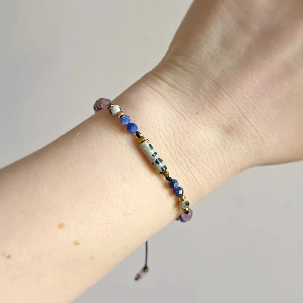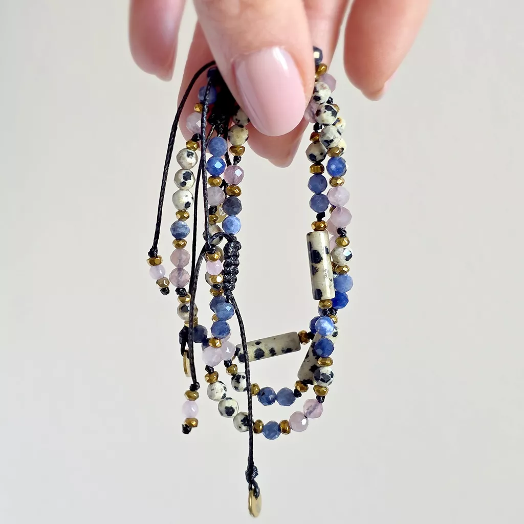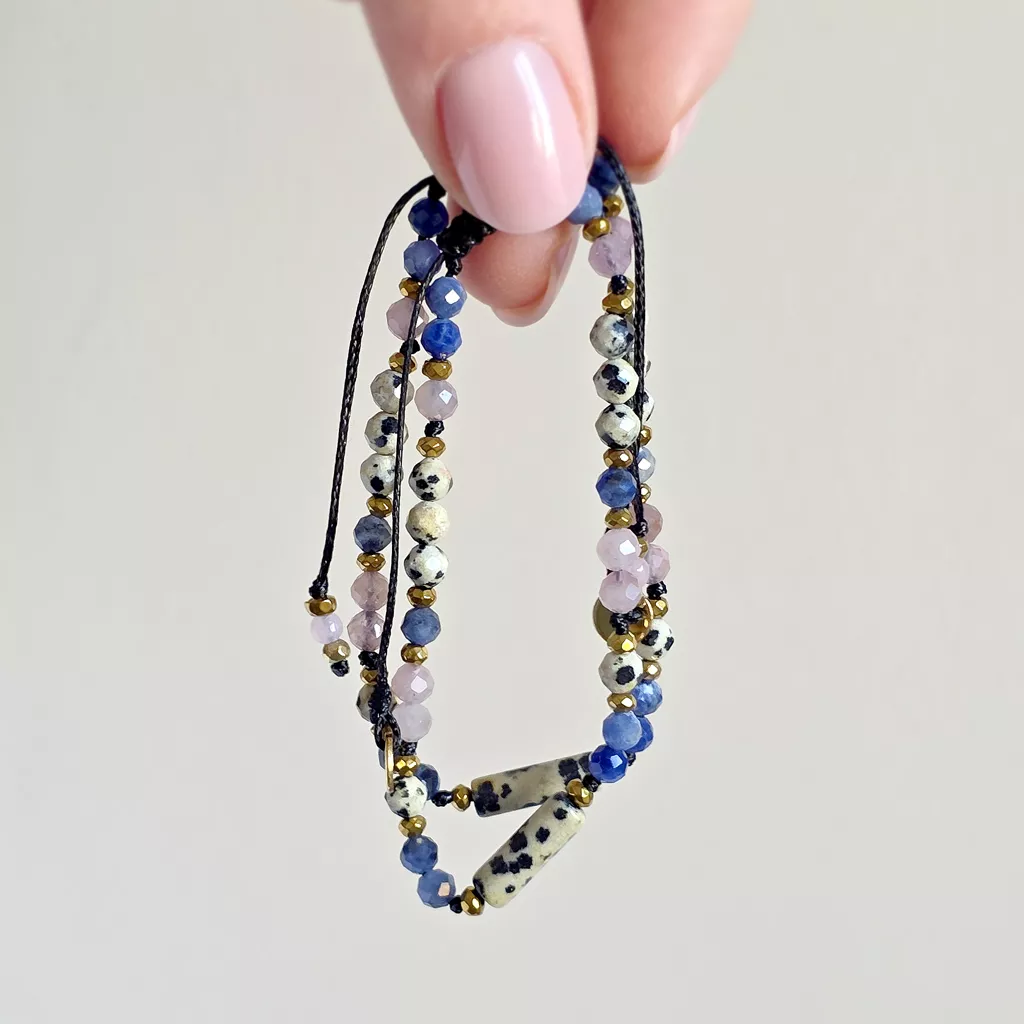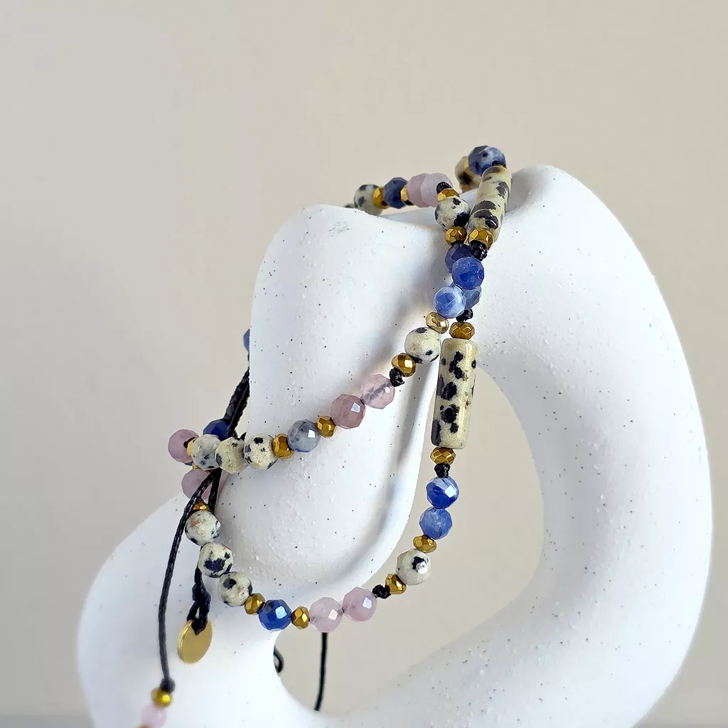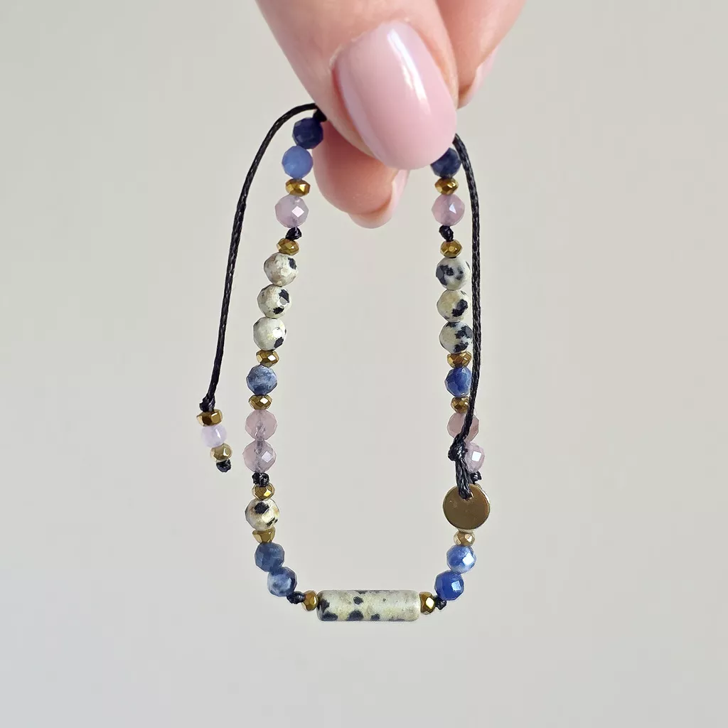 Bransoletka Fullness of open heart to kompozycja, która wspiera szczerość i łagodność w relacjach – z innymi i z samą sobą. Jaspis dalmatyński wnosi radość, spontaniczność i dystans do codzienności. Sodalit pomaga wyrażać myśli i emocje w sposób spokojny i prawdziwy. Kwarc różowy otwiera serce na miłość i akceptację. Hematyt stabilizuje energię i daje poczucie bezpieczeństwa.