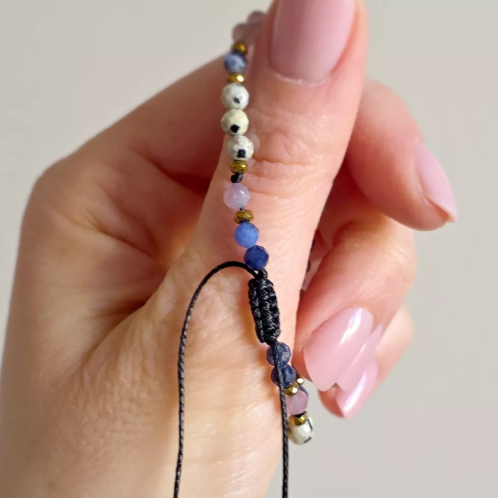 Kamienie zostały osadzone na czarnym regulowanym sznurku, który podkreśla ich naturalne barwy i nadaje bransoletce minimalistyczny, nowoczesny charakter. Dzięki regulacji łatwo dopasowuje się do nadgarstka i jest wygodna w codziennym noszeniu.