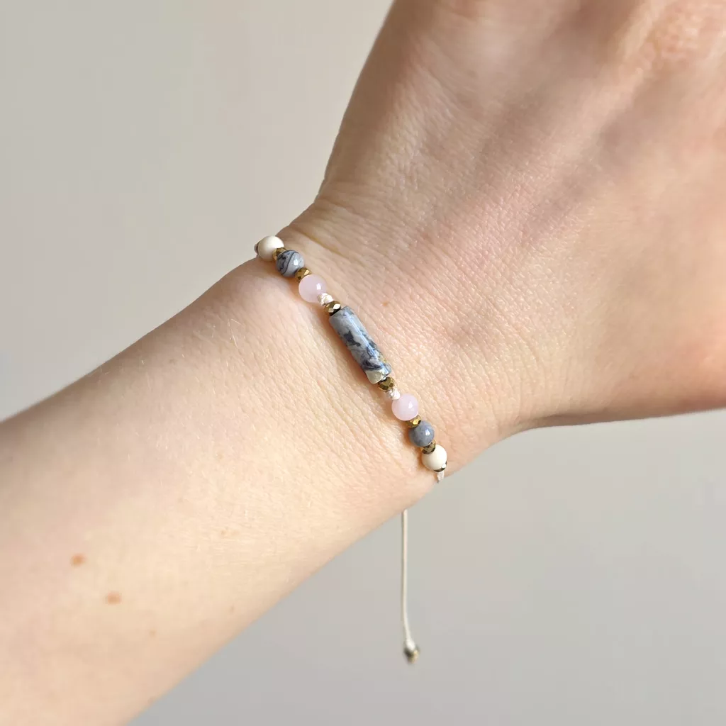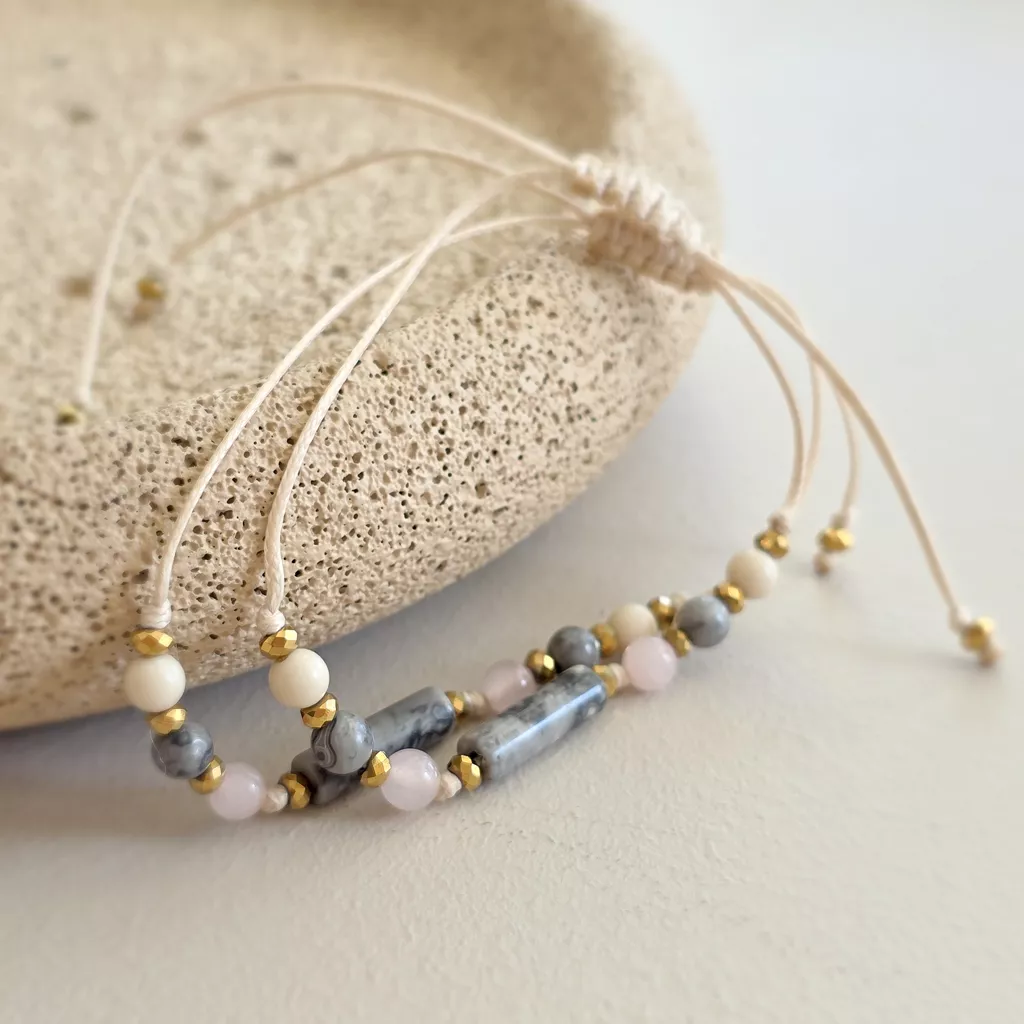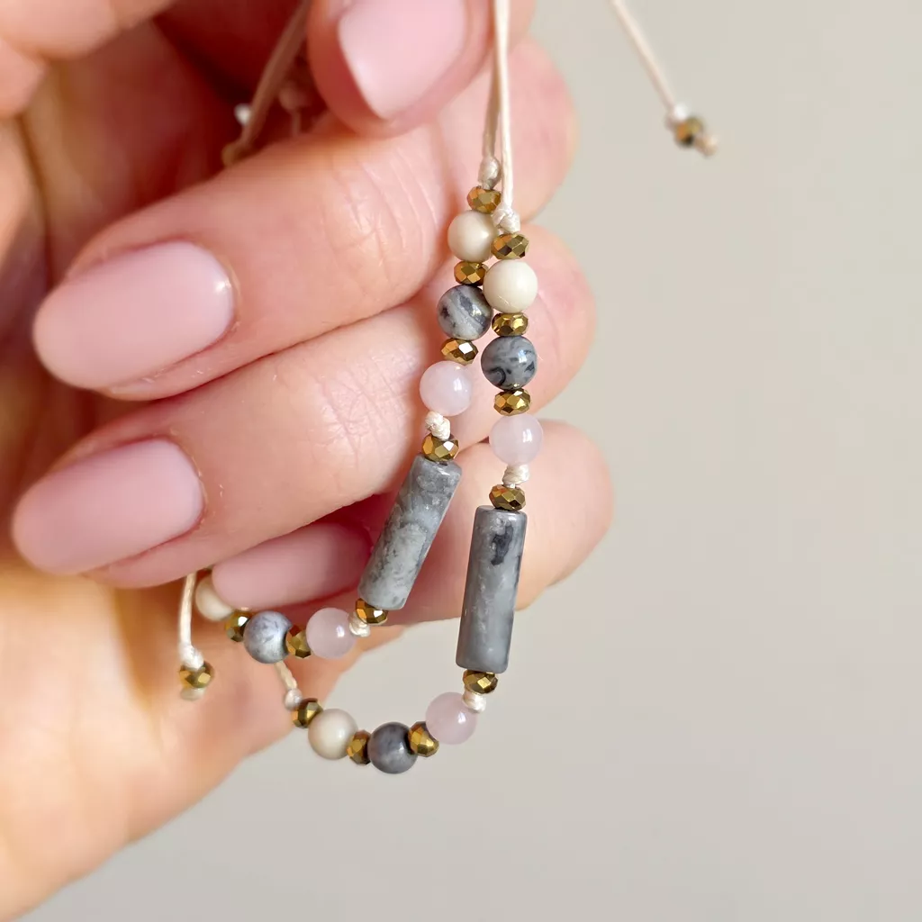 Połączenie neutralnych odcieni szarości, beżu i delikatnego różu sprawia, że bransoletka ma kojący, wyciszający charakter. To biżuteria, która nie dominuje – ale subtelnie wspiera, stabilizuje i otula spokojem.