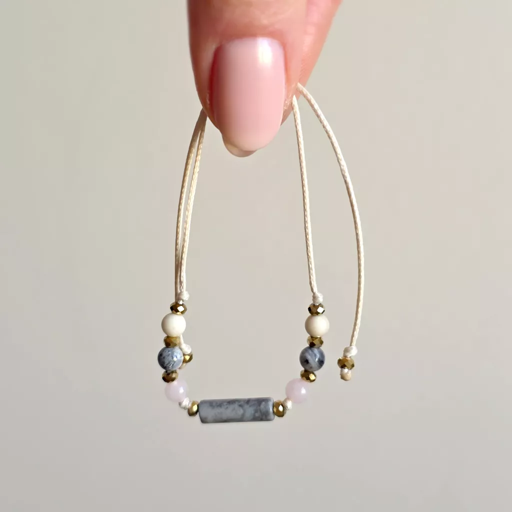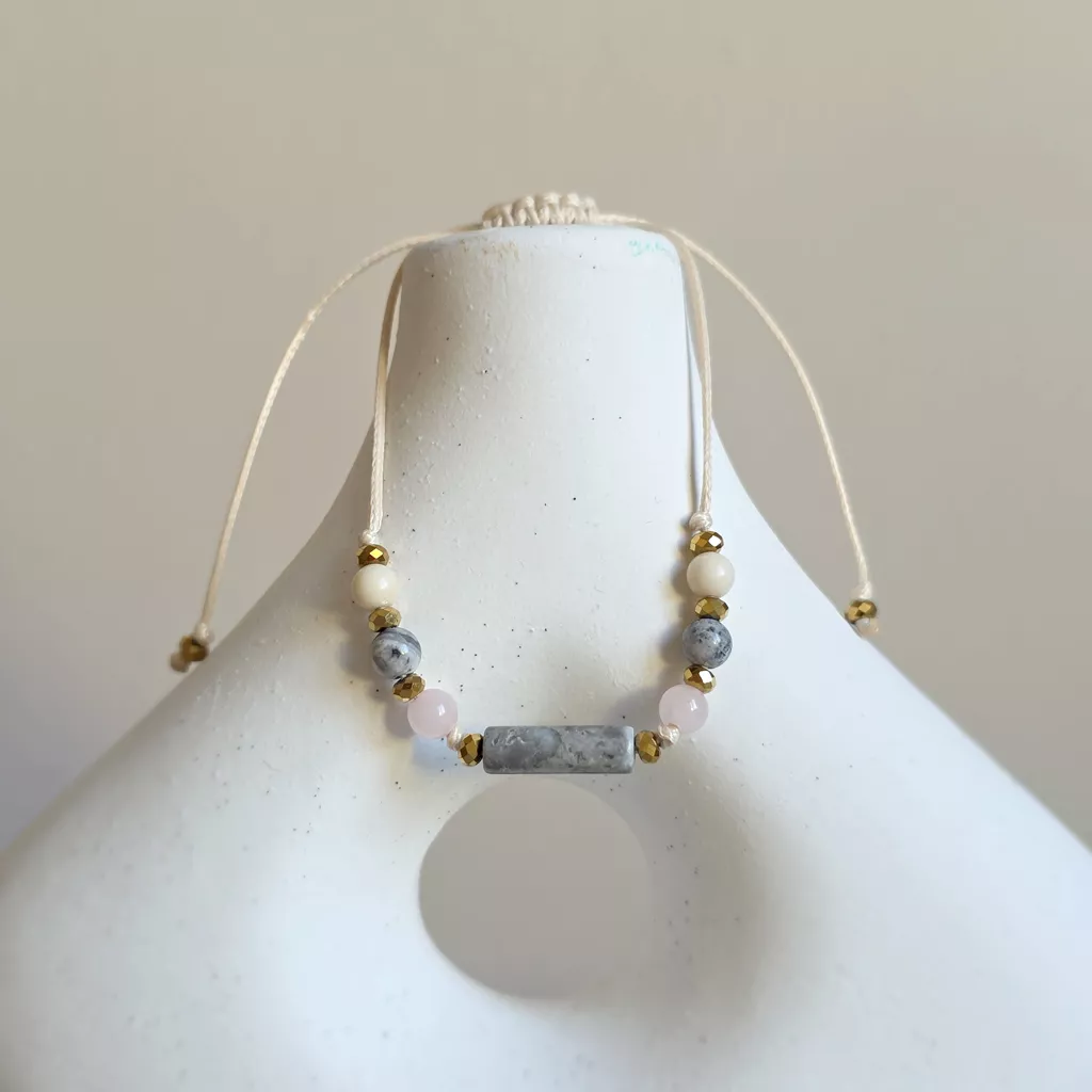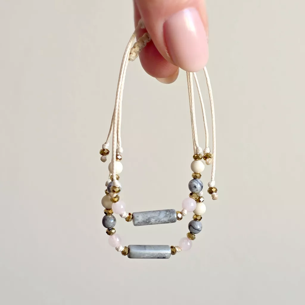 Połączenie neutralnych odcieni szarości, beżu i delikatnego różu sprawia, że bransoletka ma kojący, wyciszający charakter. To biżuteria, która nie dominuje – ale subtelnie wspiera, stabilizuje i otula spokojem.