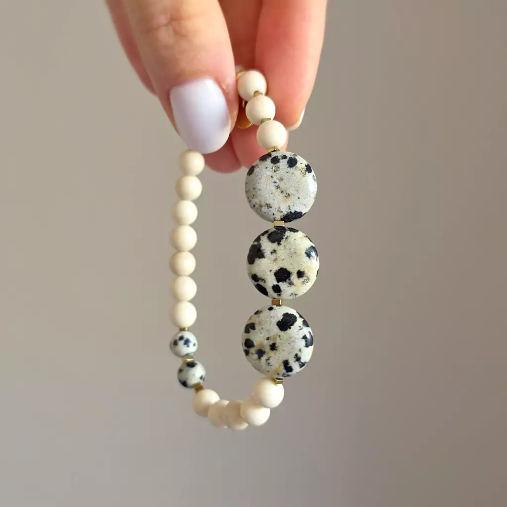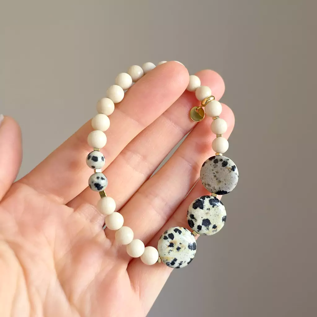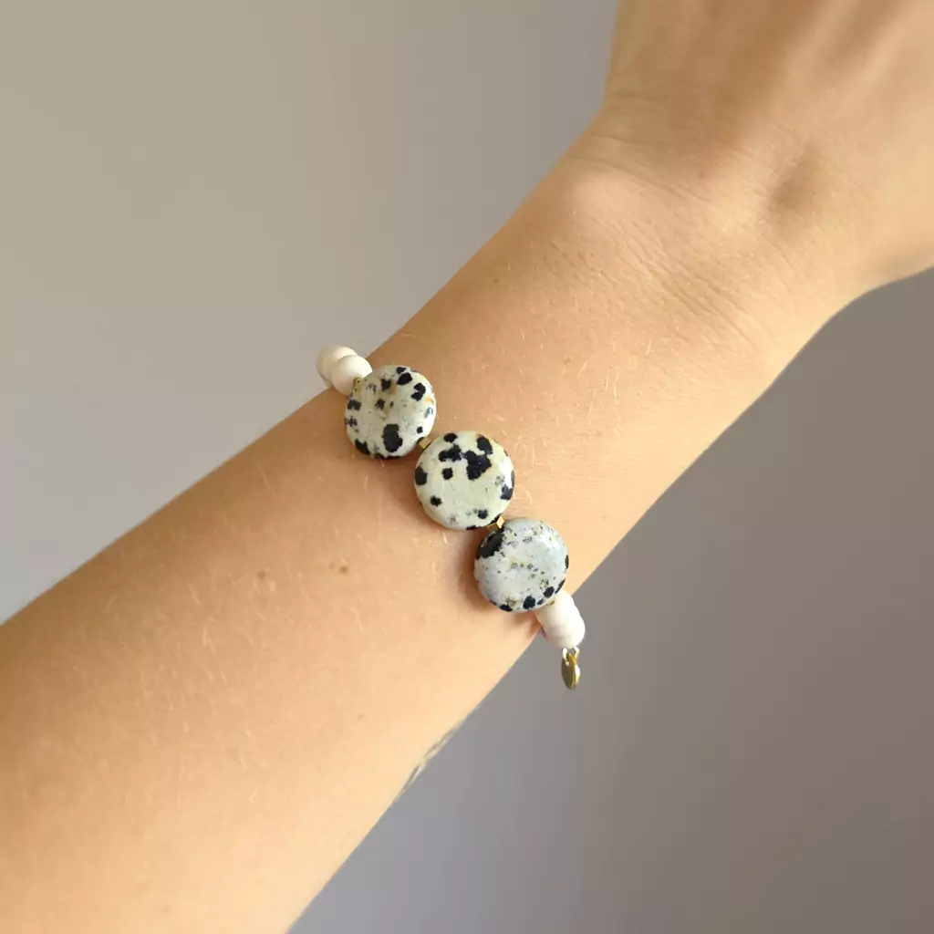 Bransoletka wykonana z kamieni naturalnych - kamienia rzecznego, jaspisu dalatyńczyka i hematytu oraz elementów metalowych z pozłacanej stali chirurgicznej.