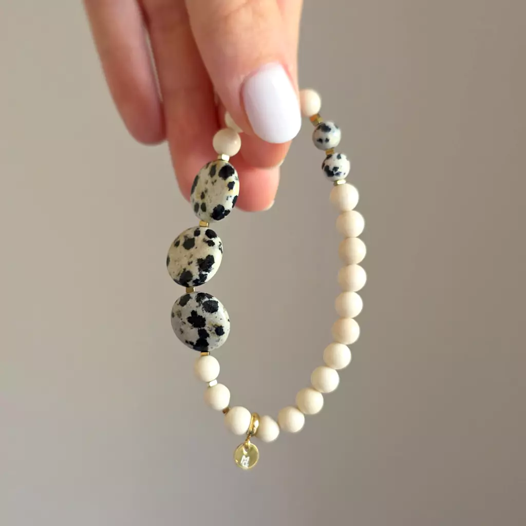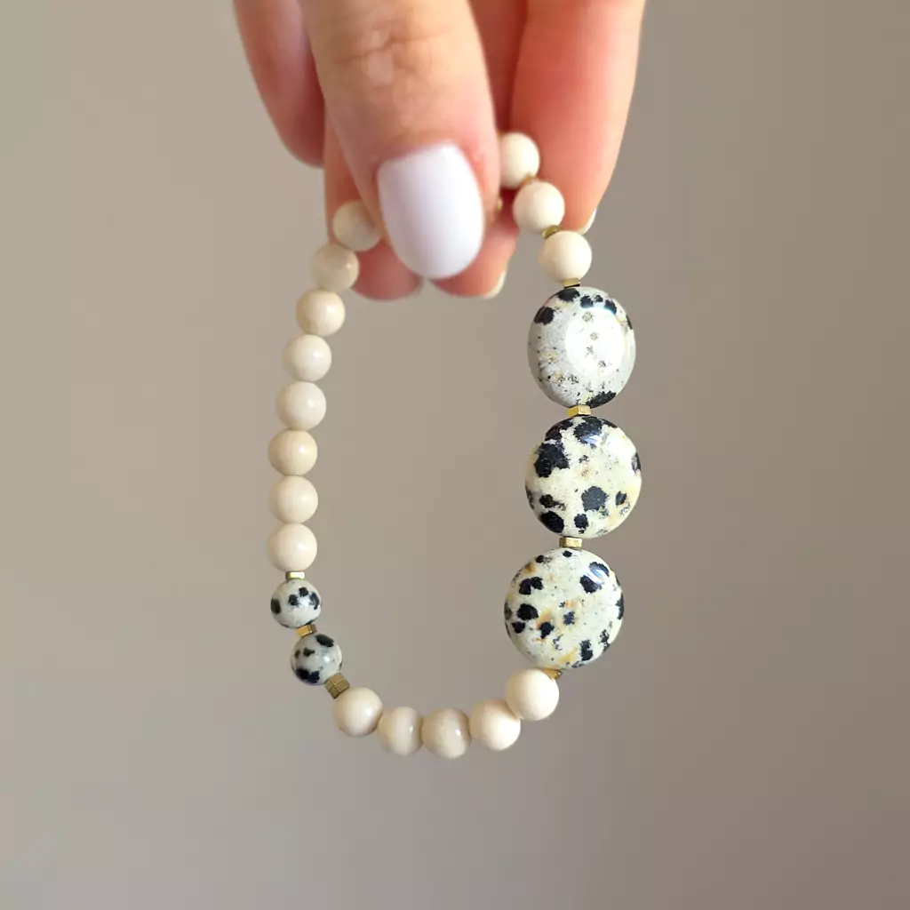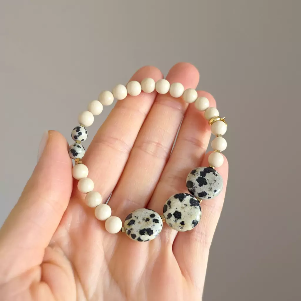 Bransoletka wykonana z kamieni naturalnych - kamienia rzecznego, jaspisu dalatyńczyka i hematytu oraz elementów metalowych z pozłacanej stali chirurgicznej.