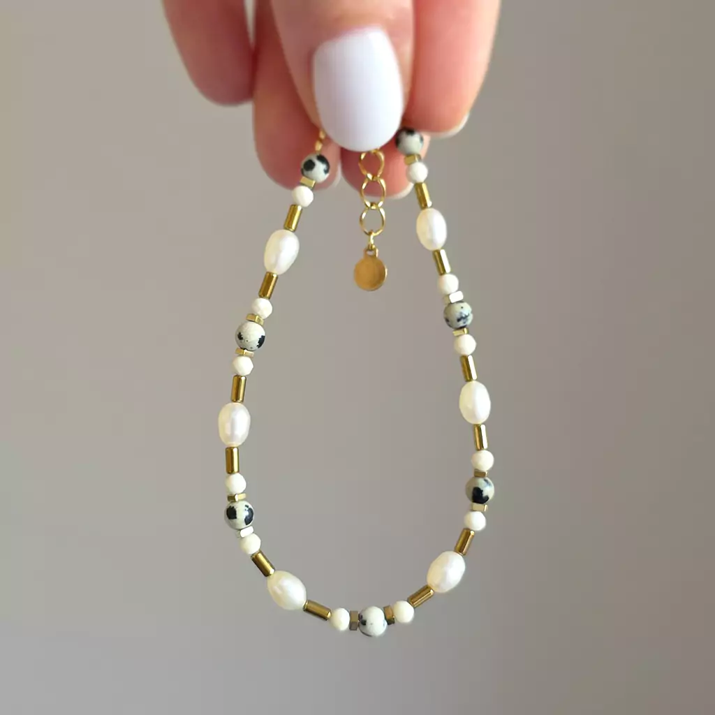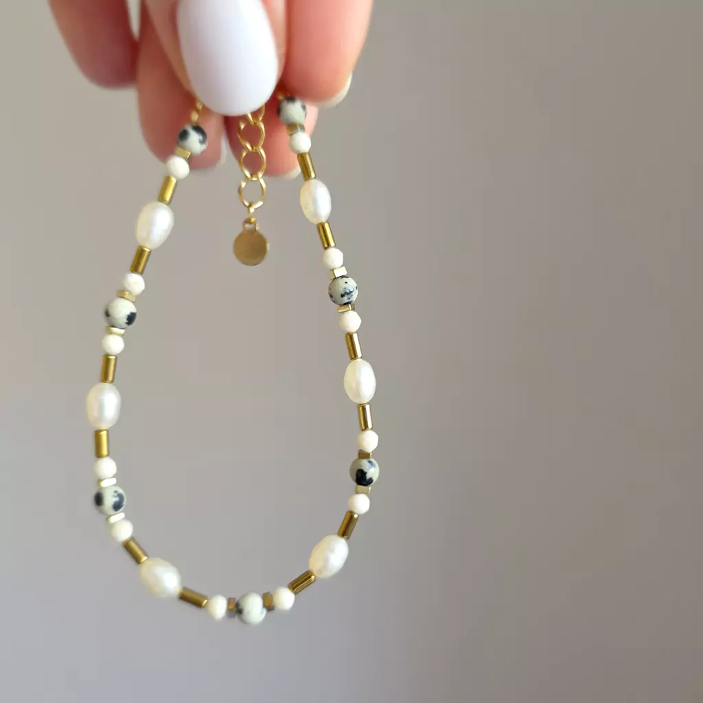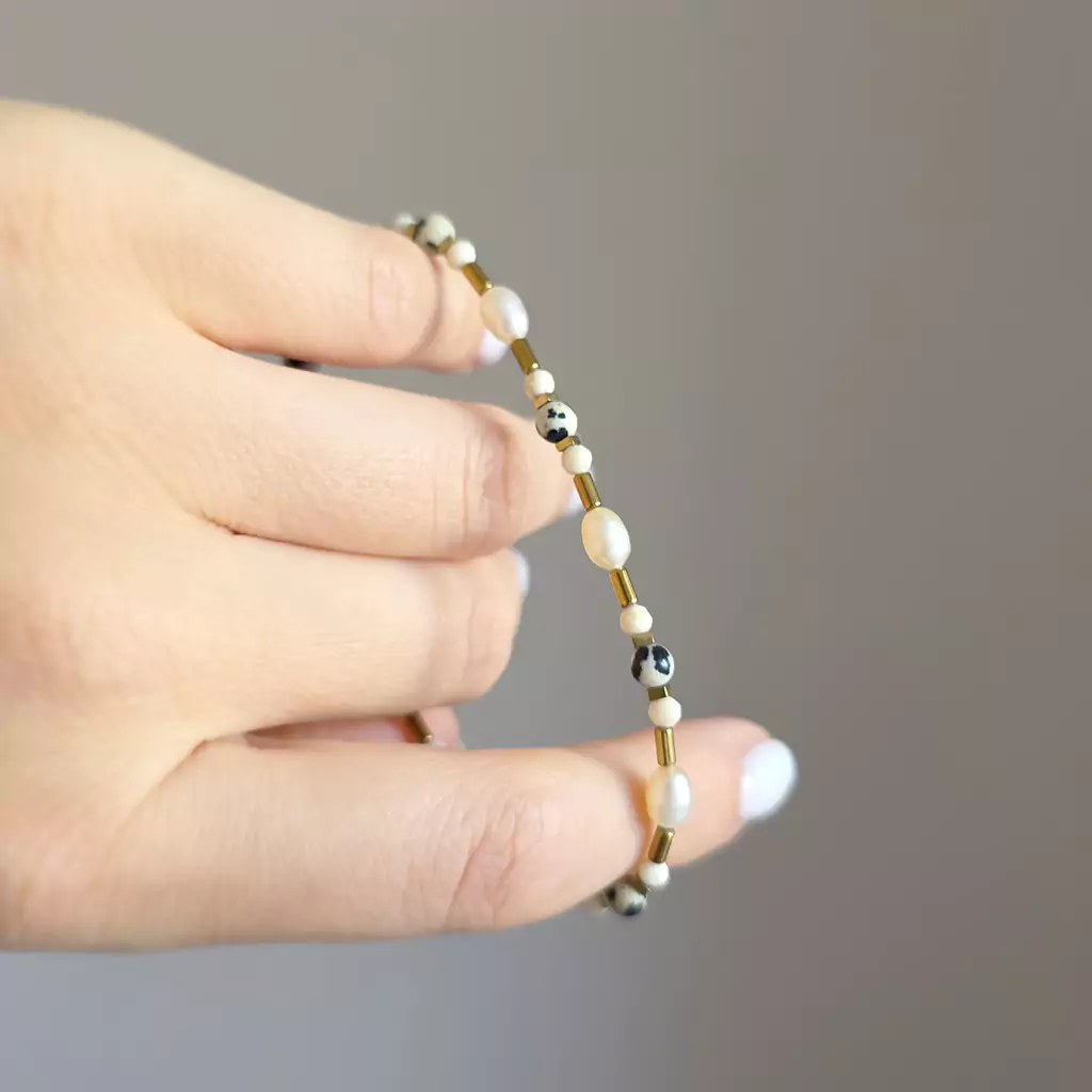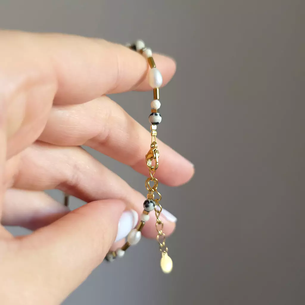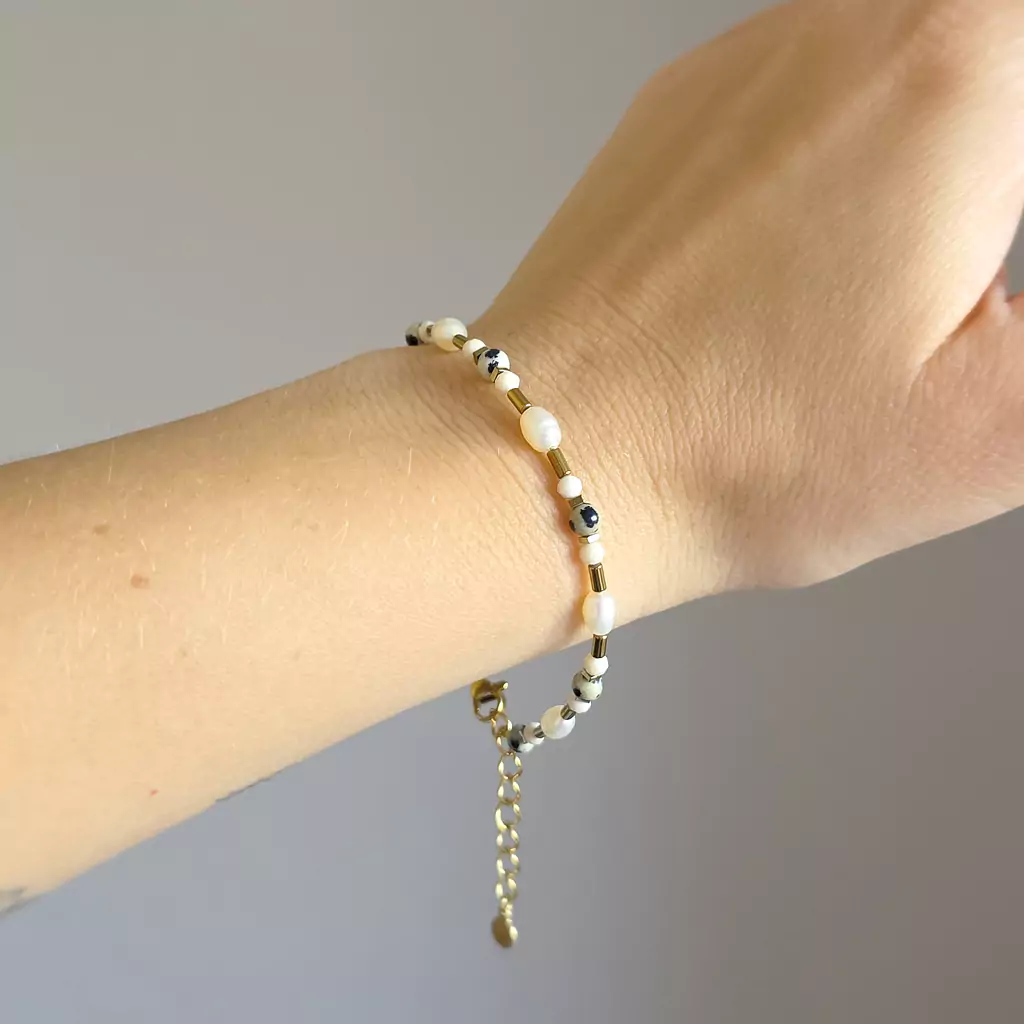 Bransoletka wykonana z pereł słodkowodnych i kamieni naturalnych - kamienia rzecznego, jaspisu dalatyńczyka i hematytu oraz elementów metalowych z pozłacanej stali chirurgicznej.