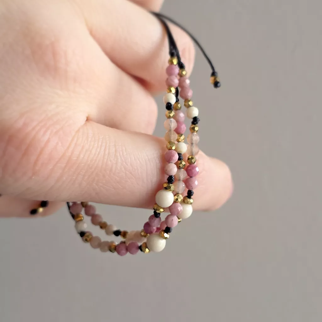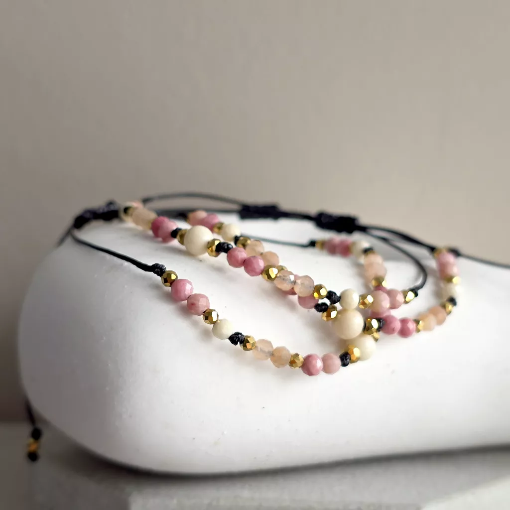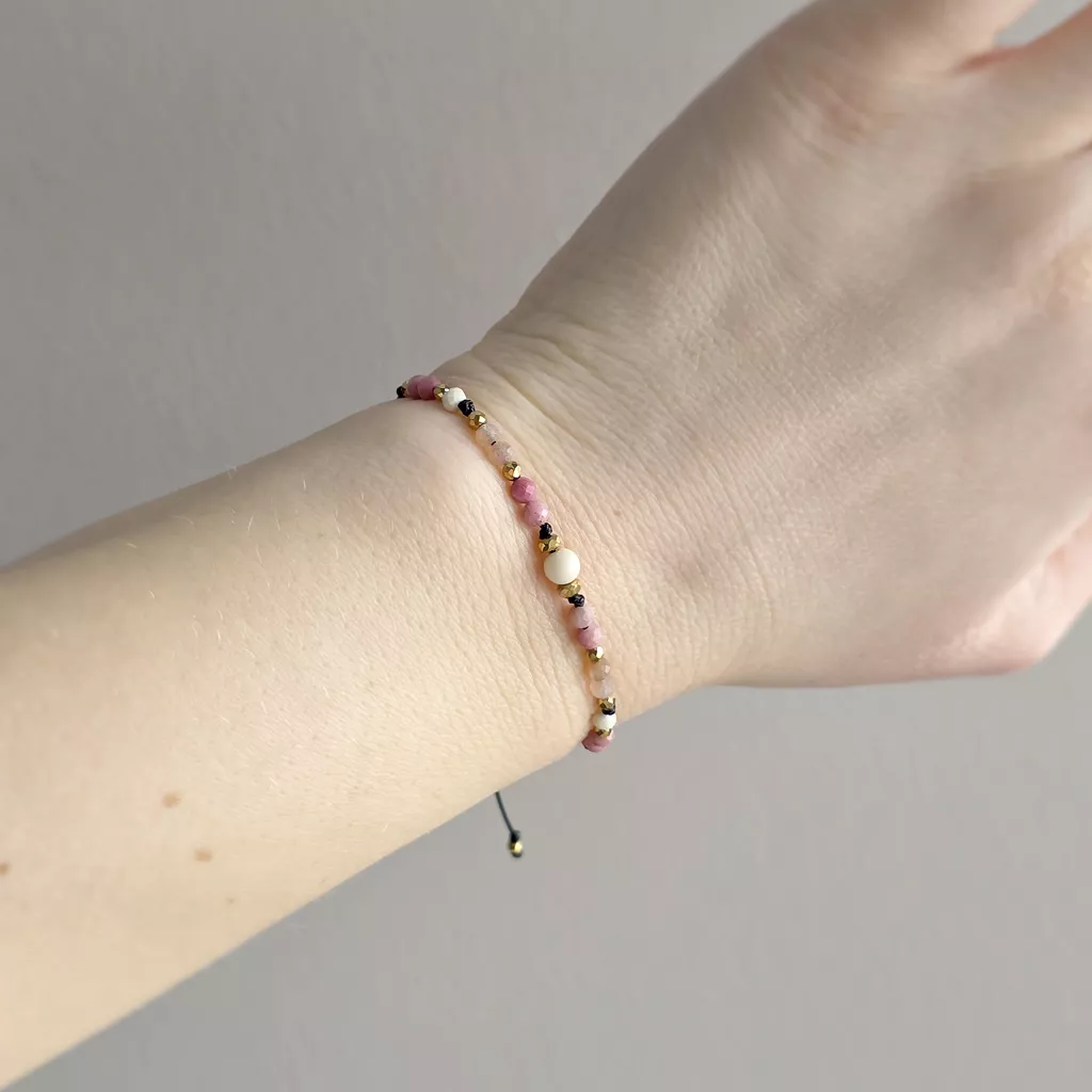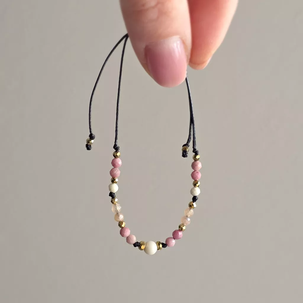 Bransoletka wykonana z kamieni naturalnych - kamienia rzecznego, rodonitu, kamienia słonecznego i hematytu oraz poliestrowego sznureczka.