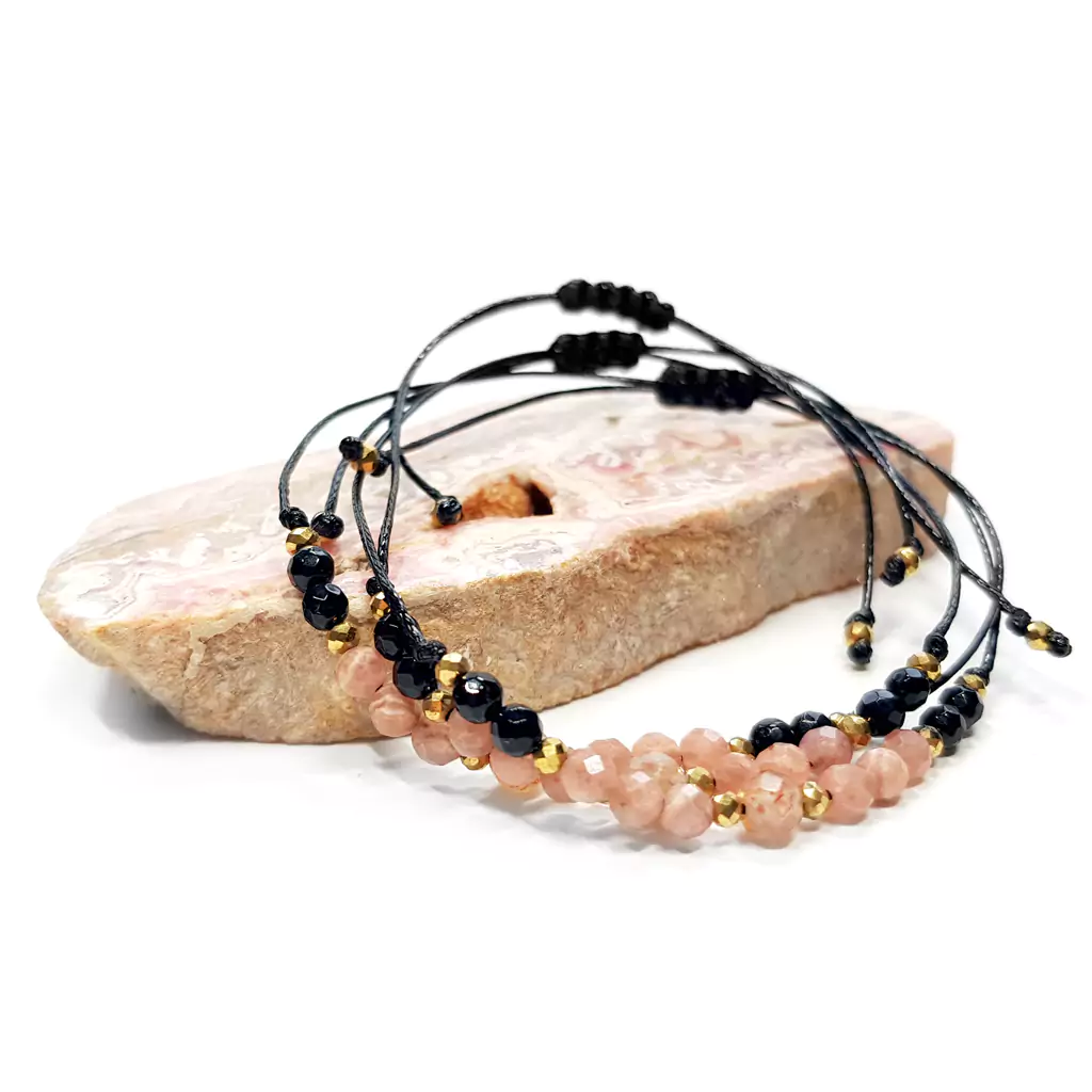 Bransoletka kamień słoneczny, rodochrozyt, czarny turmalin i hematyt na czarnym sznurku