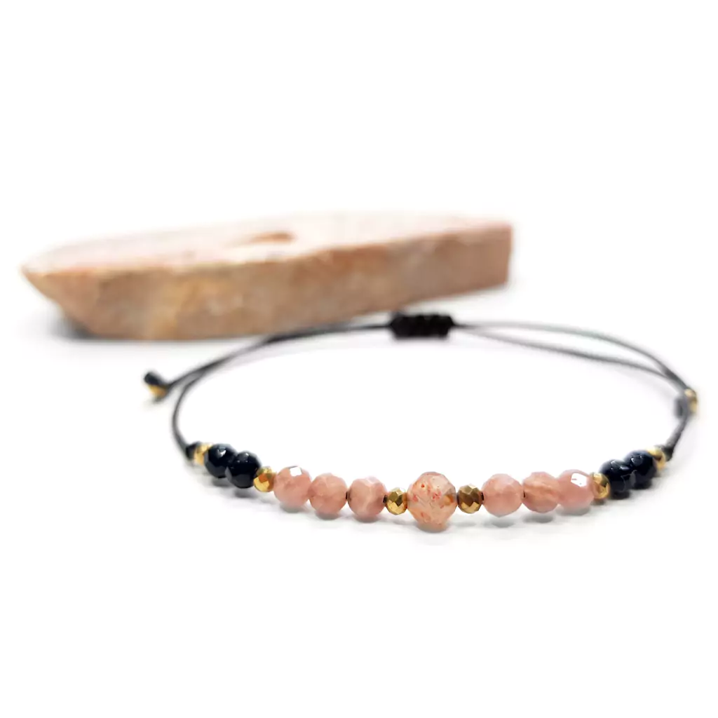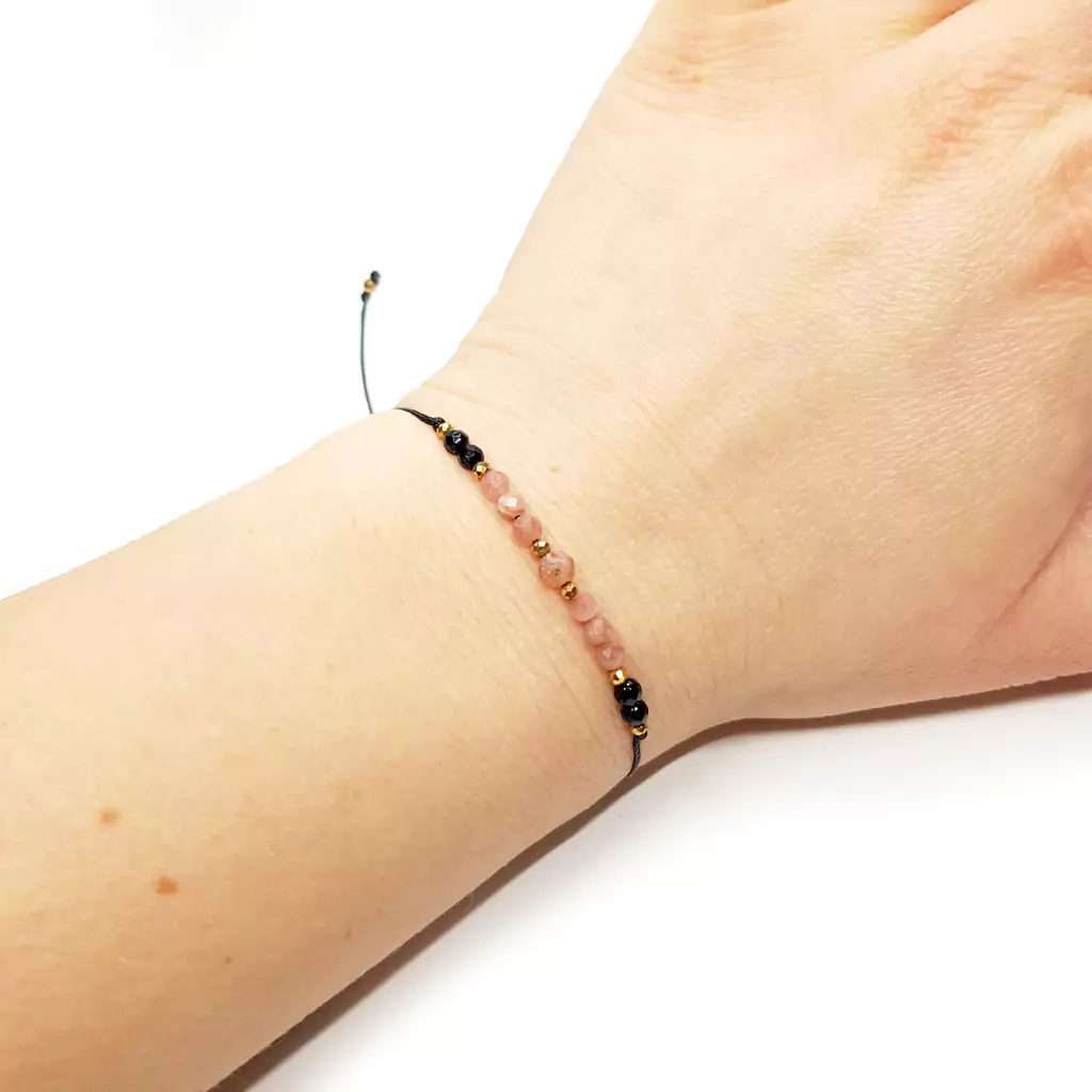 Bransoletka wykonana z kamieni naturalnych - kamienia słonecznego, rodochrozytu, czarnego turmalinu i hematytu oraz nylonowego sznureczka.