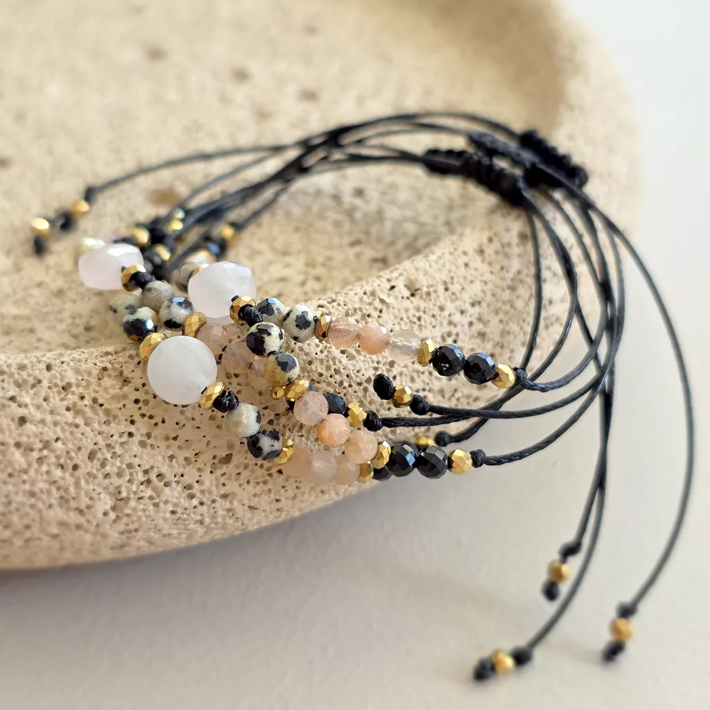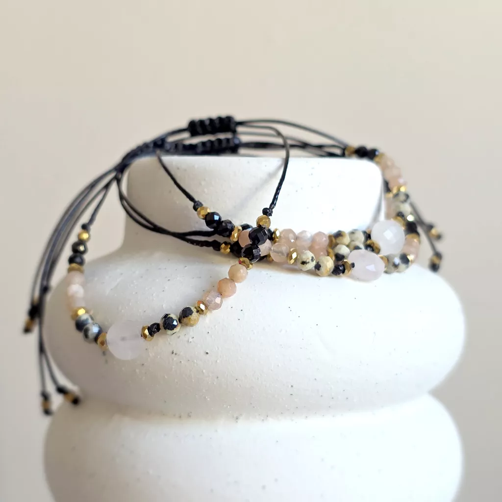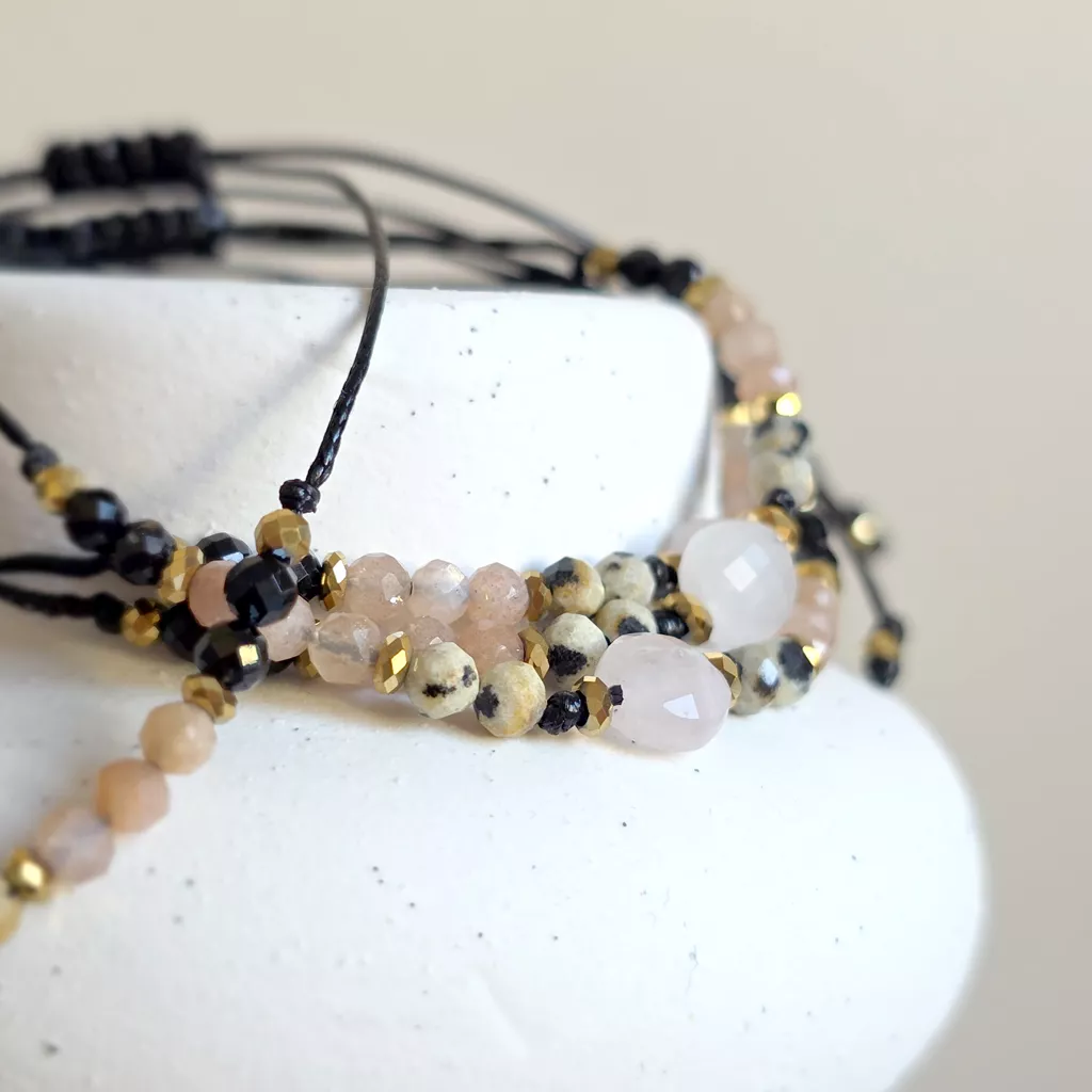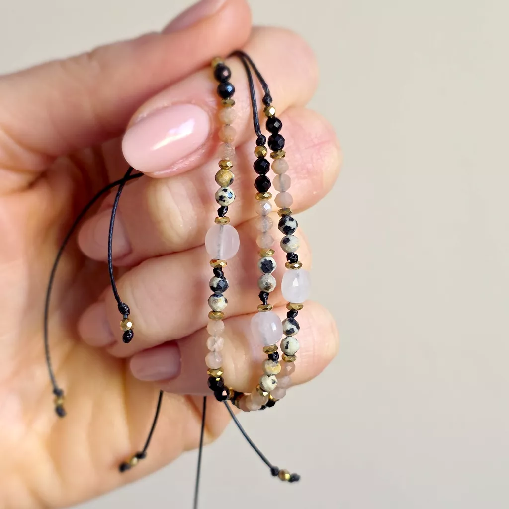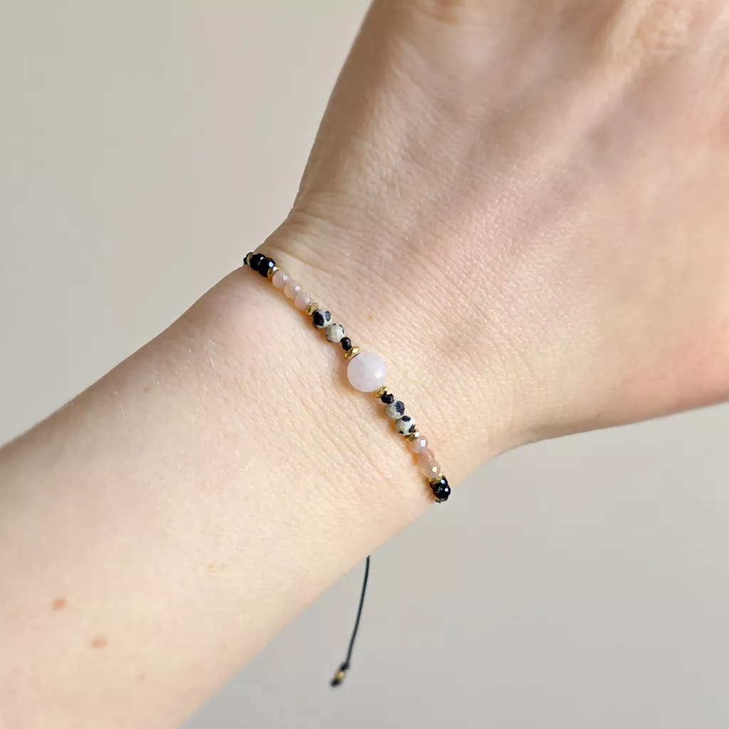 Ta bransoletka z naturalnych kamieni to harmonijne połączenie miękkości, światła i ochrony. Kompozycja kwarcu różowego, jaspisu dalmatyńskiego, kamienia słonecznego, czarnego turmalinu i hematytu tworzy wyważoną energię – ciepłą, ale jednocześnie stabilną i uziemiającą.