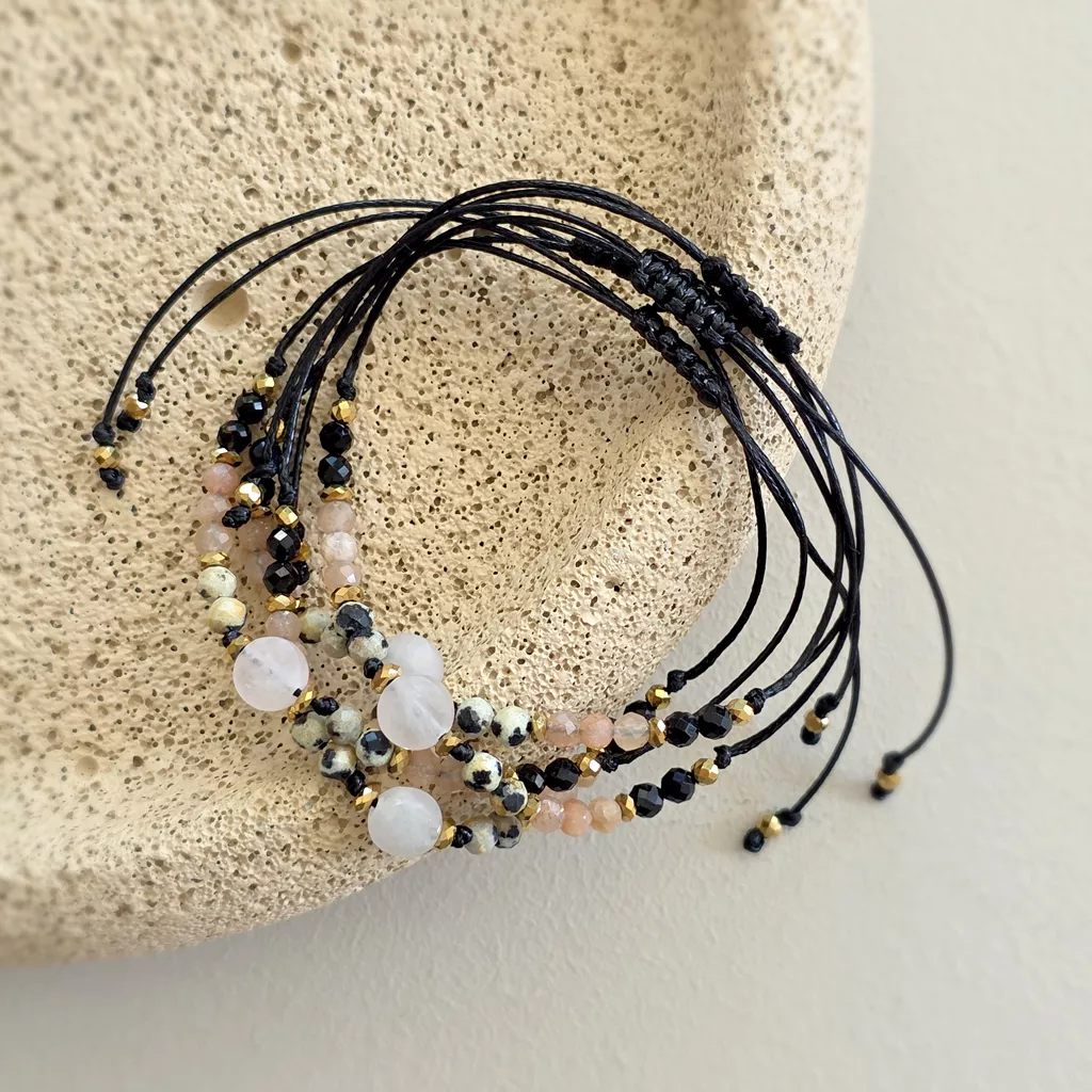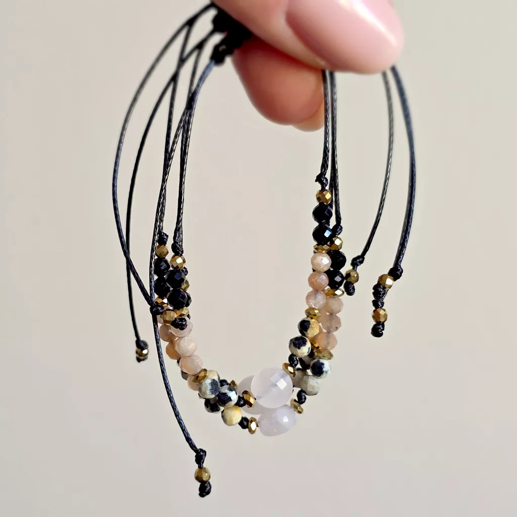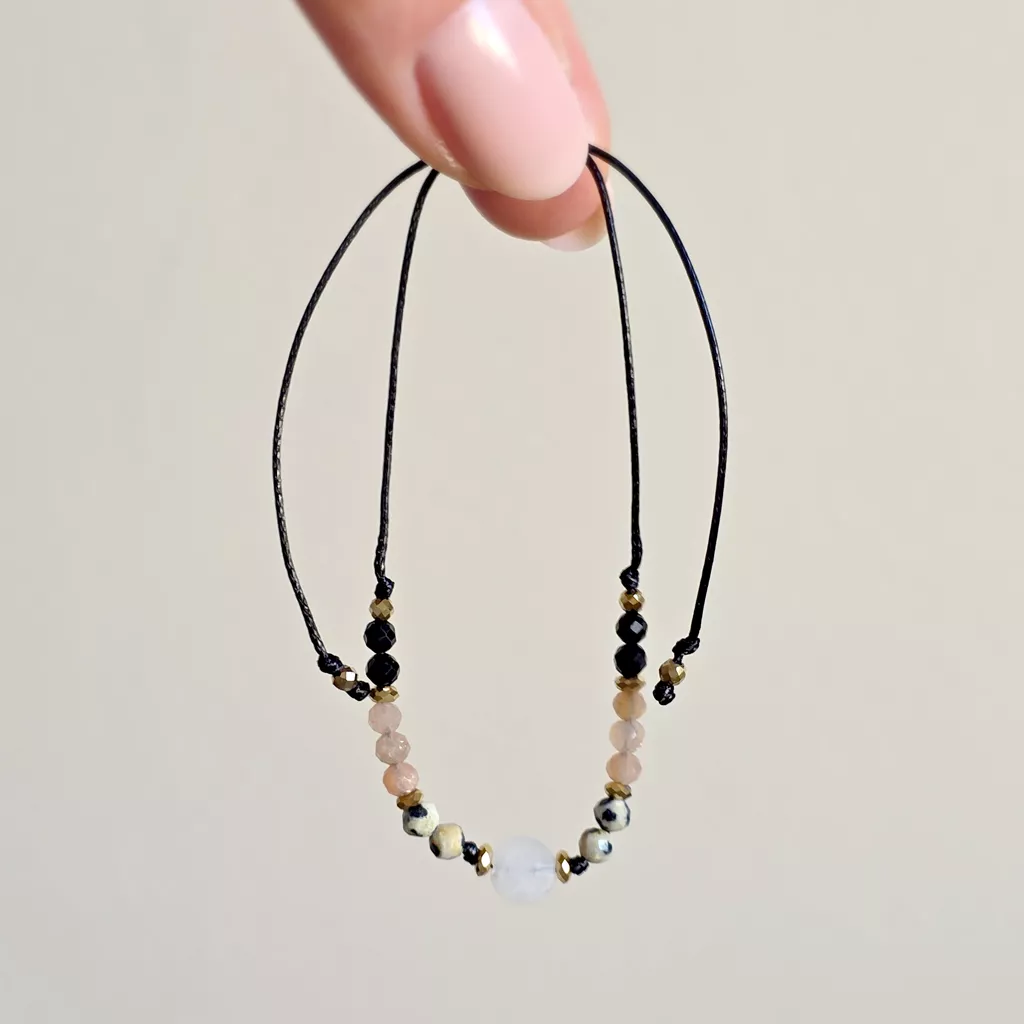Osadzona na czarnym sznurku, zyskuje elegancki, minimalistyczny charakter. Kontrast pomiędzy jasnymi, ciepłymi kamieniami a głęboką czernią podkreśla ich naturalne piękno i nadaje całości wyrazistości.