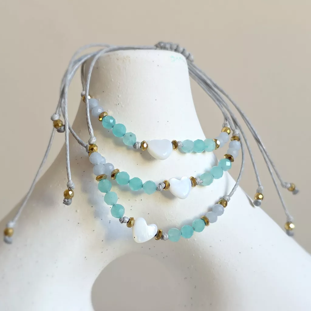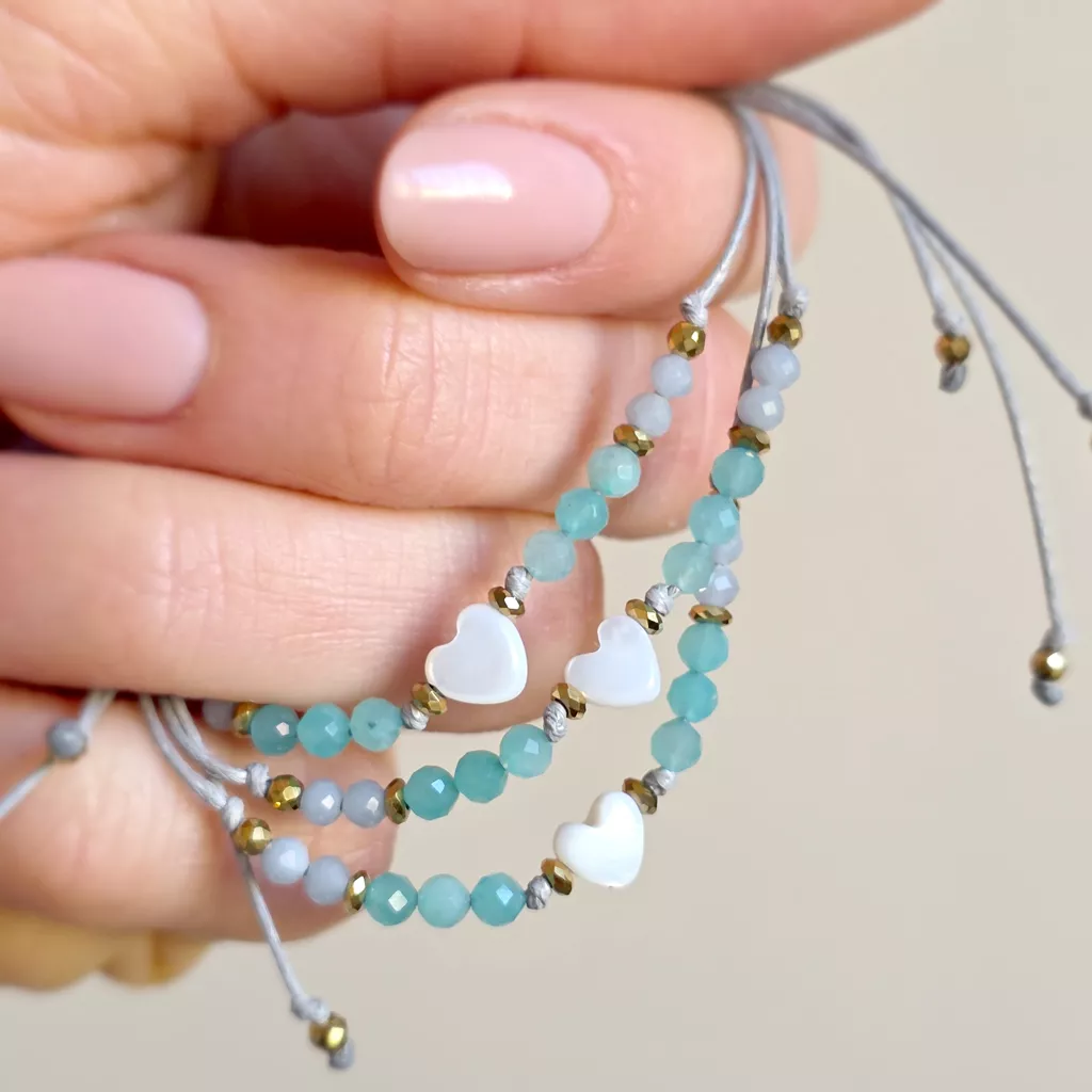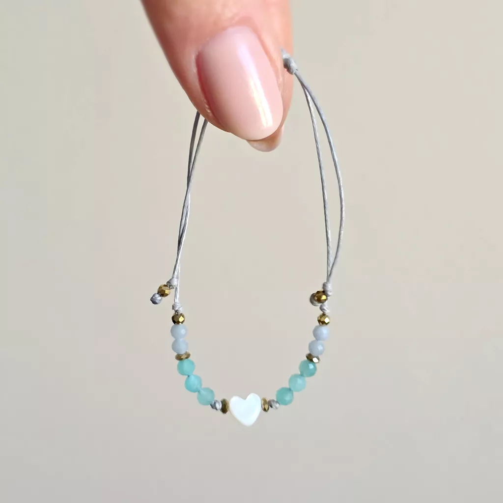 Centralnym elementem jest koralik w kształcie serca wykonany z masy perłowej, umieszczony w samym środku bransoletki. To symbol czułości, delikatności i relacji z samą sobą – miękki, ale bardzo obecny akcent.