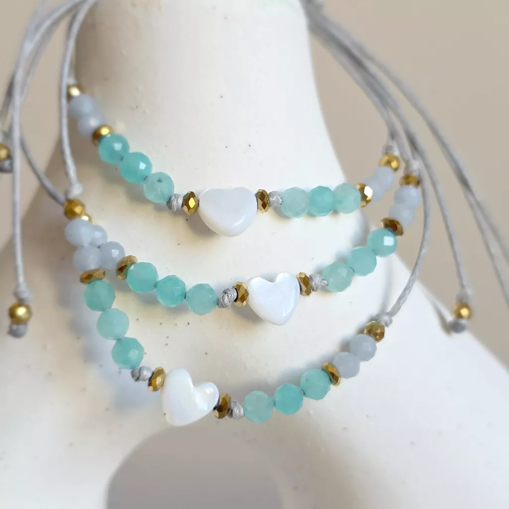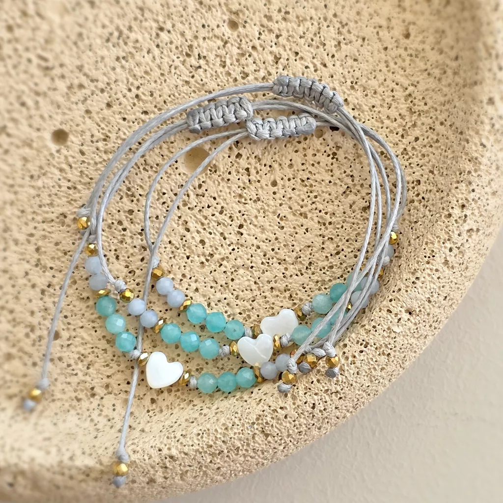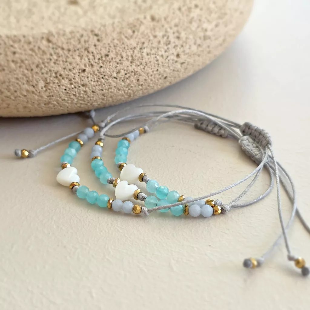 Centralnym elementem jest koralik w kształcie serca wykonany z masy perłowej, umieszczony w samym środku bransoletki. To symbol czułości, delikatności i relacji z samą sobą – miękki, ale bardzo obecny akcent.