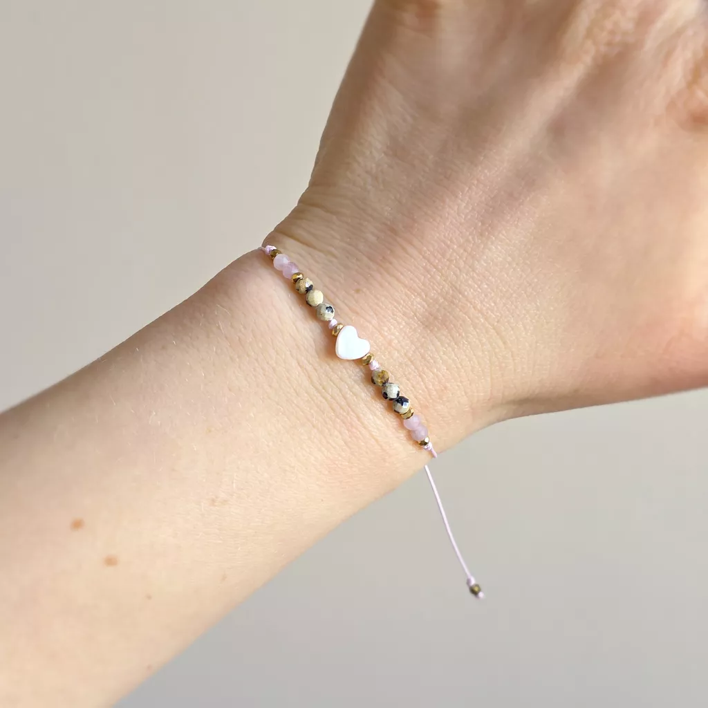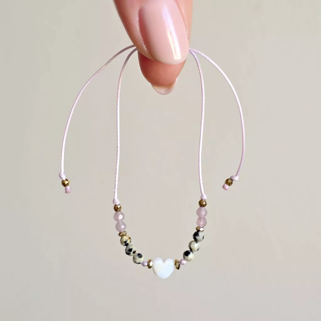 Centralnym akcentem jest masa perłowa w kształcie serca – symbol bliskości, czułości i relacji z samą sobą. To bransoletka, która wspiera łagodność, równowagę emocjonalną i świadome bycie w swojej energii.