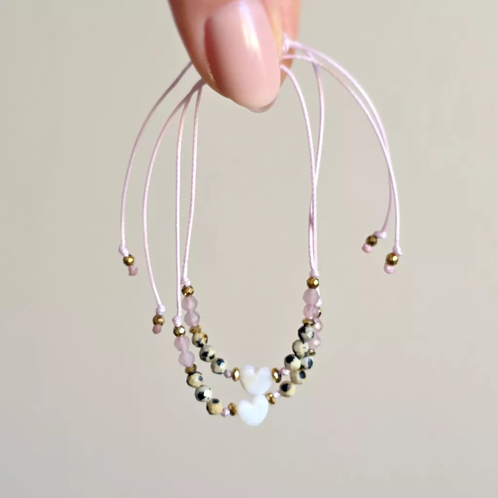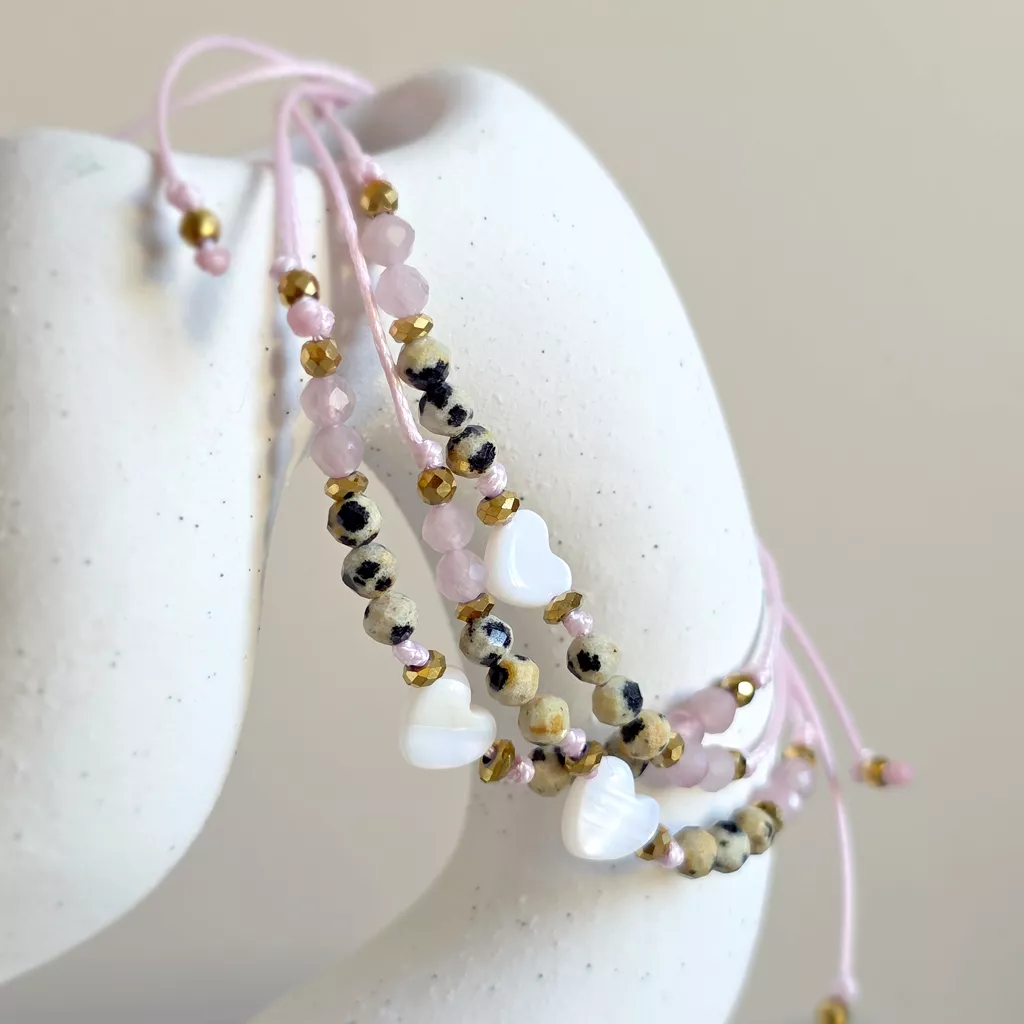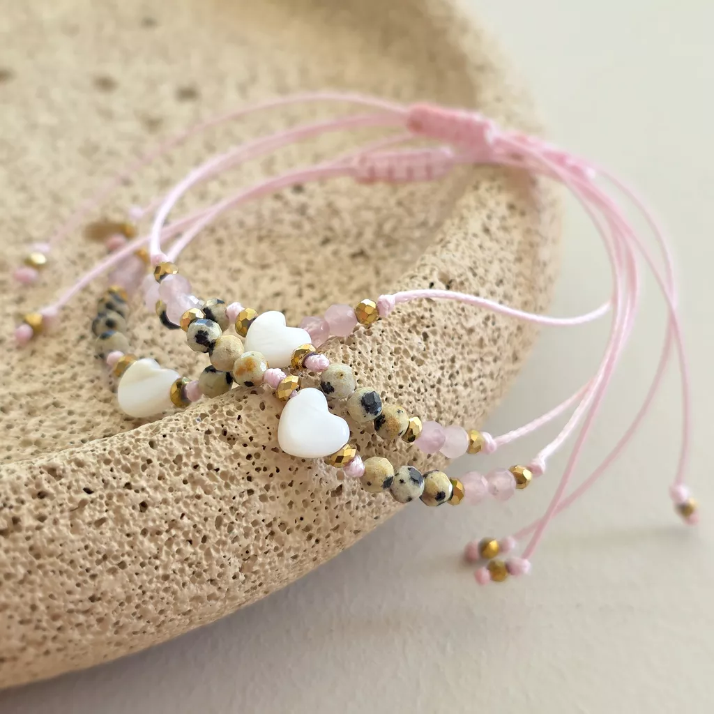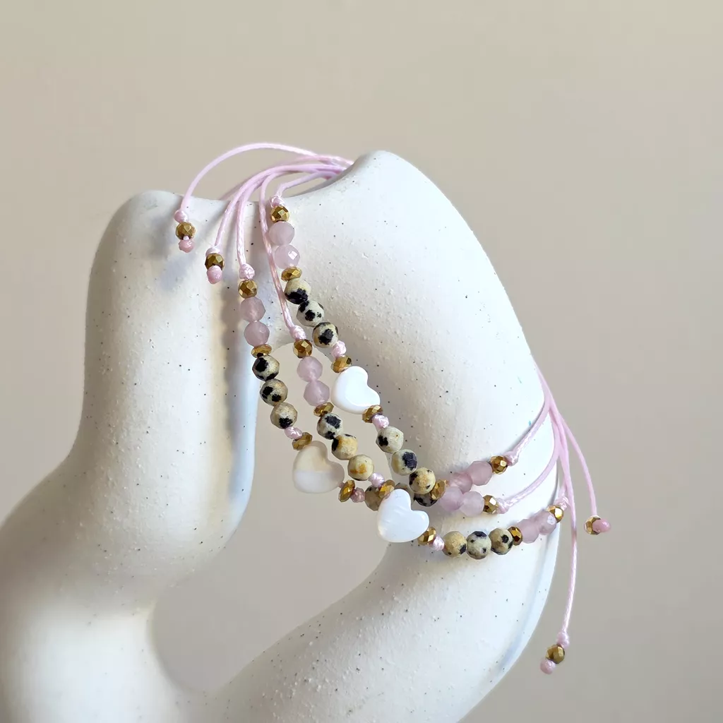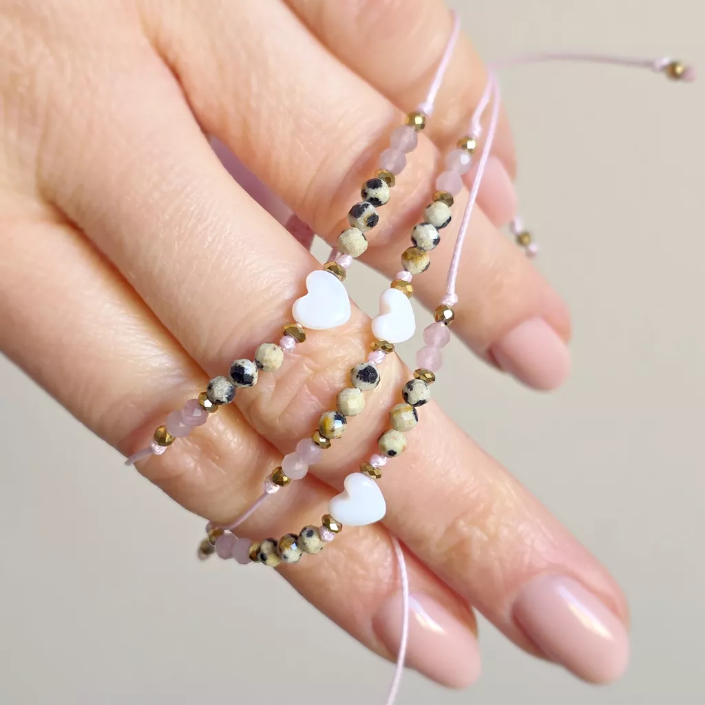 Delikatna, kobieca bransoletka z masy perłowej, jaspisu dalmatyńskiego, kwarcu różowego i hematytu to subtelne połączenie miękkości, lekkości i stabilności. Całość została osadzona na różowym sznurku, który podkreśla romantyczny charakter biżuterii i pięknie współgra z naturalnymi barwami kamieni.