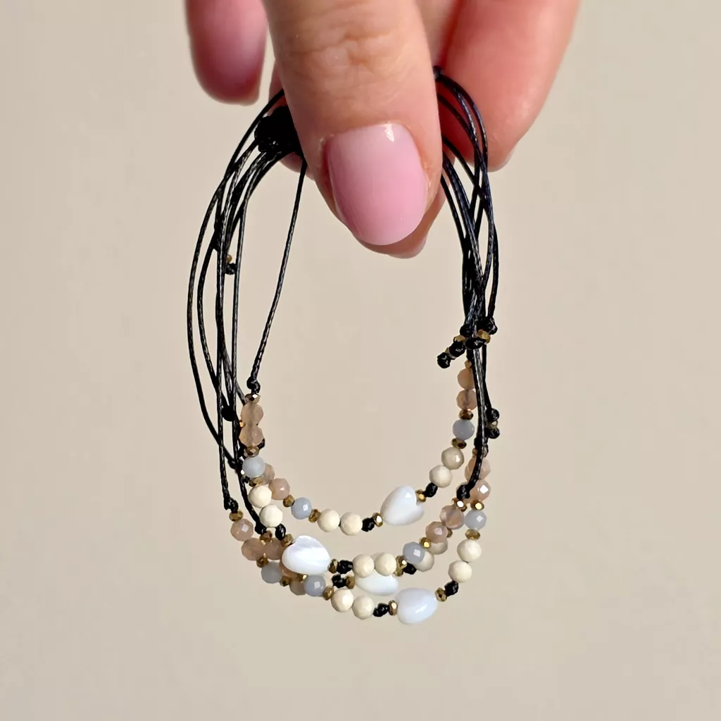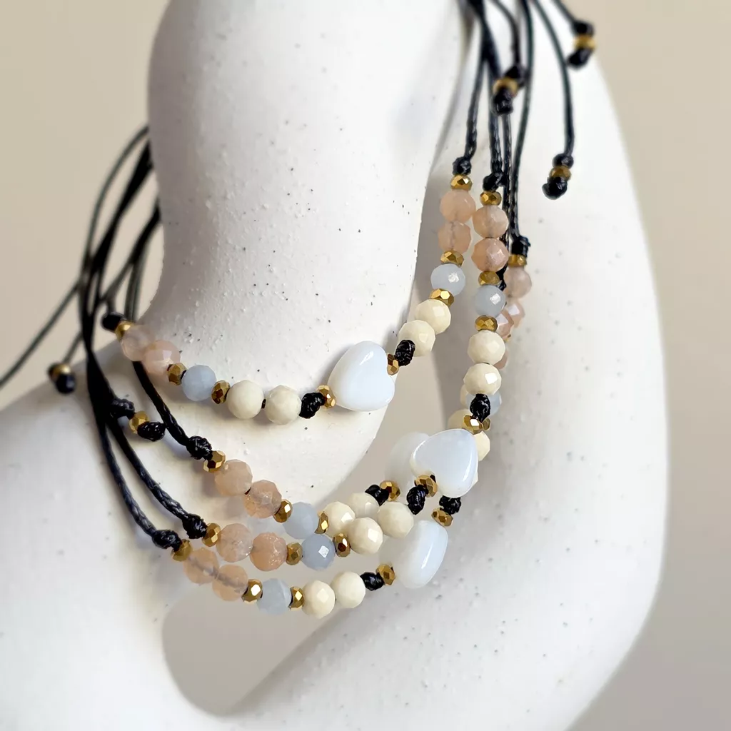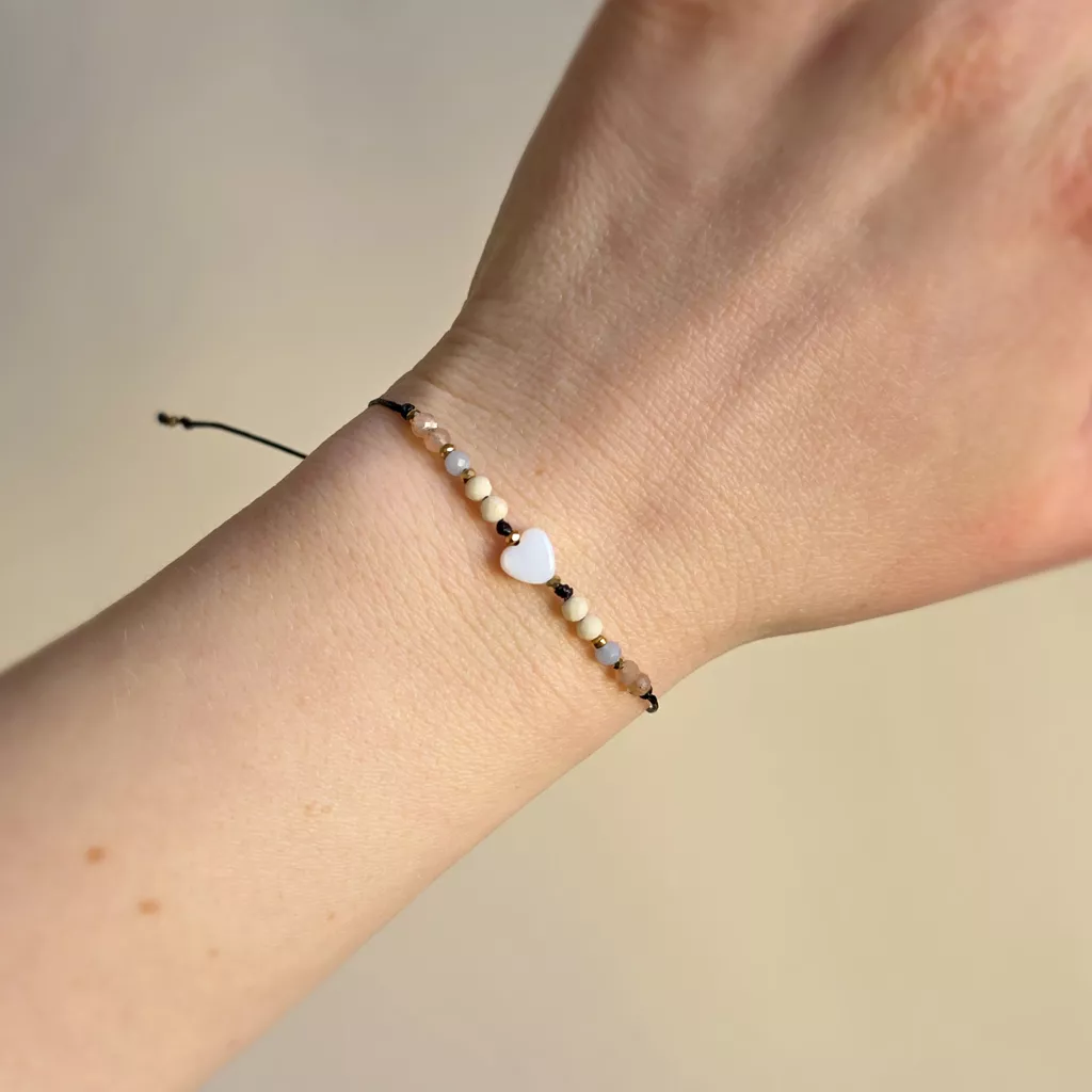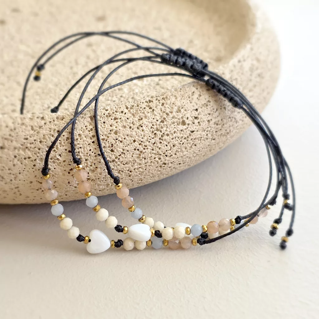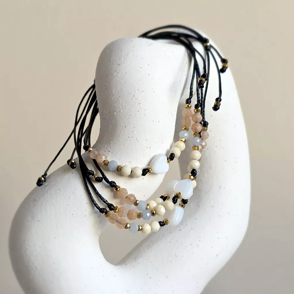 Bransoletka na delikatnym, czarnym sznurku została utrzymana w stonowanej, pastelowej kolorystyce. W centralnej części kompozycji znajduje się niewielkie serduszko z masy perłowej o subtelnym, mlecznym połysku. Po obu stronach ułożyłam drobne kamienie (ok. 3,5 mm): kamień rzeczny, angelit i kamień słoneczny. Całość dopełniają złote przekładki z hematytu, które porządkują układ i subtelnie rozświetlają całość. Zapięcie stanowi przesuwna makrama - dzięki niej dopasujesz idealnie rozmiar biżuterii do swojego nadgarstka.