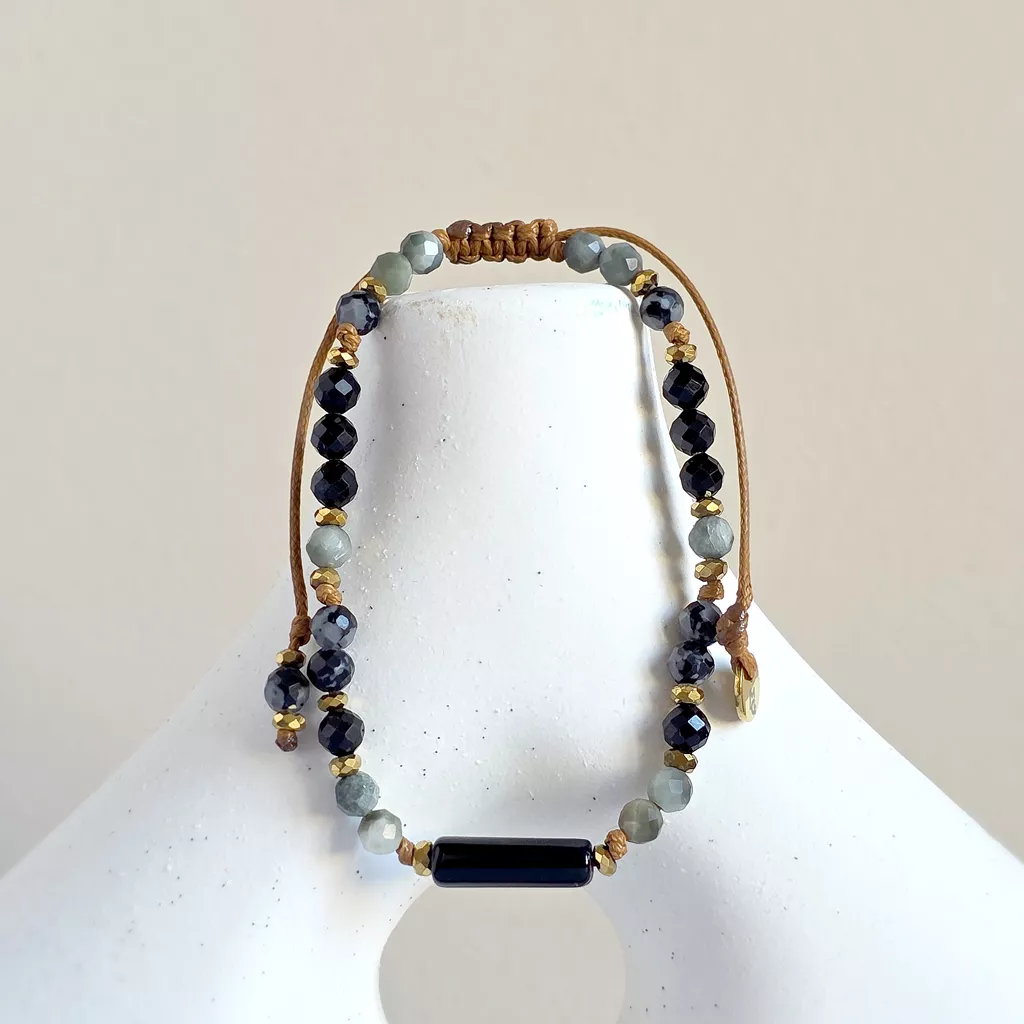 Osadzona na brązowym sznurku, bransoletka ma surowy, naturalny charakter inspirowany ziemią i pierwotną energią. Jej kolorystyka jest głęboka, stonowana i elegancka – idealna dla osób, które cenią minimalizm, ale z wyraźną mocą.