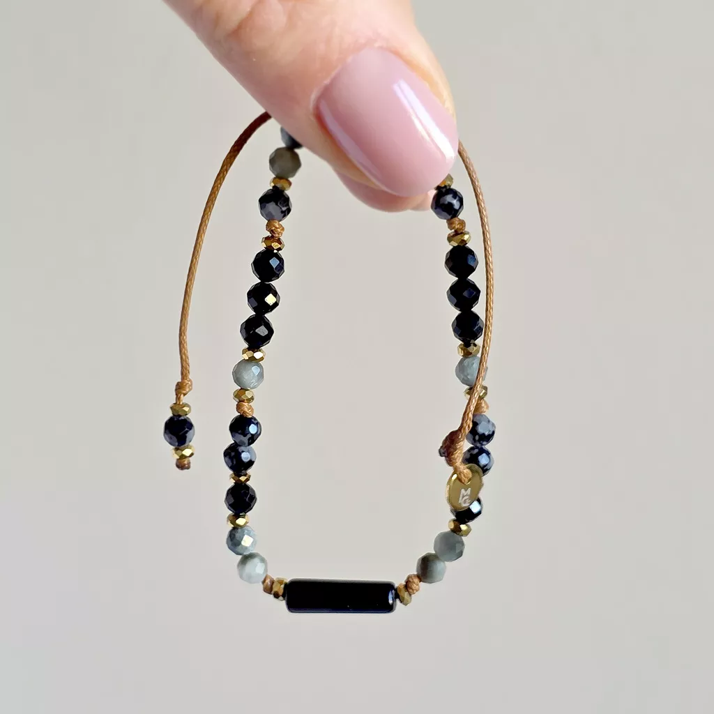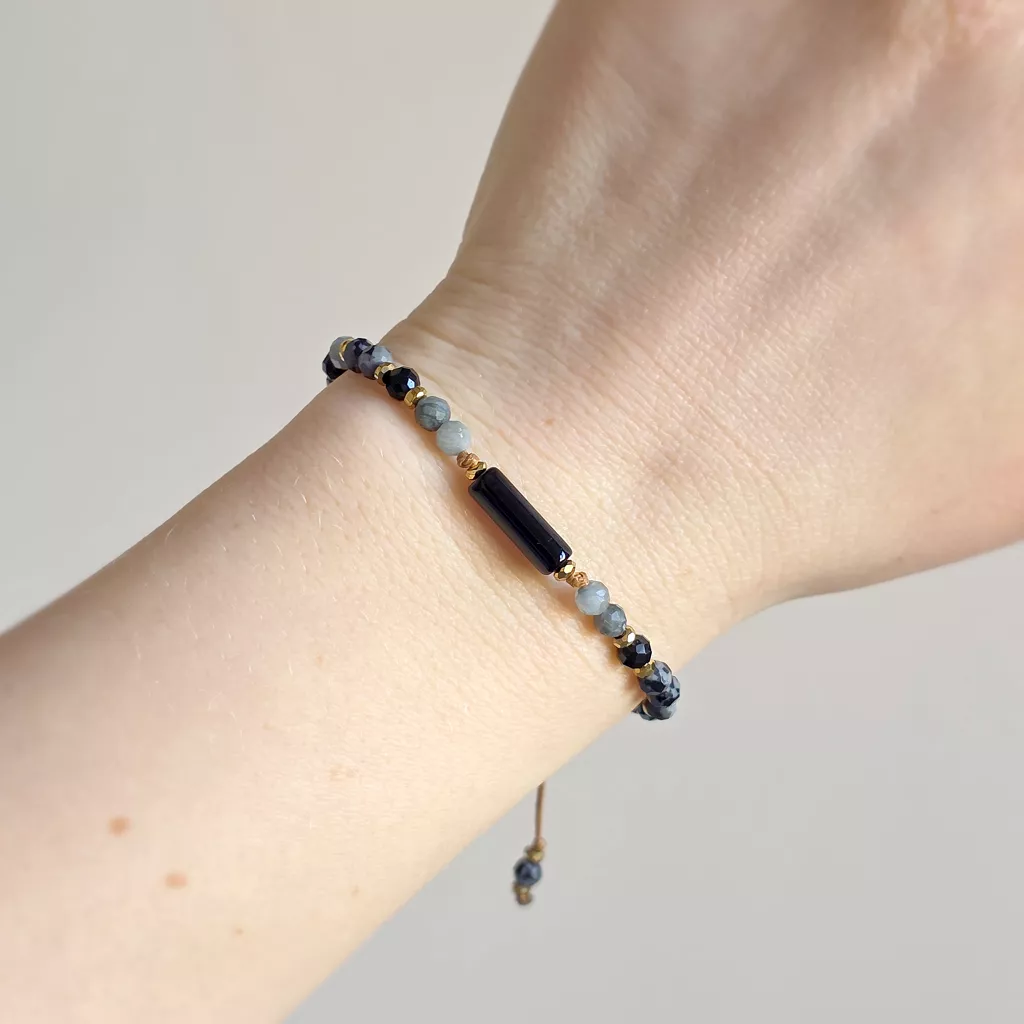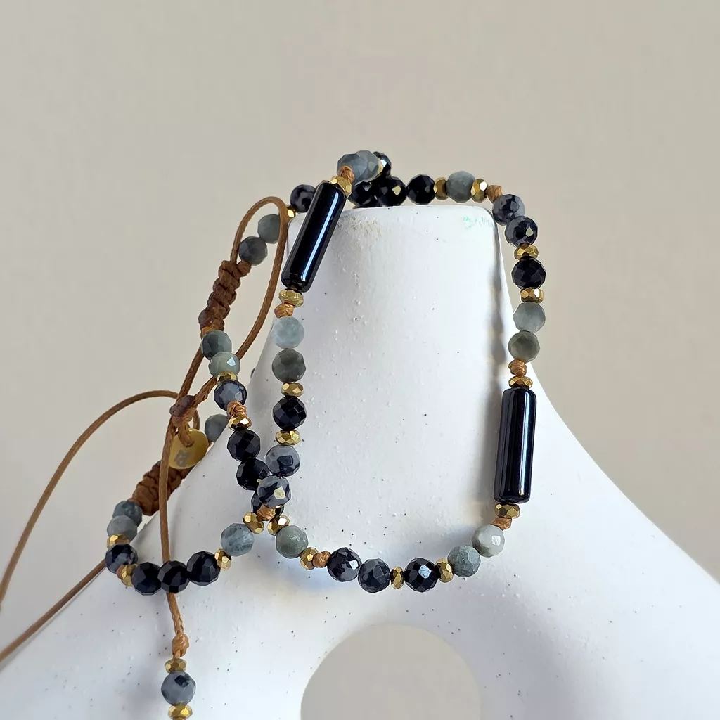 Bransoletka Fullness of Inner Guardian to mocna, ochronna kompozycja naturalnych kamieni stworzona dla osób, które chcą czuć stabilność, bezpieczeństwo i wewnętrzną siłę. Połączenie czarnego onyksu, orlego oka, obsydianu śnieżnego, czarnego turmalinu i hematytu tworzy energetyczną tarczę – spokojną, ale bardzo wyraźną.